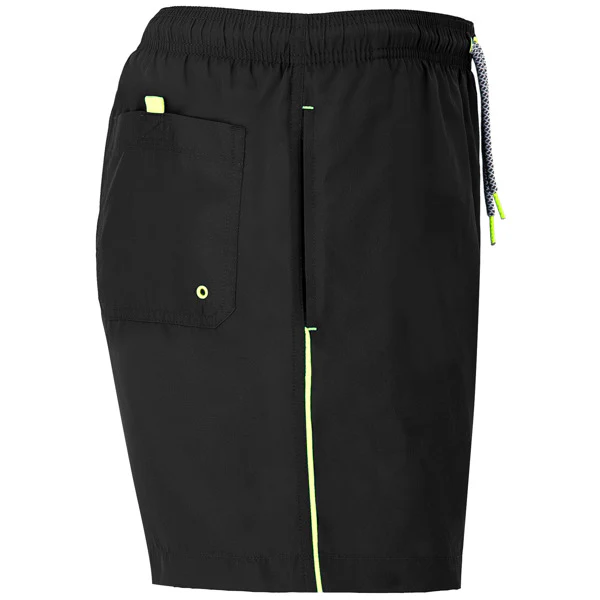 Bañador WW25NEW Negro, dos bolsillos laterales, cinturilla elástica con cordones decorativos ajustables y ojales metálicos a contraste, laterales con vivo a contraste, bolsillo trasero con ojal de desagüe.
