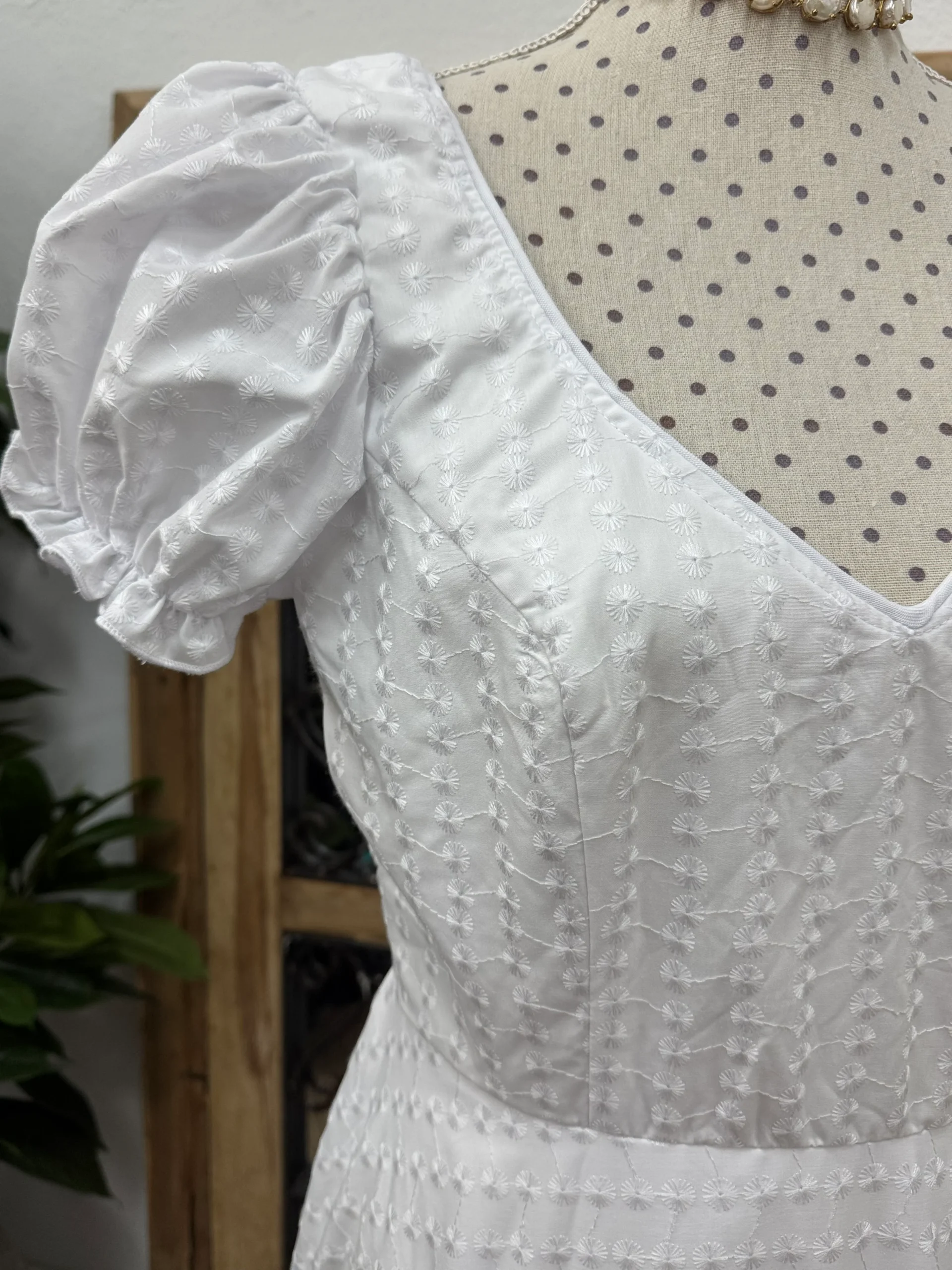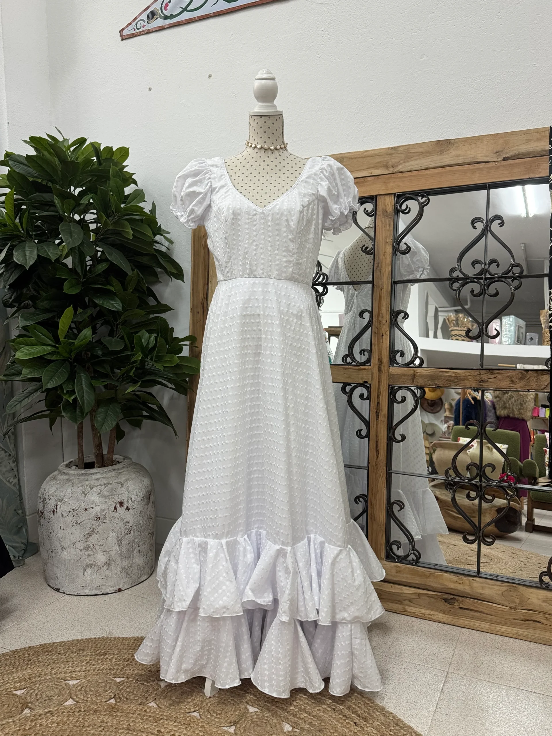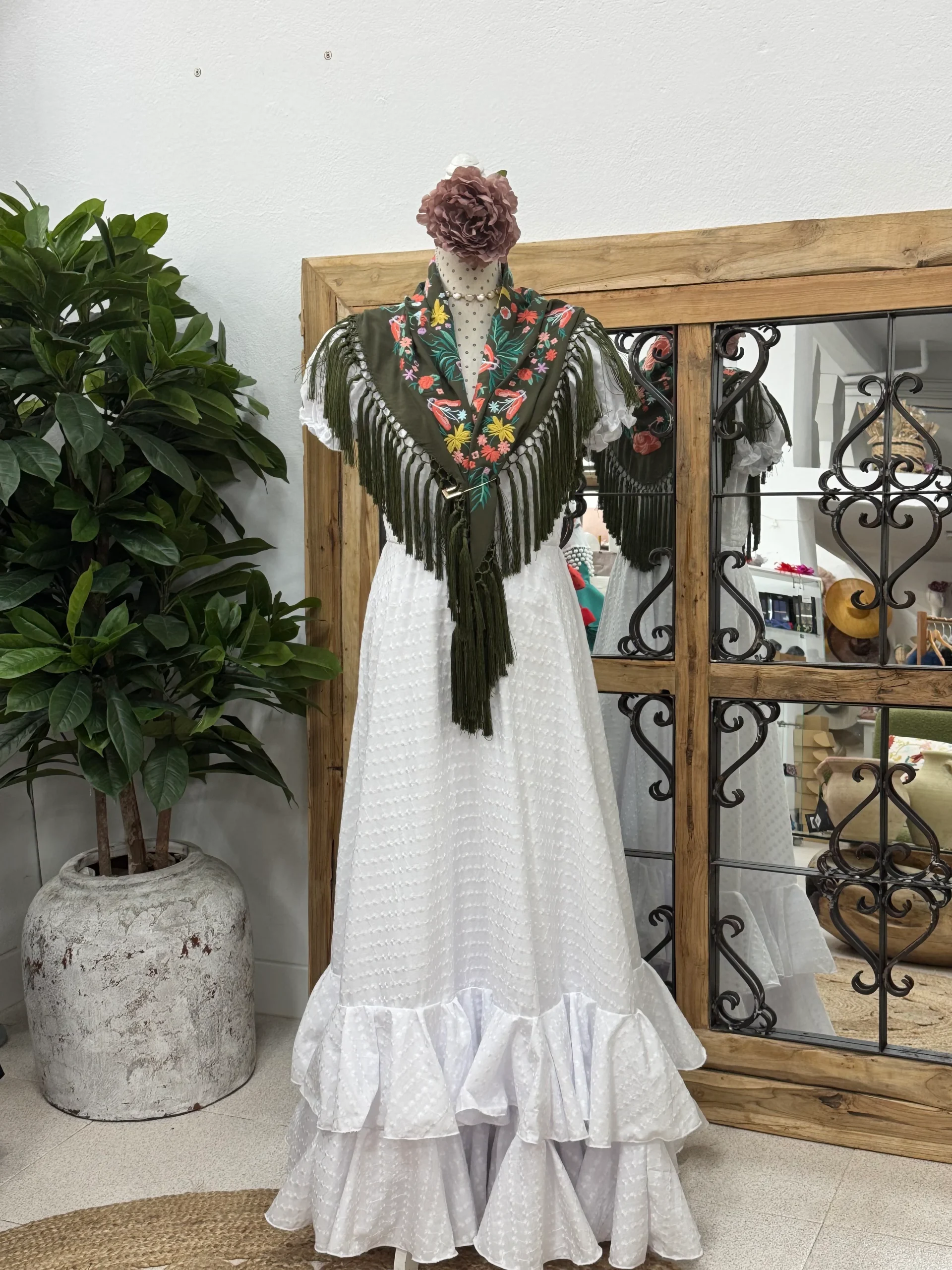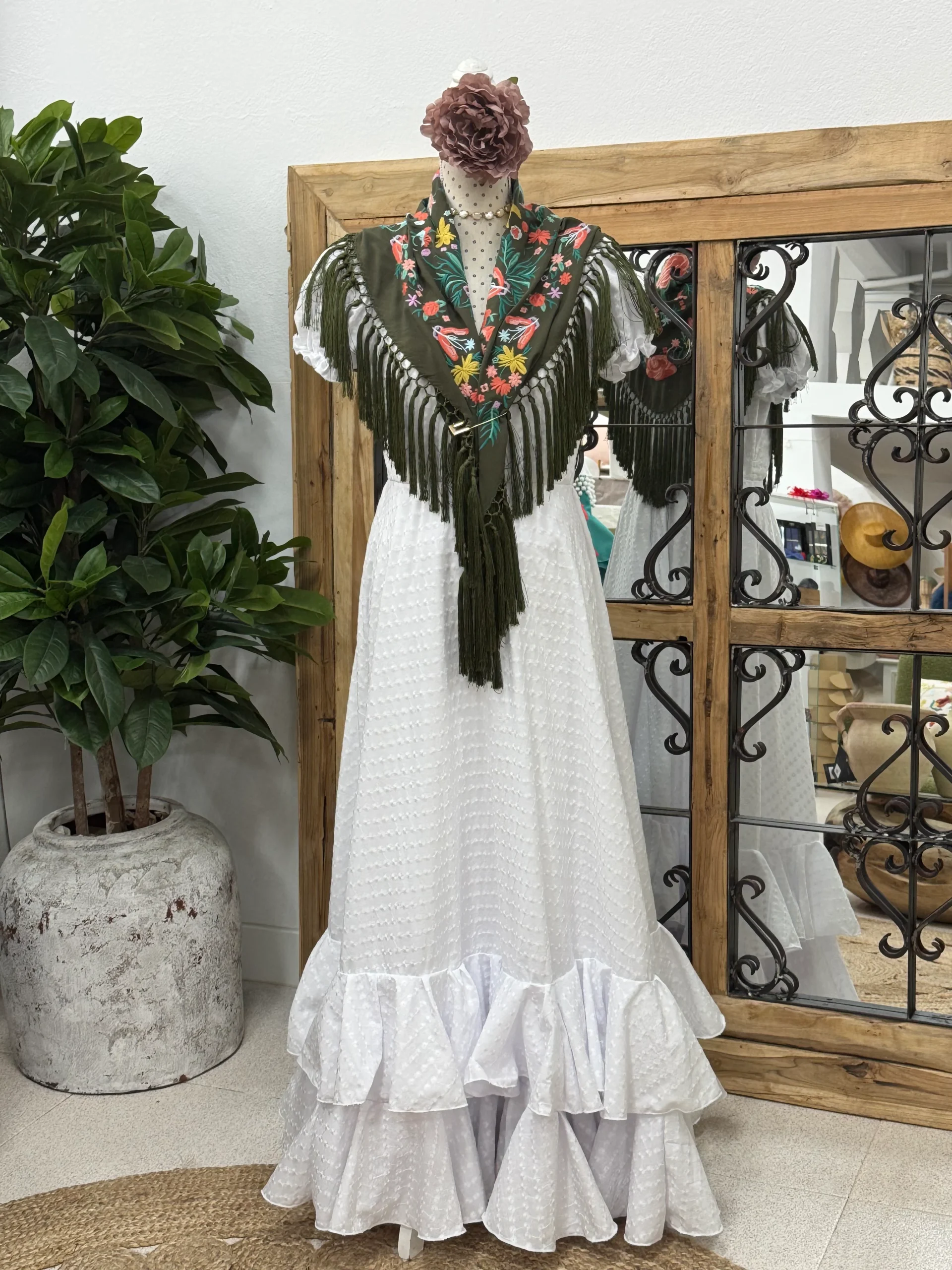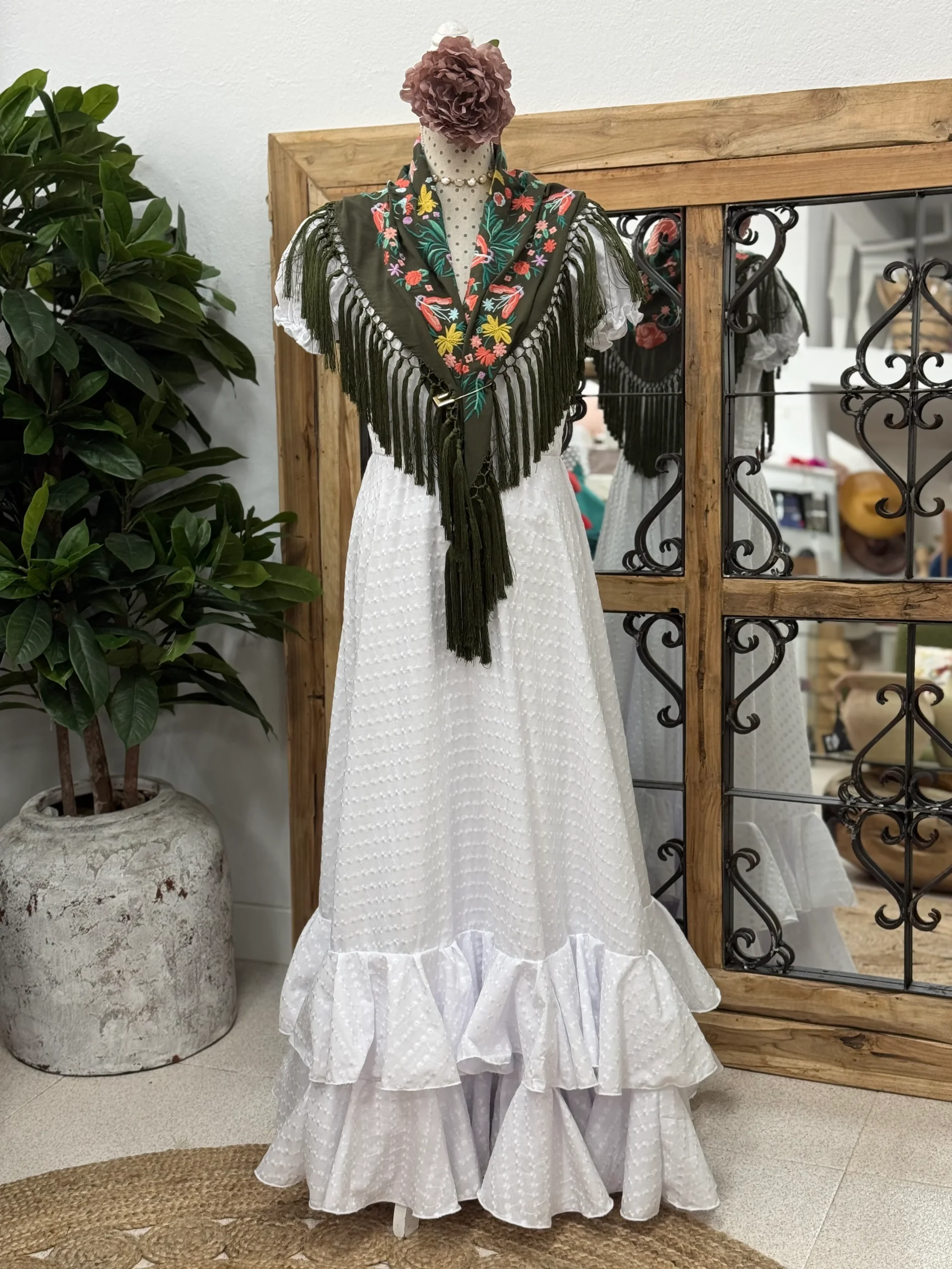 Disponible desde la Talla 36 hasta la 44. Confeccionado en Espa帽a en tejido de algod贸n perforado, cuerpo forrado en algod贸n . Lleva enaguas y bolsillo.