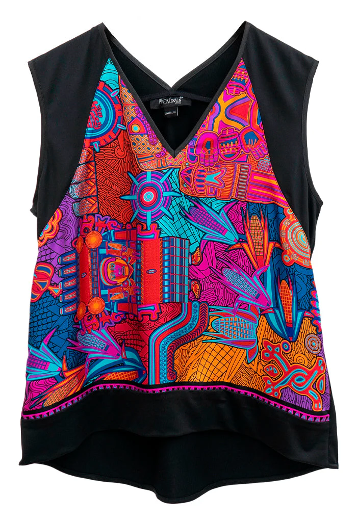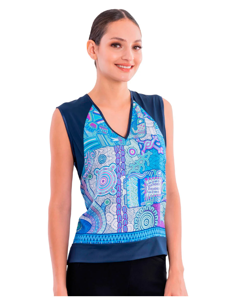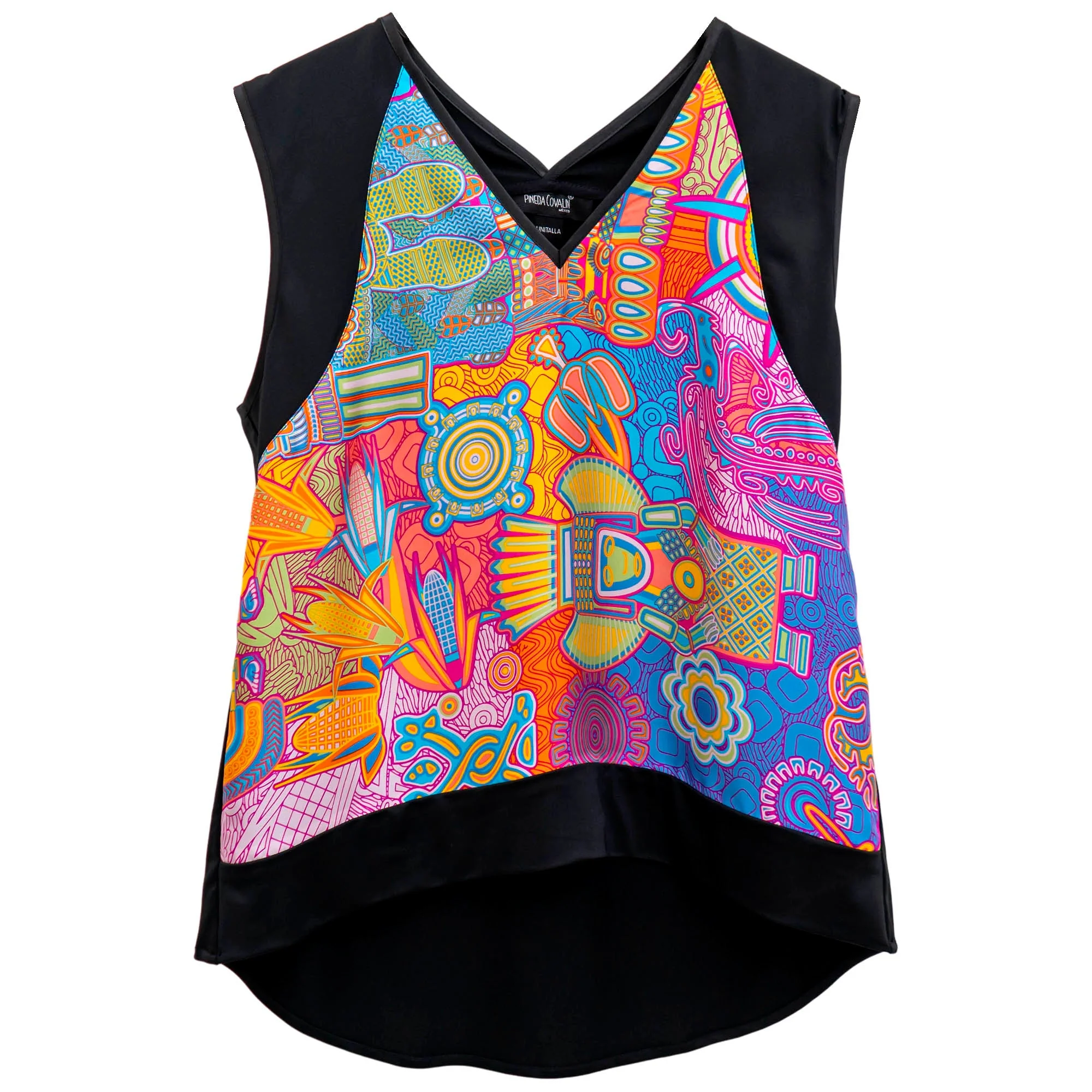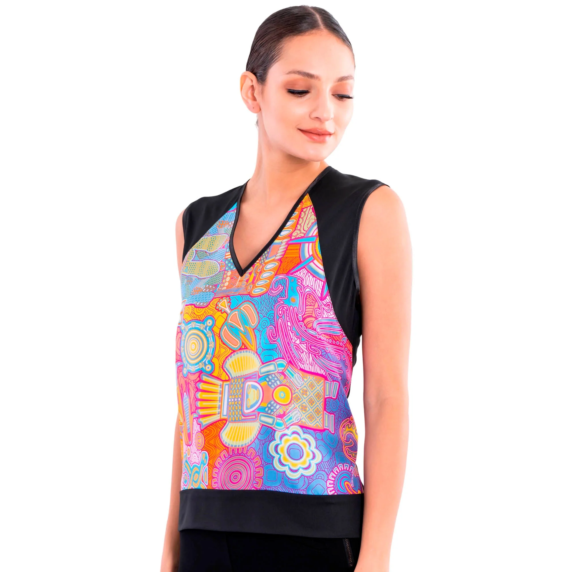 Blusa con escote en ‘V’, sin mangas, con panel estampado en la parte delantera a contraste.