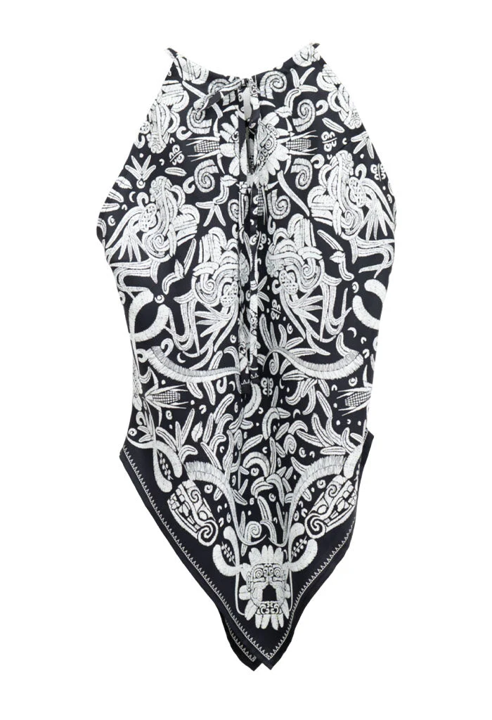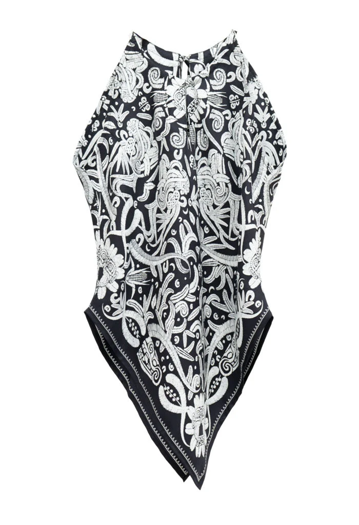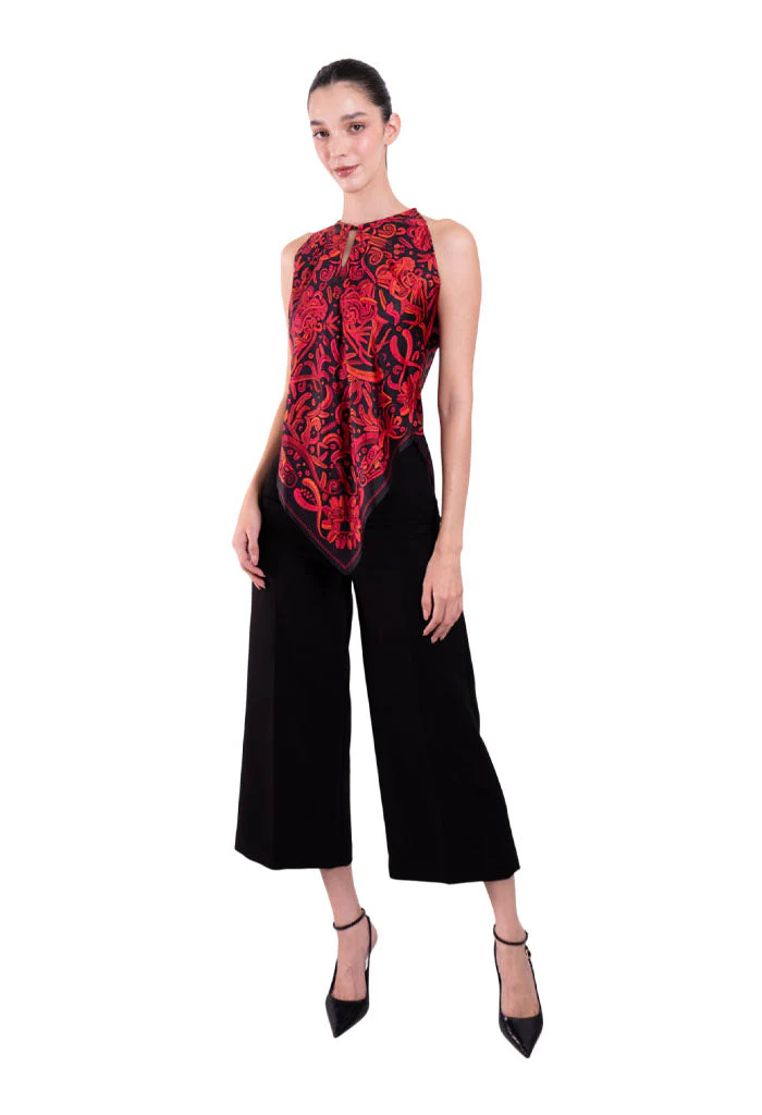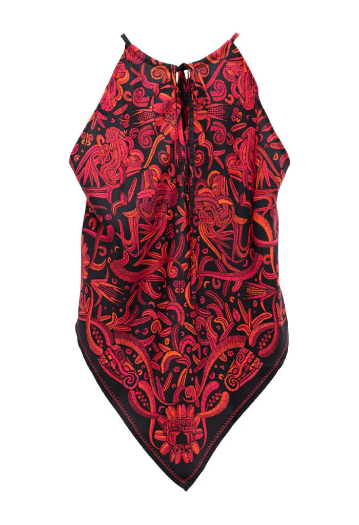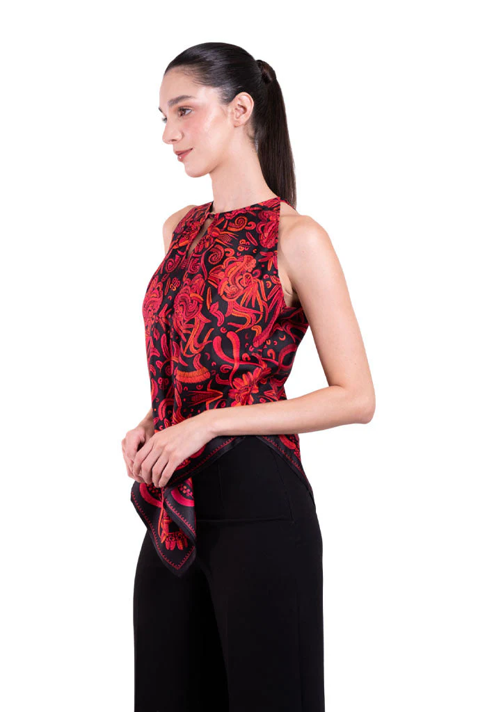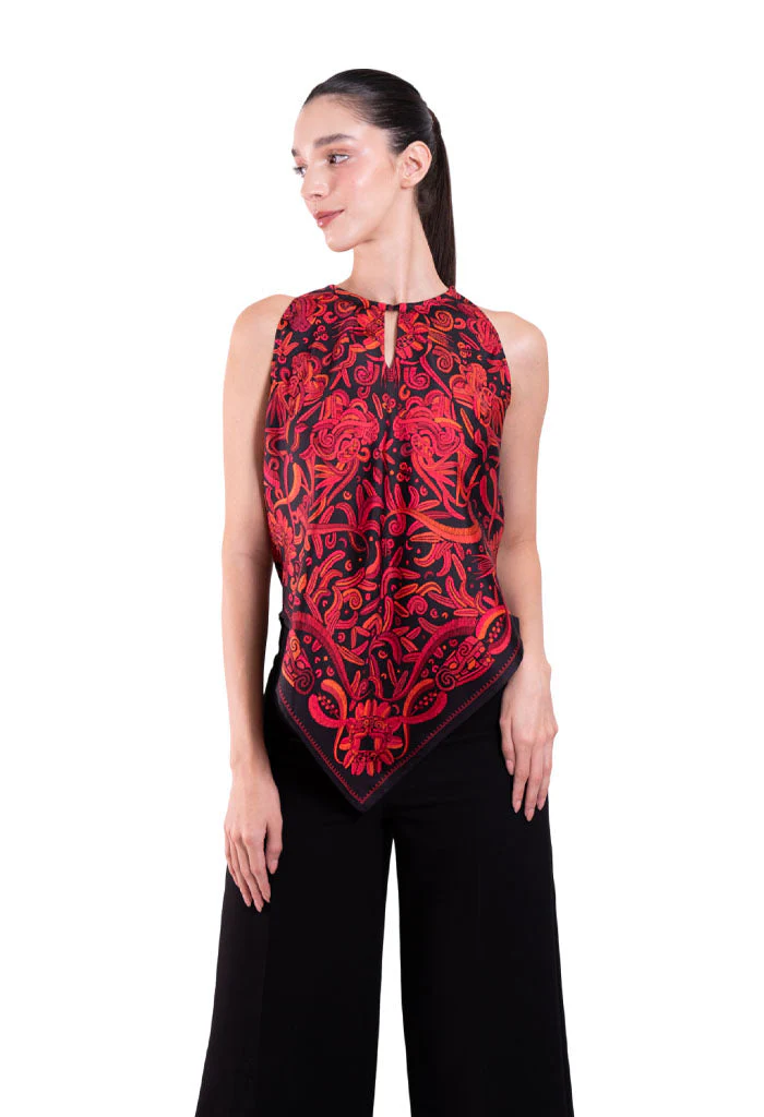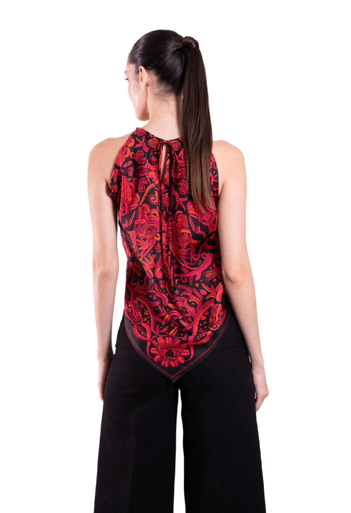 Blusa sin mangas con escote ajustable por medio de cintas y terminada en picos.