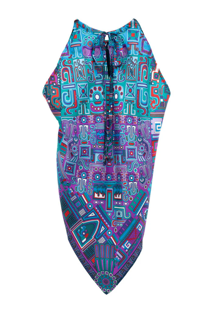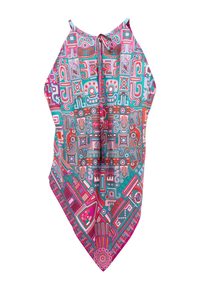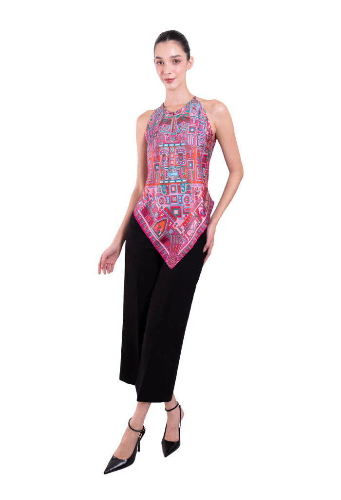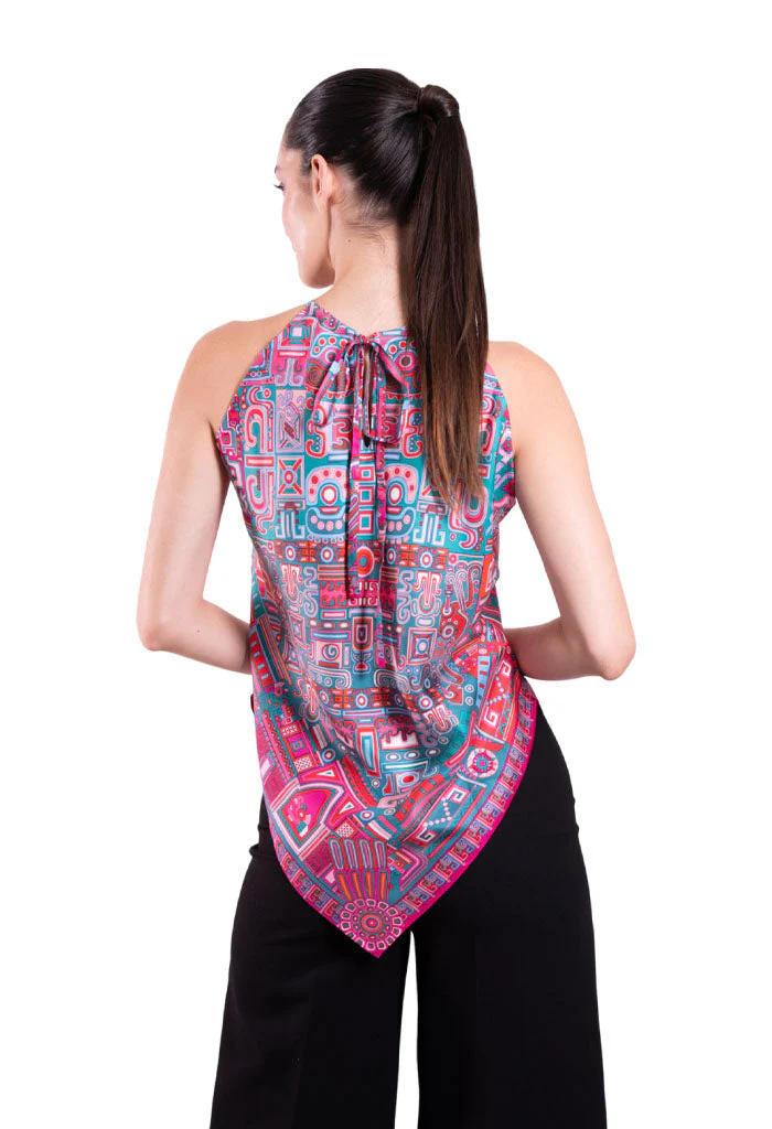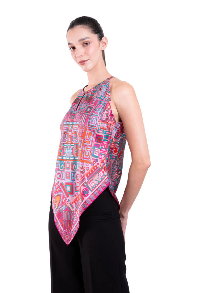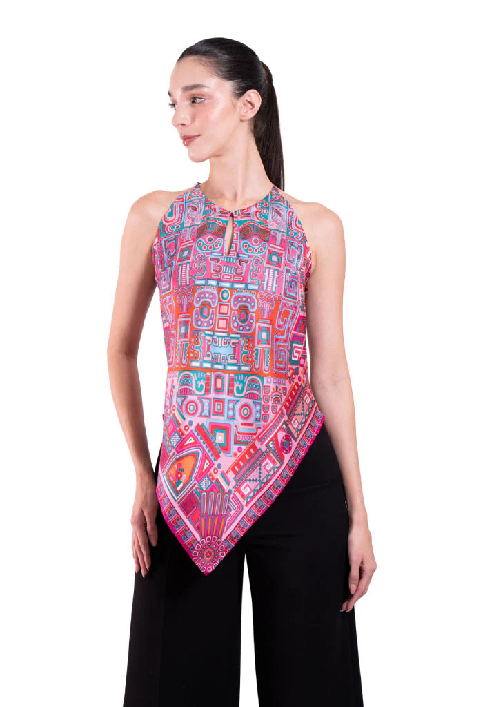 Blusa sin mangas con escote ajustable por medio de cintas y terminada en picos.