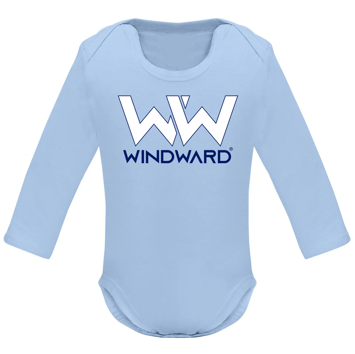 Body de beb茅 BABY de manga larga Celeste de punto liso. Cuello redondo y bajo ribeteado en canal茅 1×1. Cierre con botones a presi贸n en la entrepierna. Hombro de apertura cruzada.