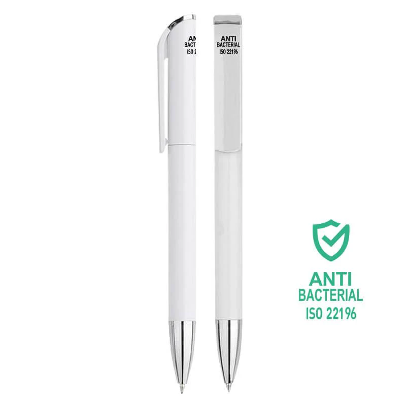 Bolígrafo fabricado en ABS y tratado con iones de plata para inhibir y evitar el proliferamiento de bacterias en su cuerpo.