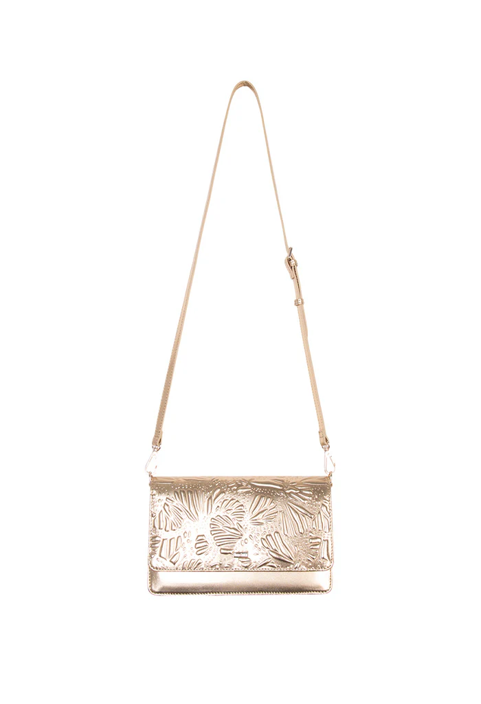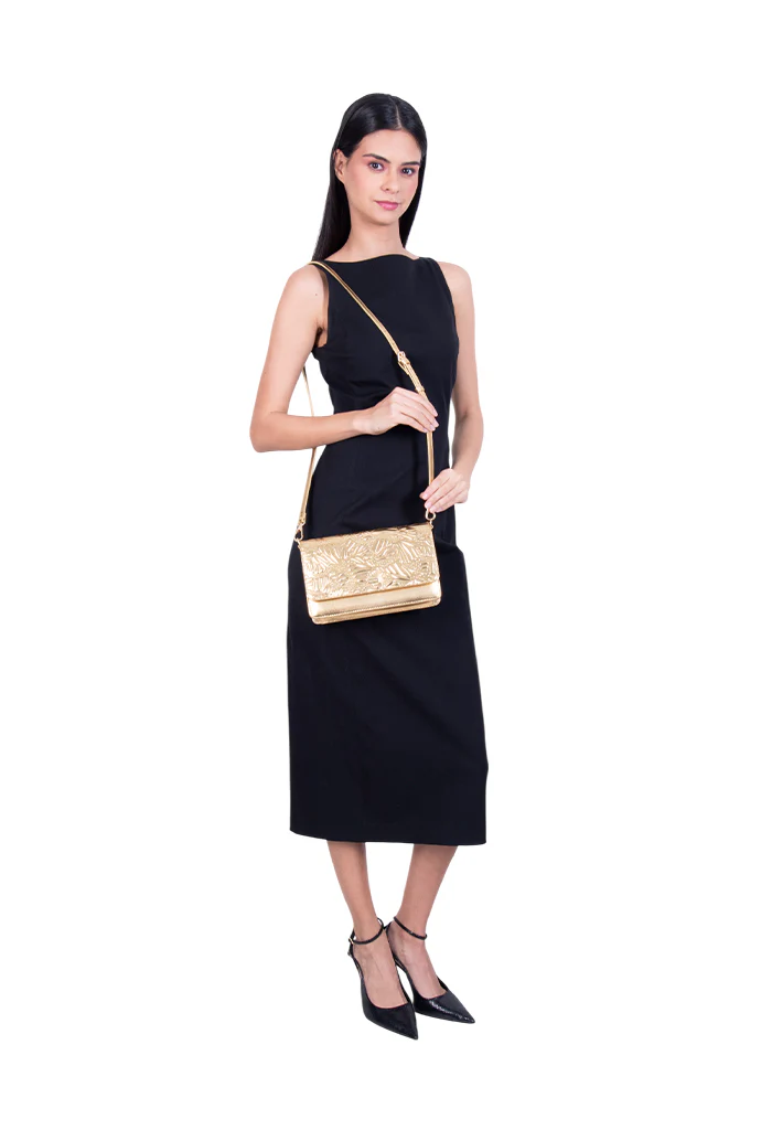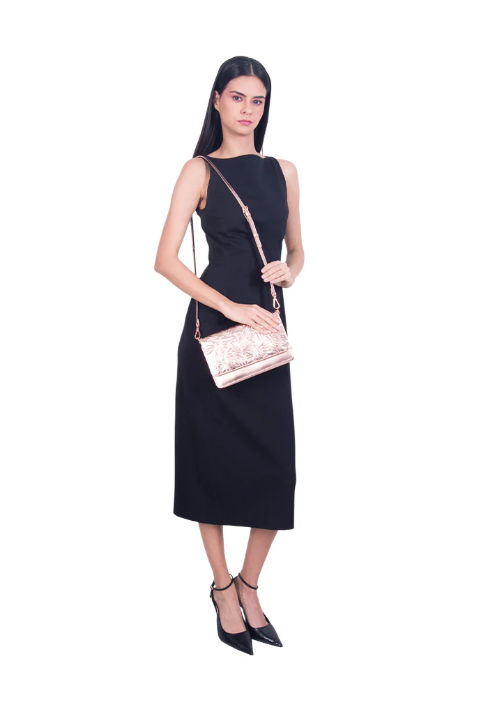Kalan, del maya ‘guardar’. Bolsa estilo crossbody en acabado saffiano y detalles en relieve con asa ajustable y removible para convertirla en una bolsa estilo ‘clutch’. Cuenta con compartimentos y cierre en el interior.