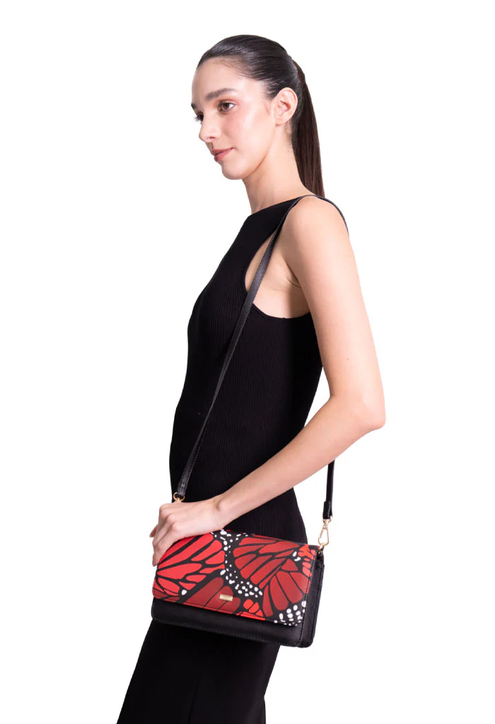 Kalan, del maya ‘guardar’. Bolsa estilo crossbody con asa ajustable y removible para convertirla en una bolsa estilo ‘clutch’. Cuenta con compartimentos y cierre en el interior.
