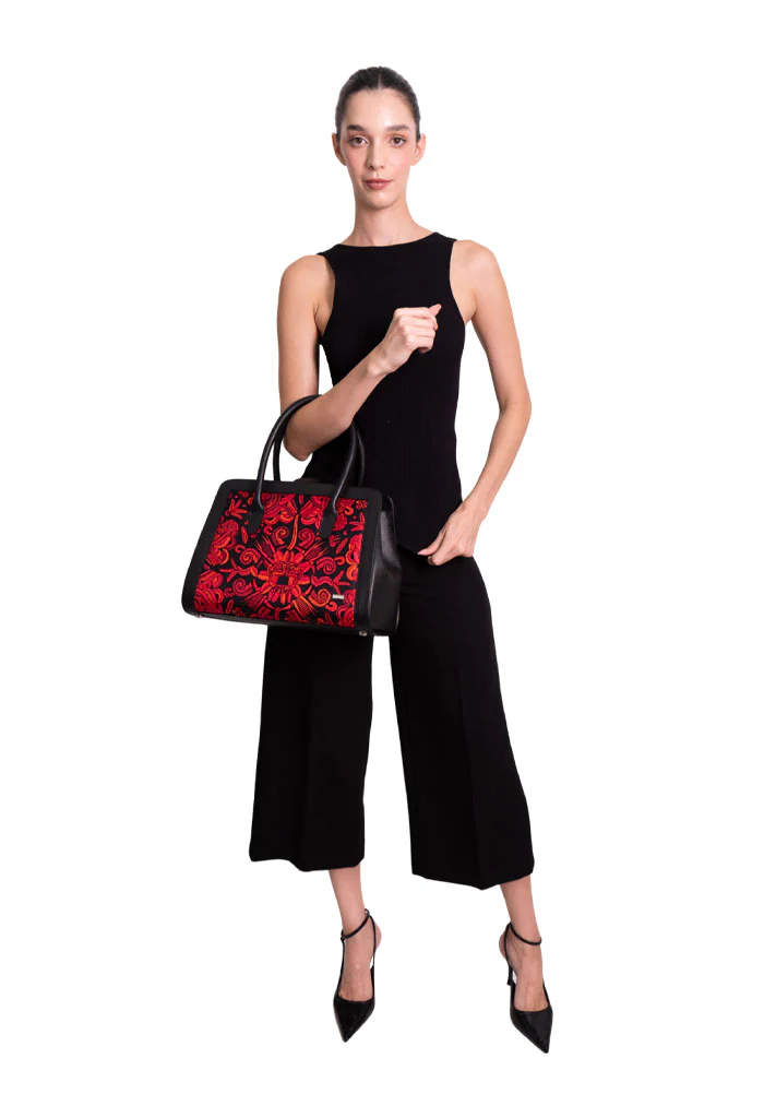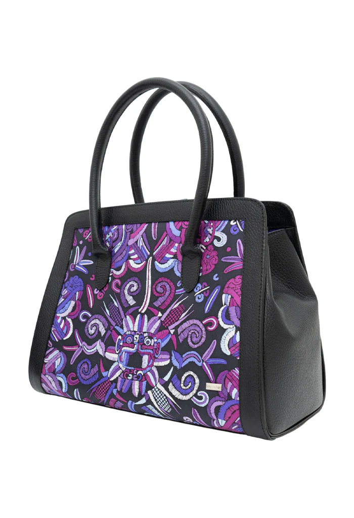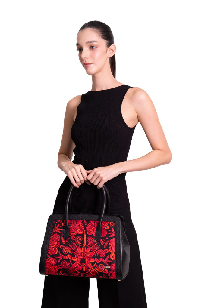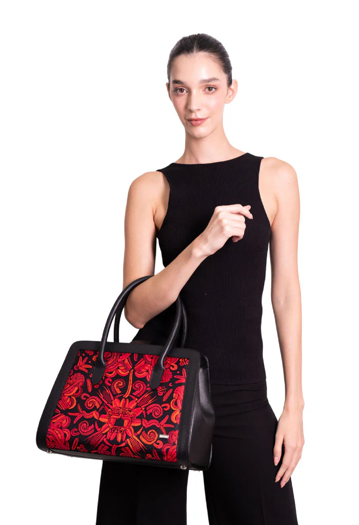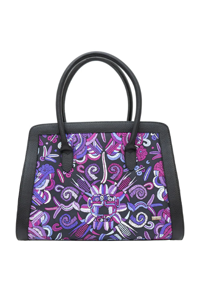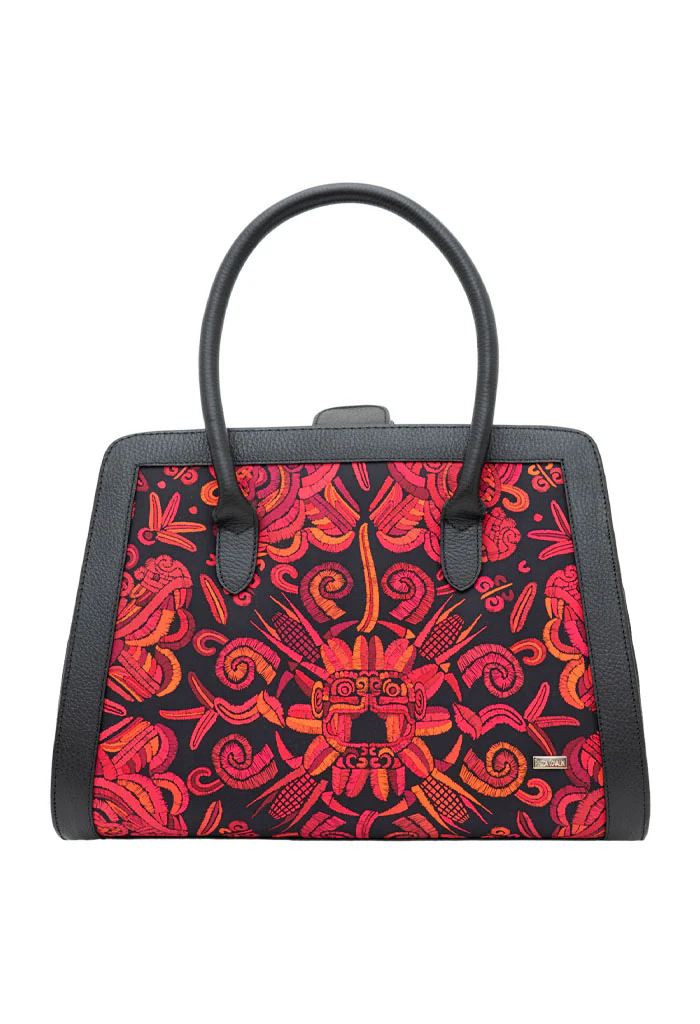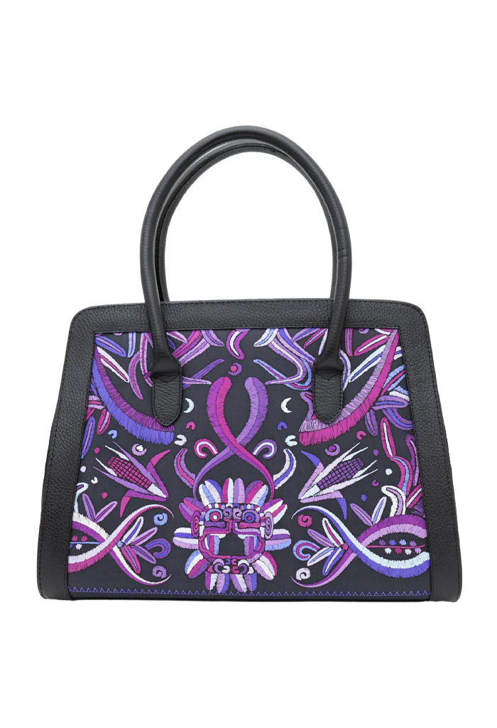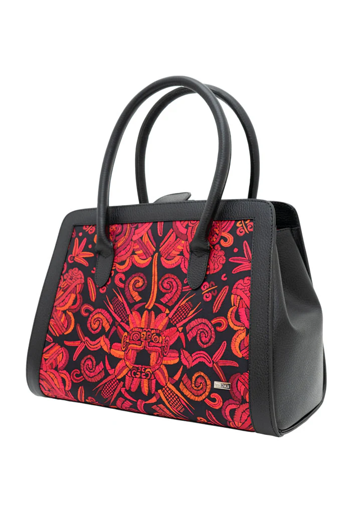 Muul, del maya ‘montaña’. Bolsa estructurada estilo satchel con doble asa, dos bolsas internas, porta llaves y broche magnético.