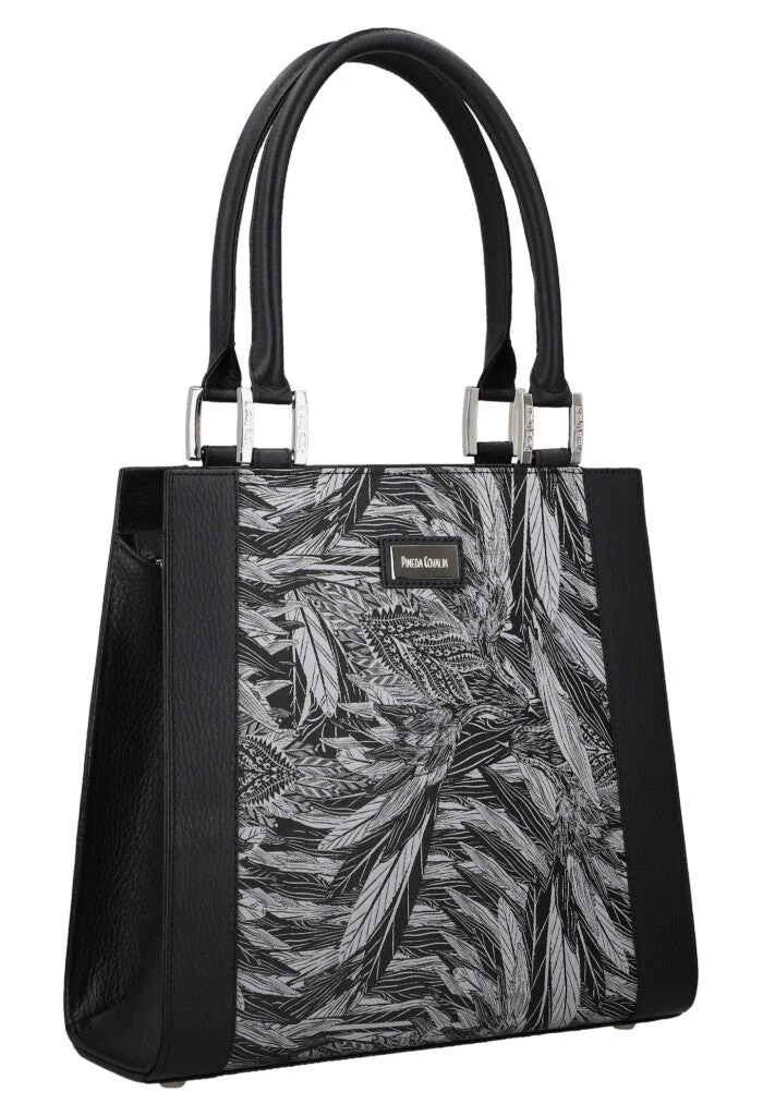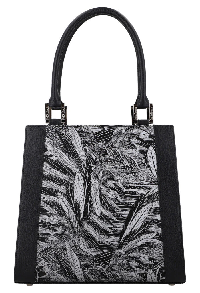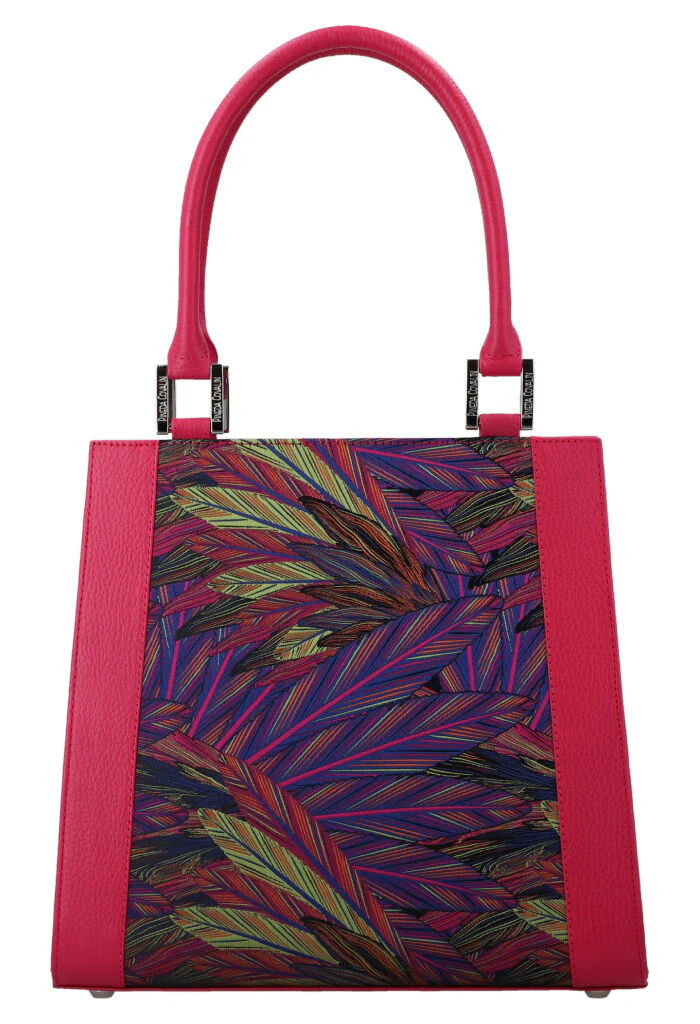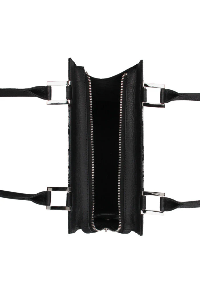 Bolsa estructurada con forma trapezoidal, cierre metálico y compartimentos interiores.