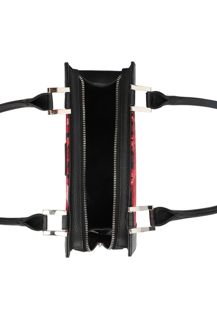 Bolsa estructurada con forma trapezoidal, cierre met谩lico y compartimentos interiores.