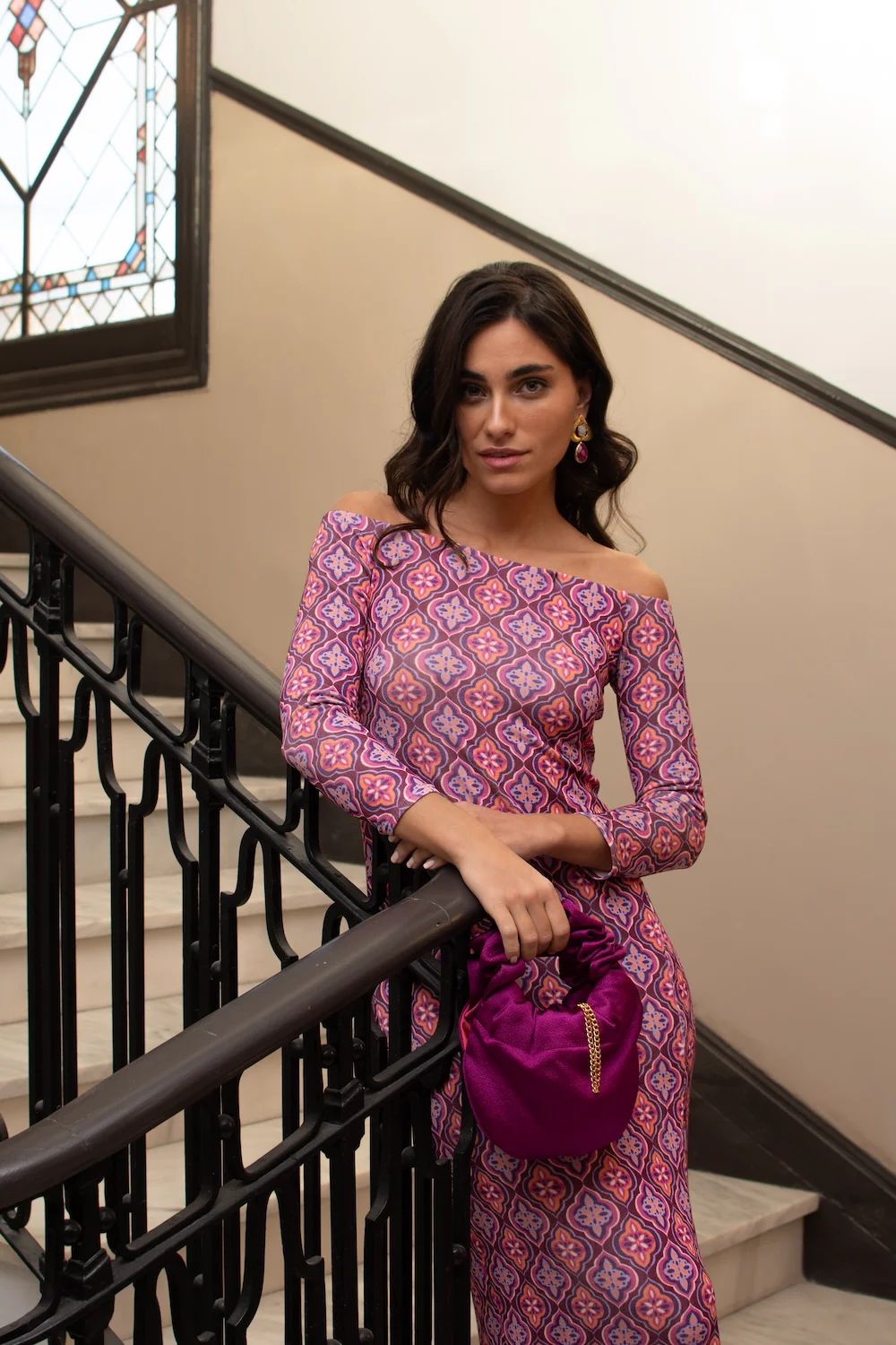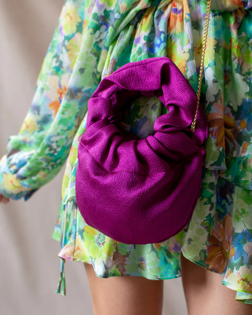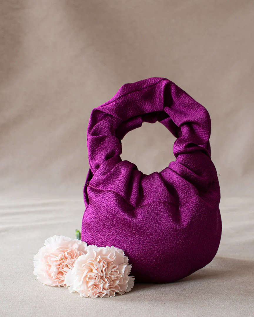 Bolso confeccionado a mano con tejidos de una calidad exquisita. Las asas llevan en su interior unos aros rígidos que hacen que no se deformen. En su interior forrado también lleva una cadena larga para poder colgar en el hombro o bandolera . Color oro o plata, opcional.