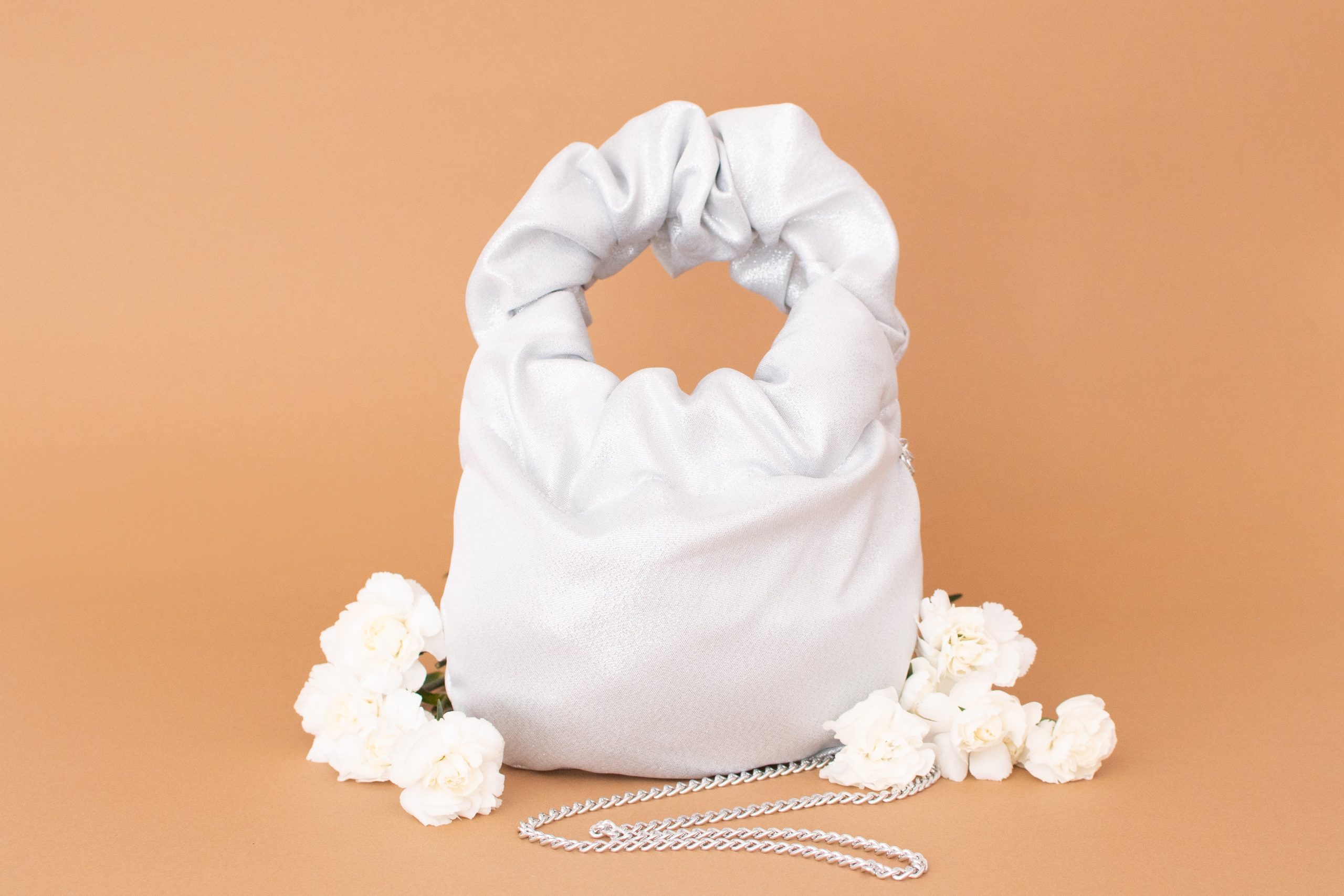Bolso confeccionado en tejido plata con asas fruncidas y cadena en su interior en color plateado.