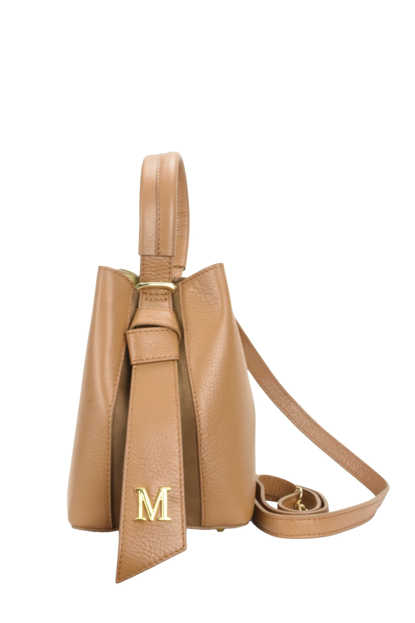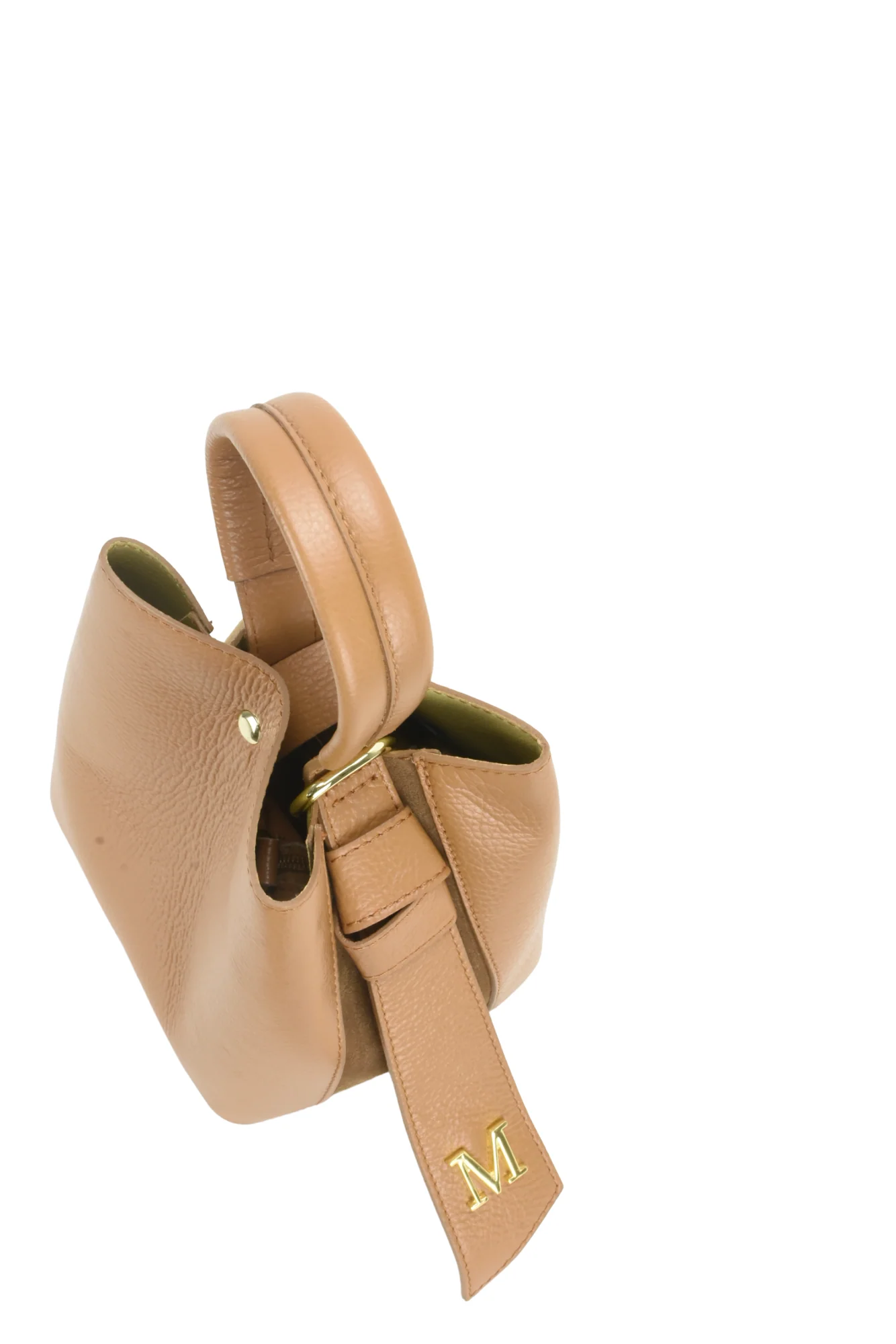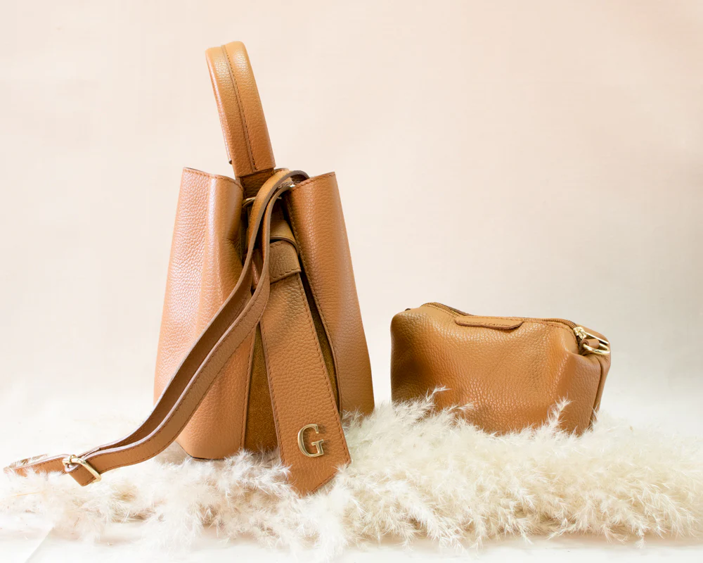 Dispone de una correa para llevar tipo bandolera en el mismo tono y un asa para llevar de la mano.