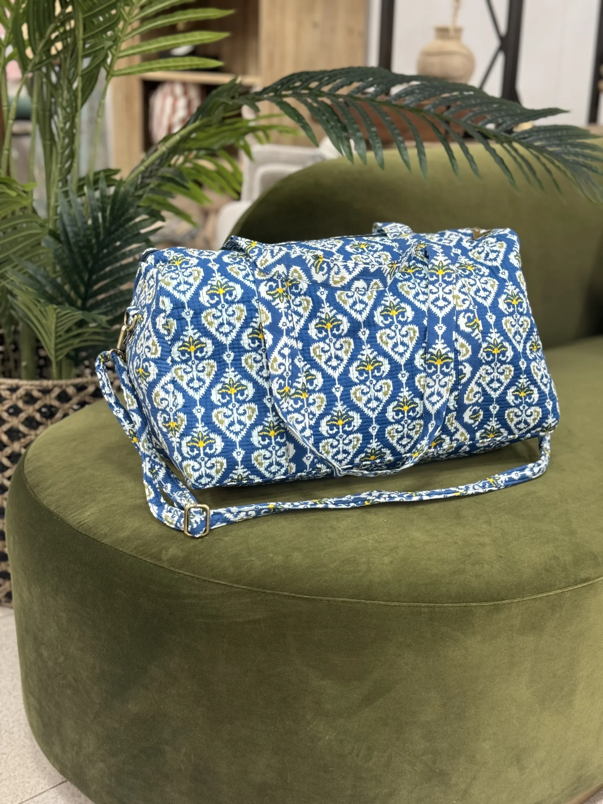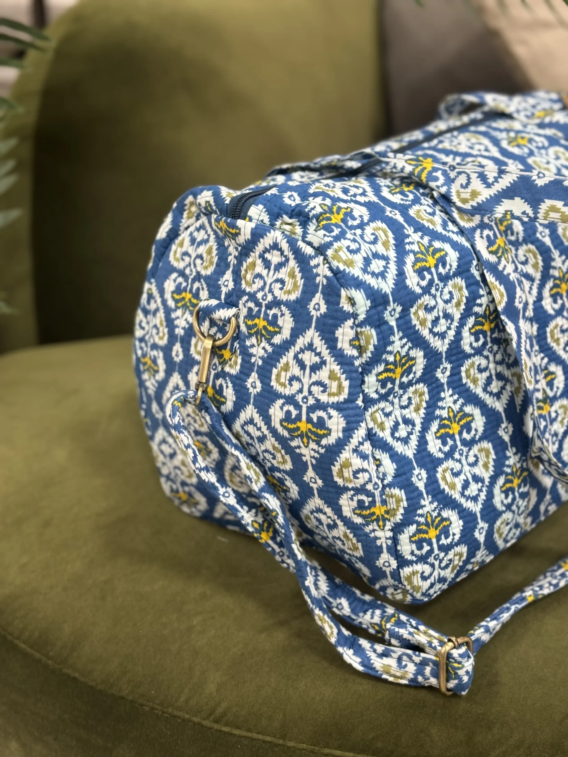 Bolso de Viaje confeccionado a mano en tejido cosido 100% algod贸n. En su interior est谩 forrado y lleva un bolsillo con cremallera.
