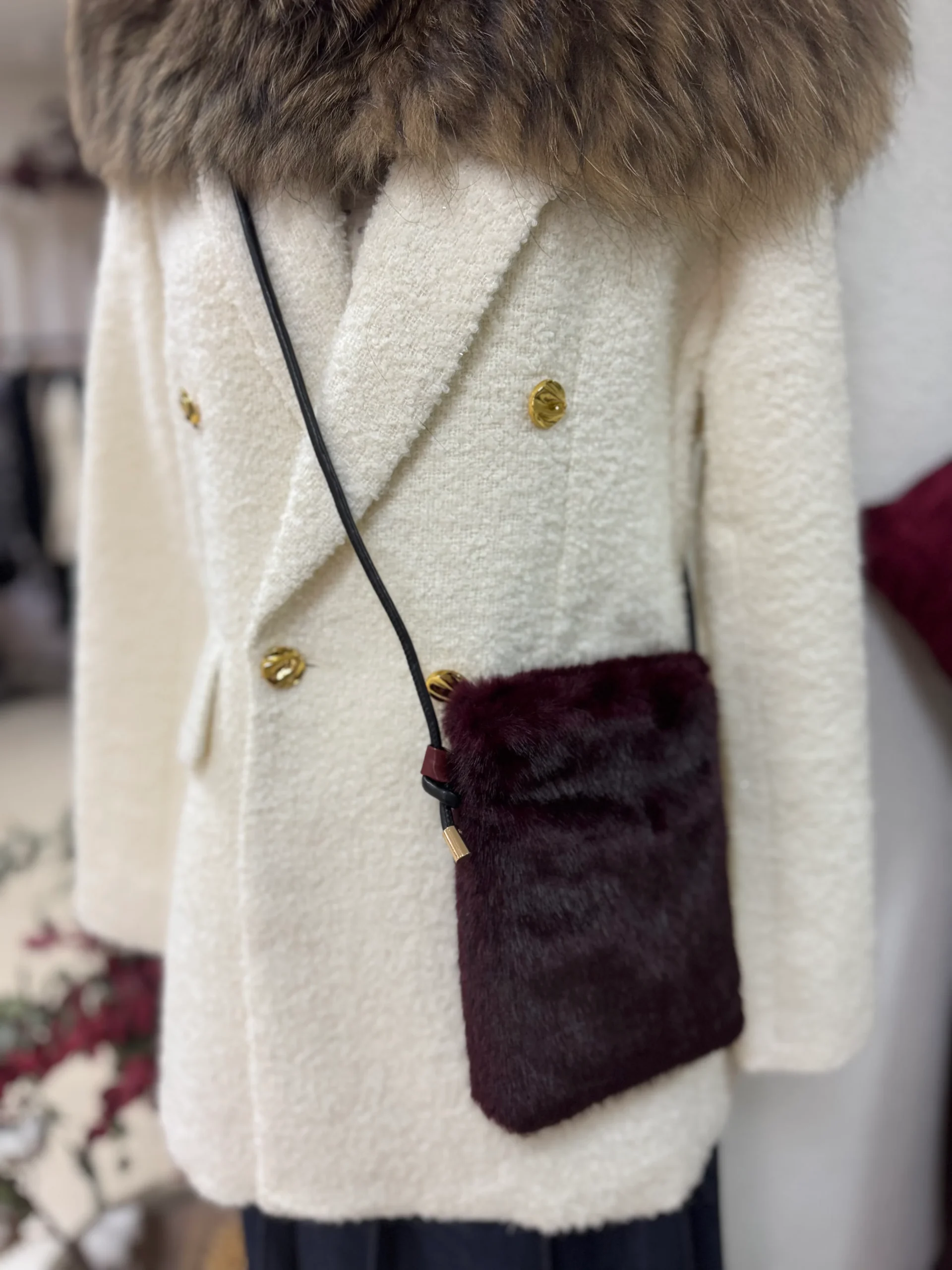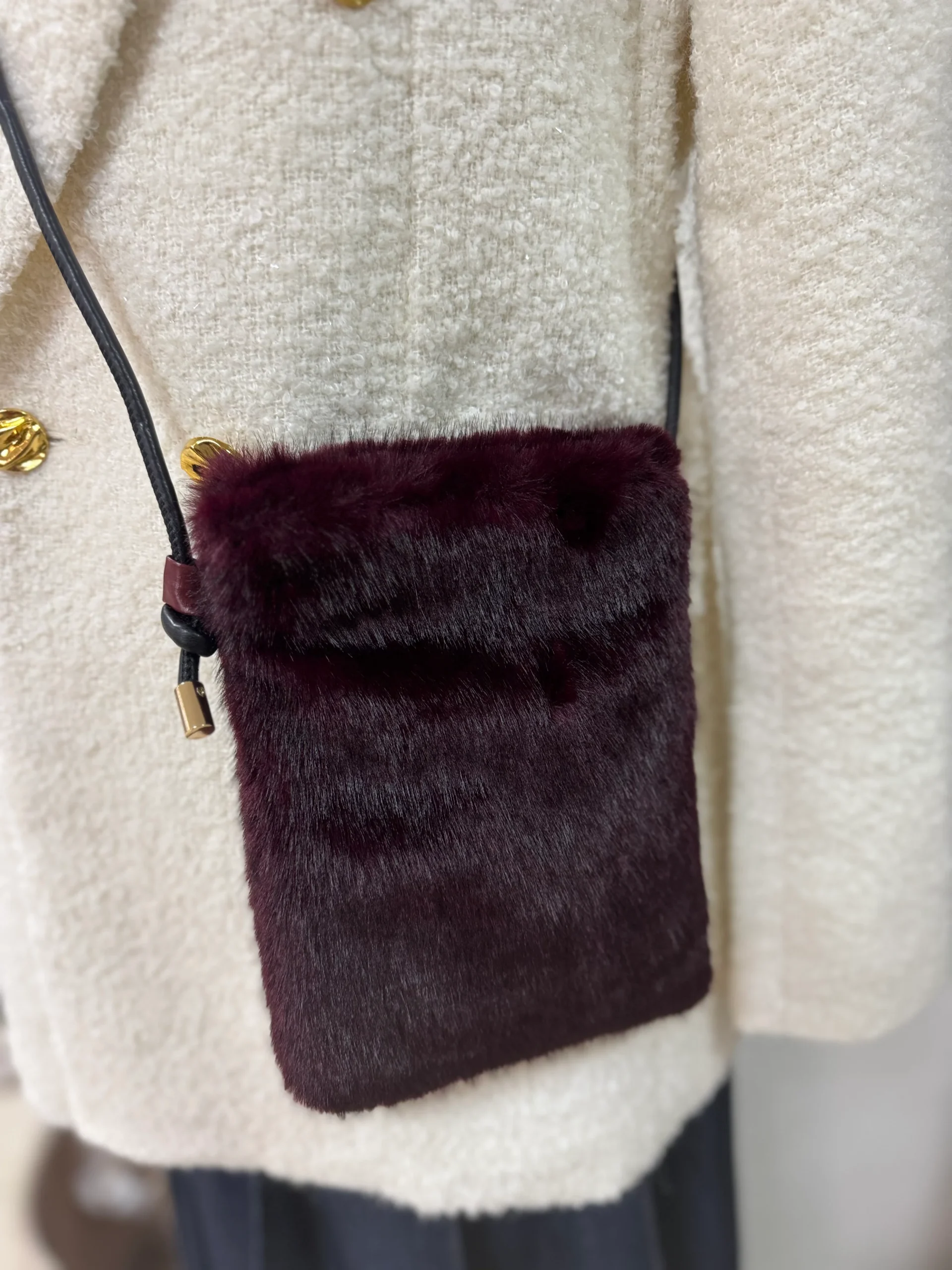 Bolsito de Pelo , lleva broche herm茅tico para cerrar y correa de polipiel con terminaci贸n metalizada en dorada.