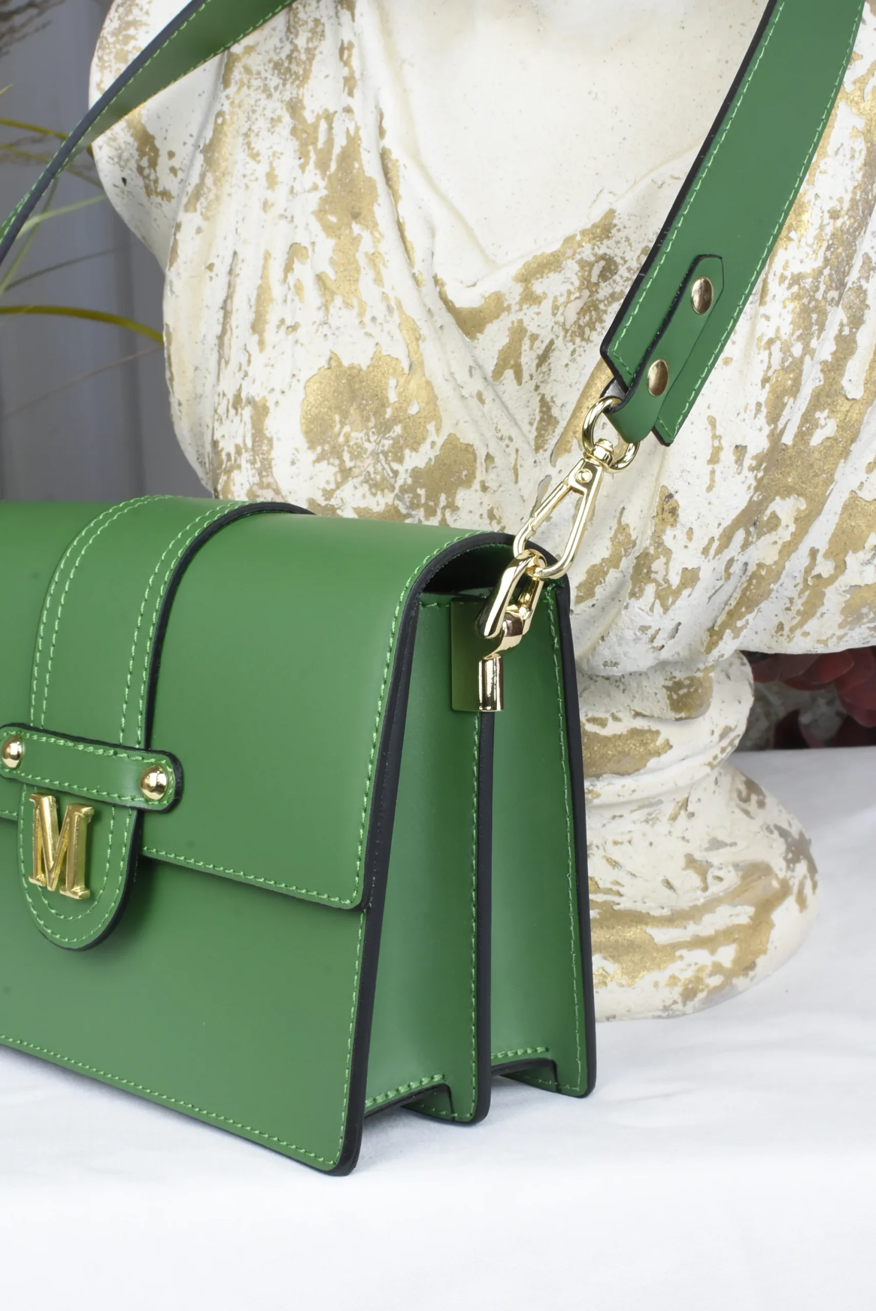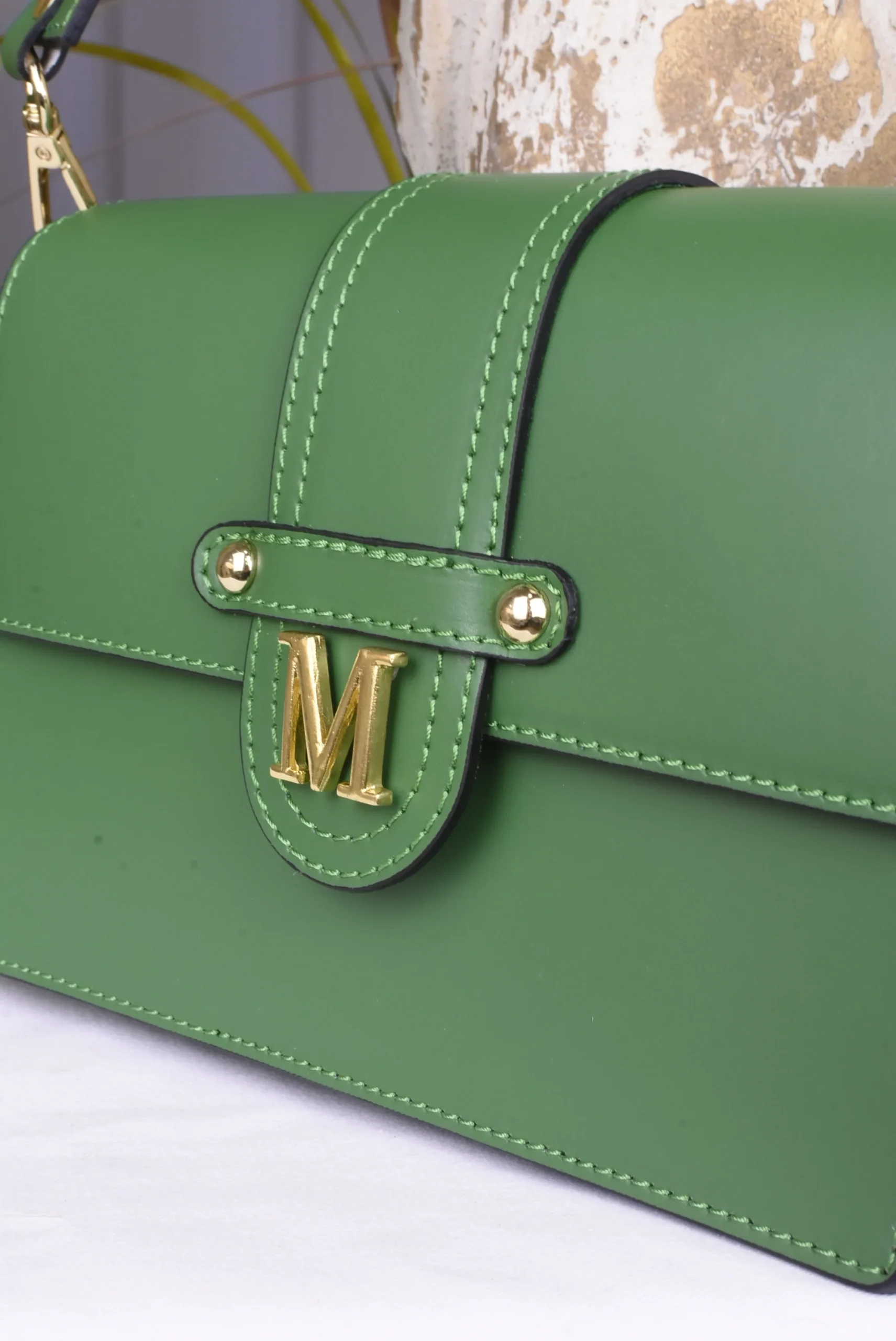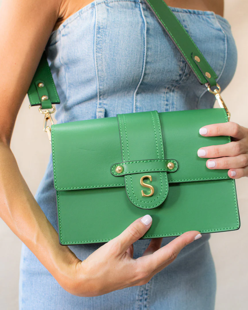 Bolso en 100% Piel con remates en dorado y doble asa, una para llevar al hombro y otra regulable para llevar bandolera.