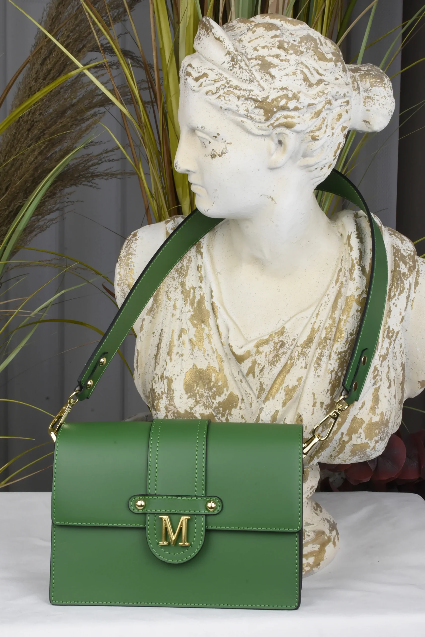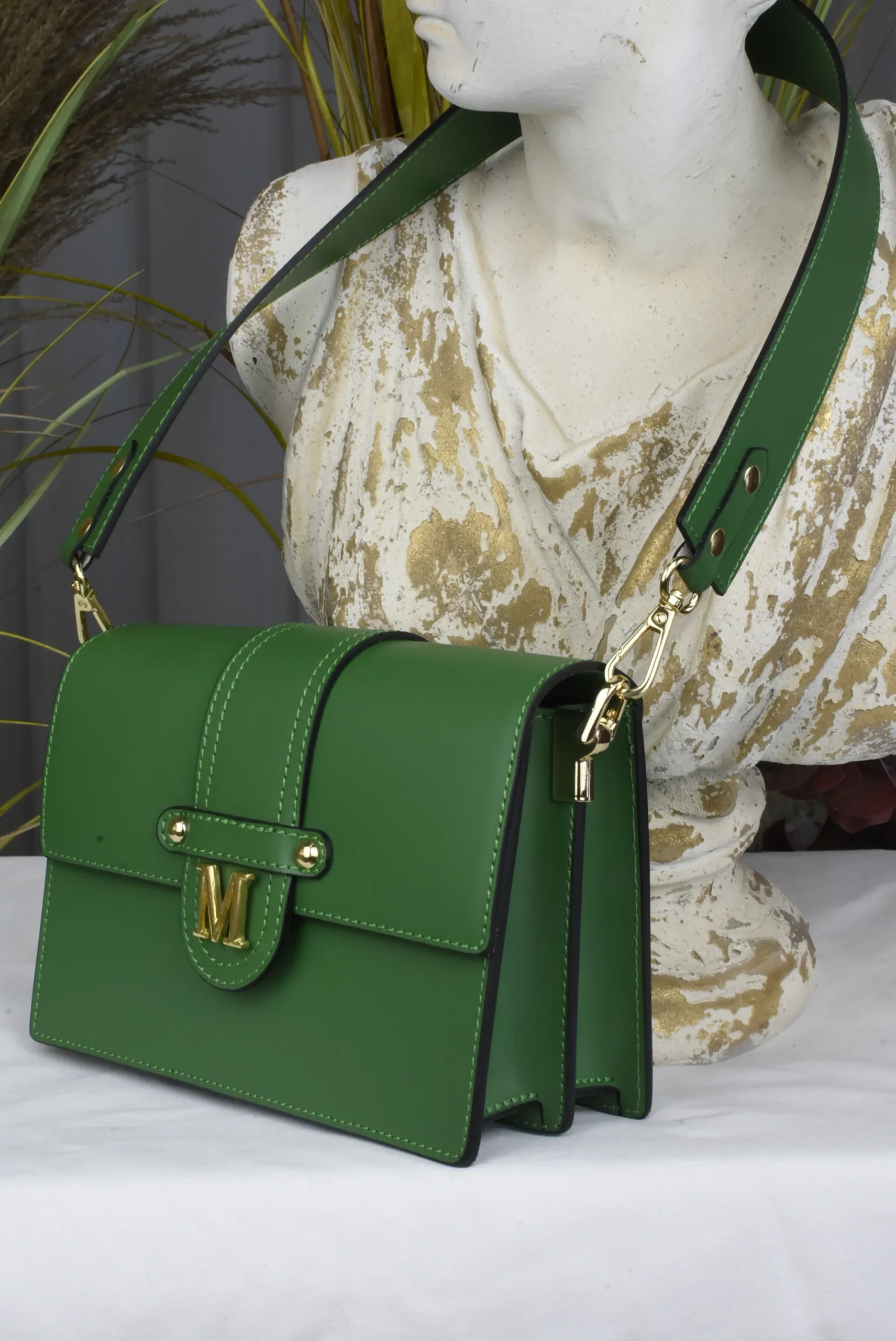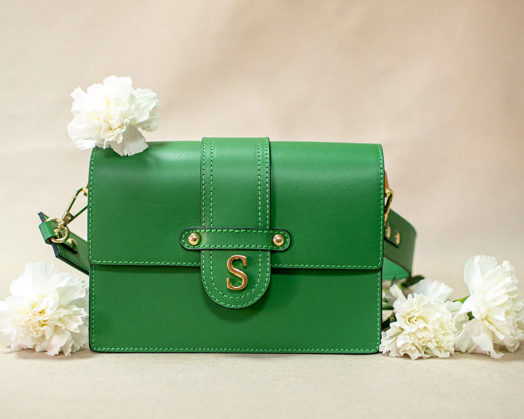 Bolso en 100% Piel con remates en dorado y doble asa, una para llevar al hombro y otra regulable para llevar bandolera.