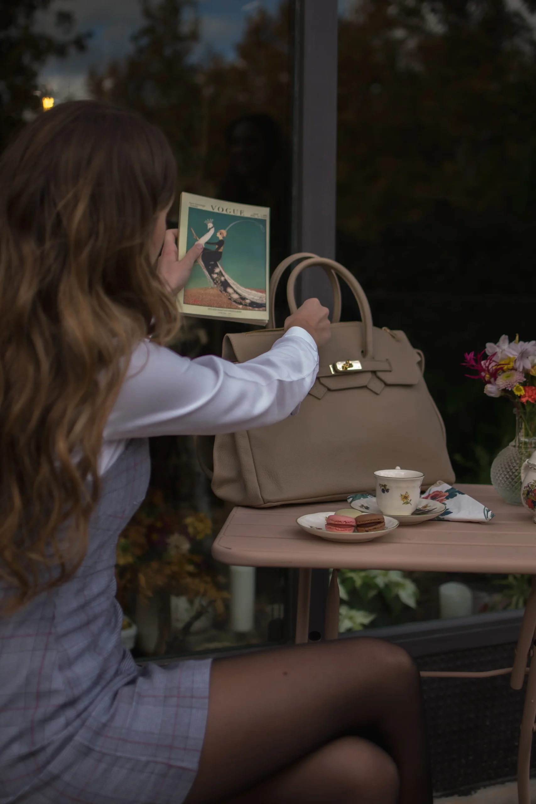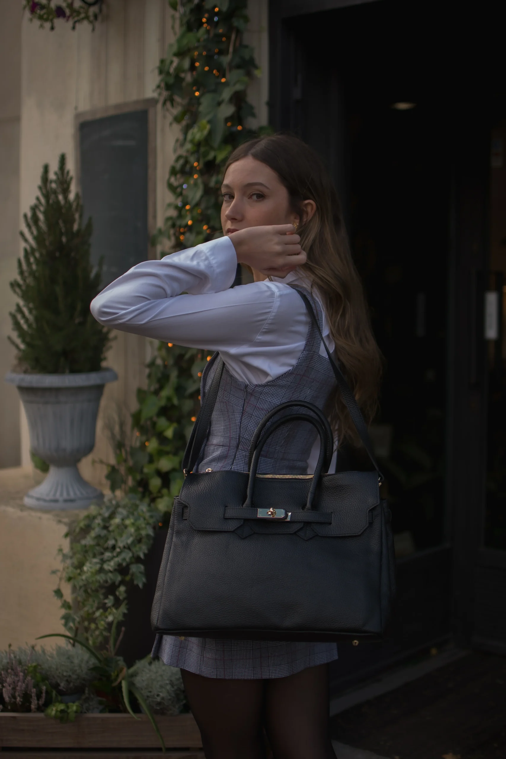 Bolso Piel Praga, es un bolso elegante y amplio, sus materiales son de muy buena calidad y resistentes. Lleva en su interior correa regulable para poder usarlo en bandolera. Apliques dorados.