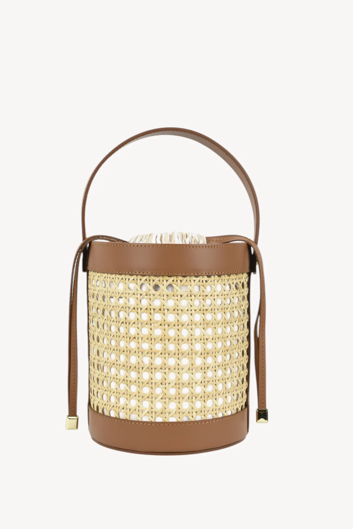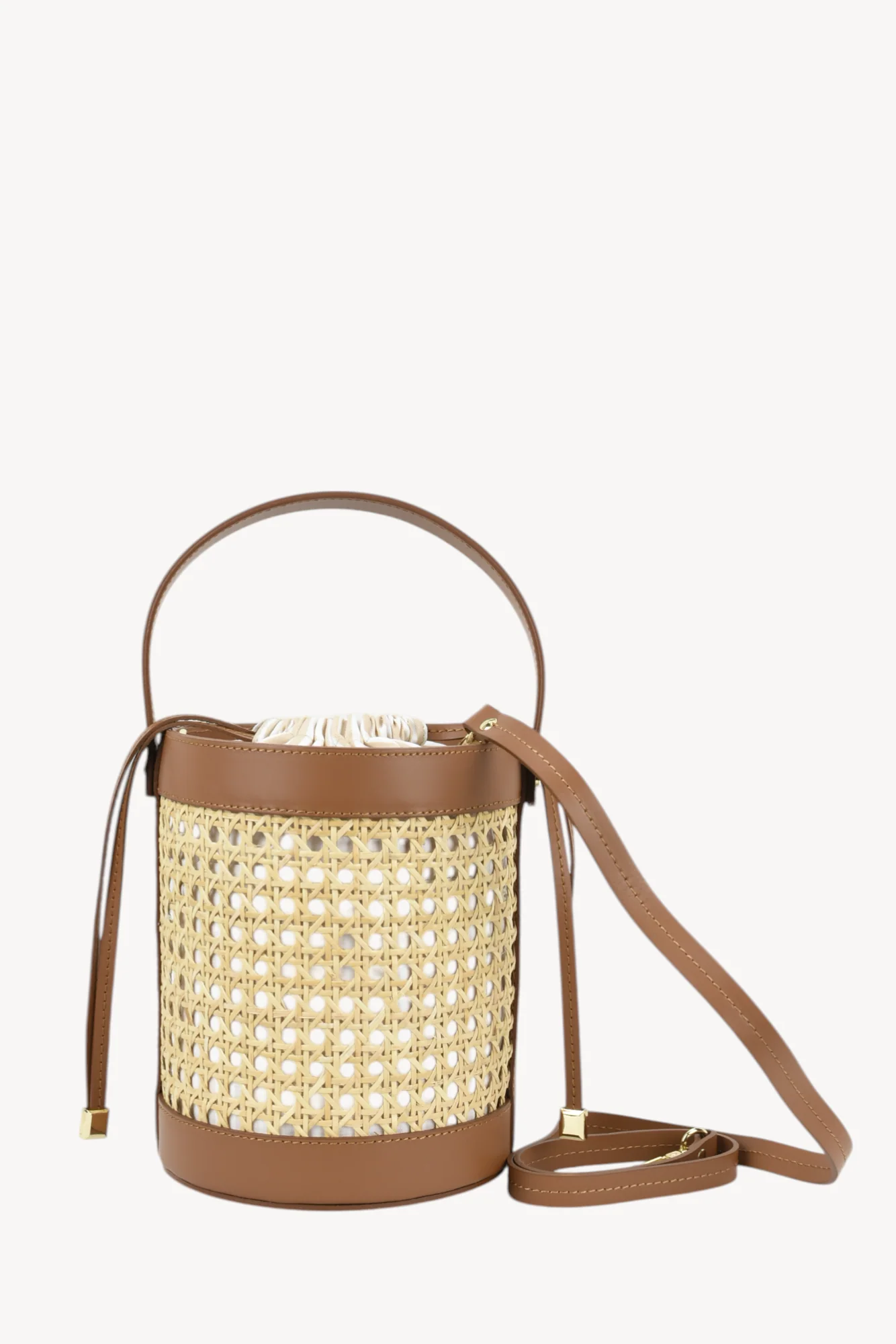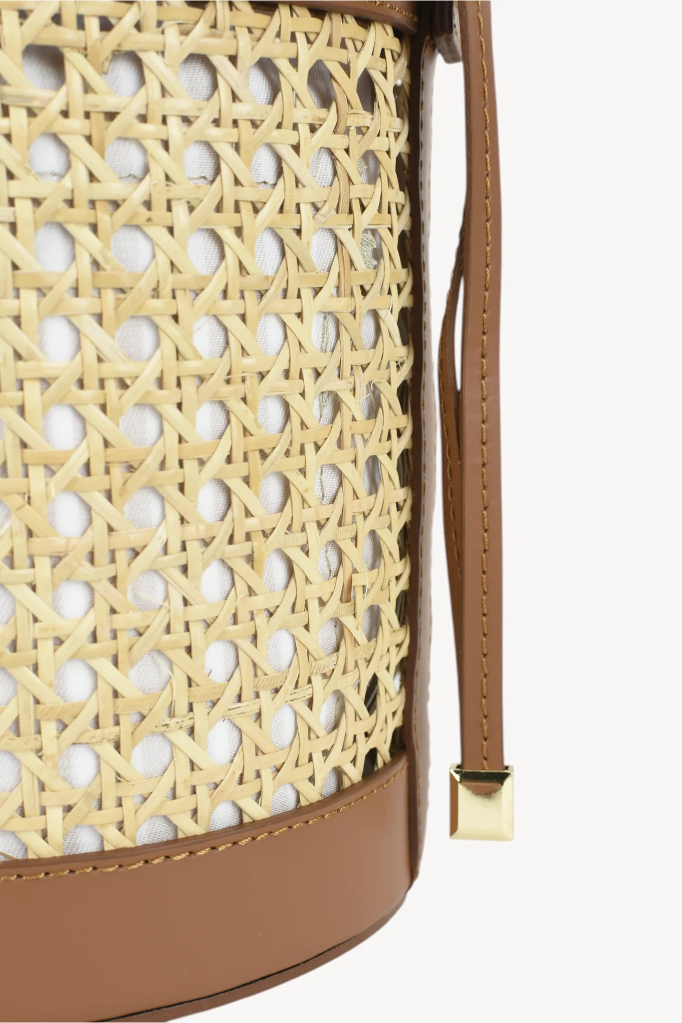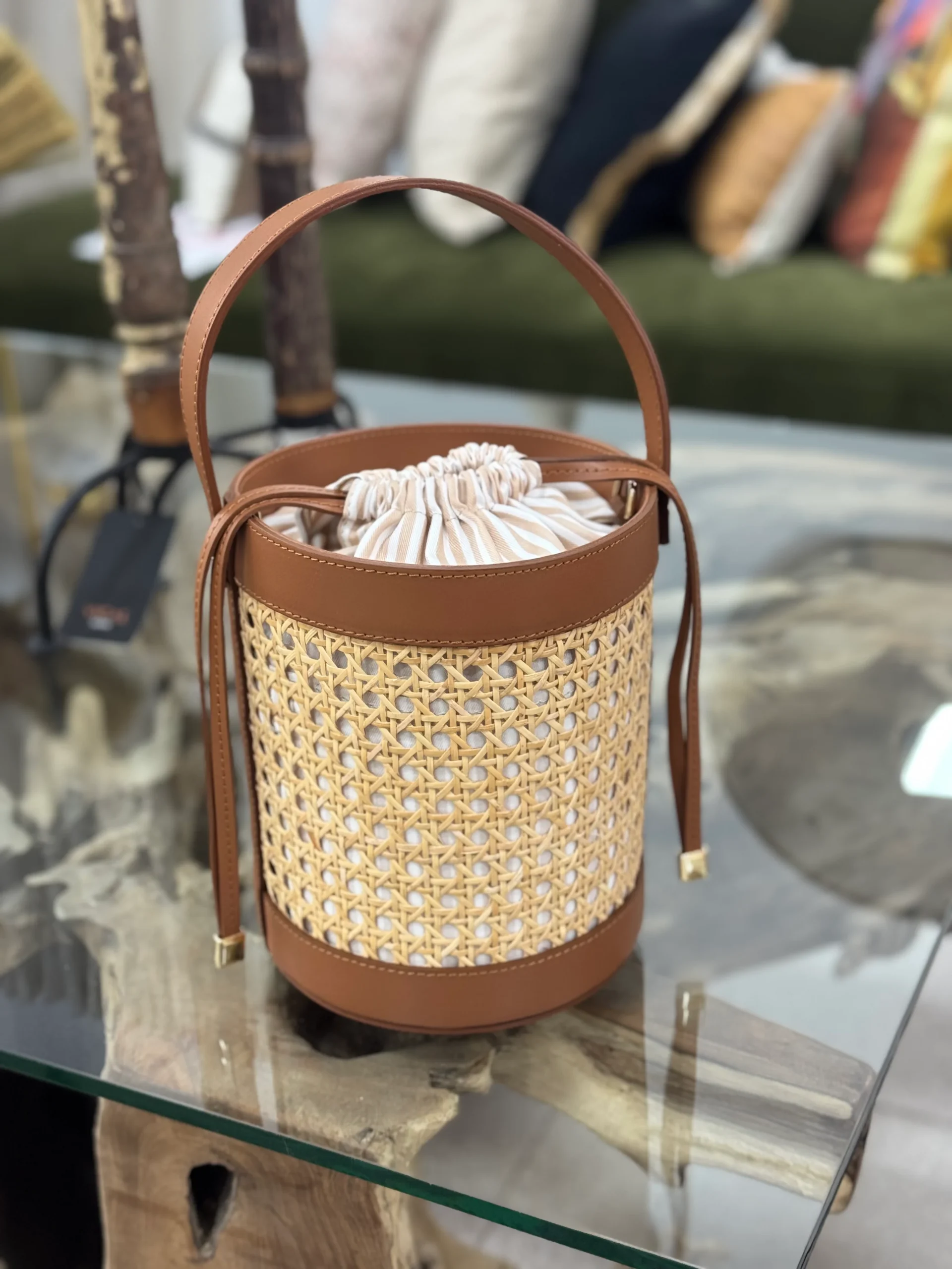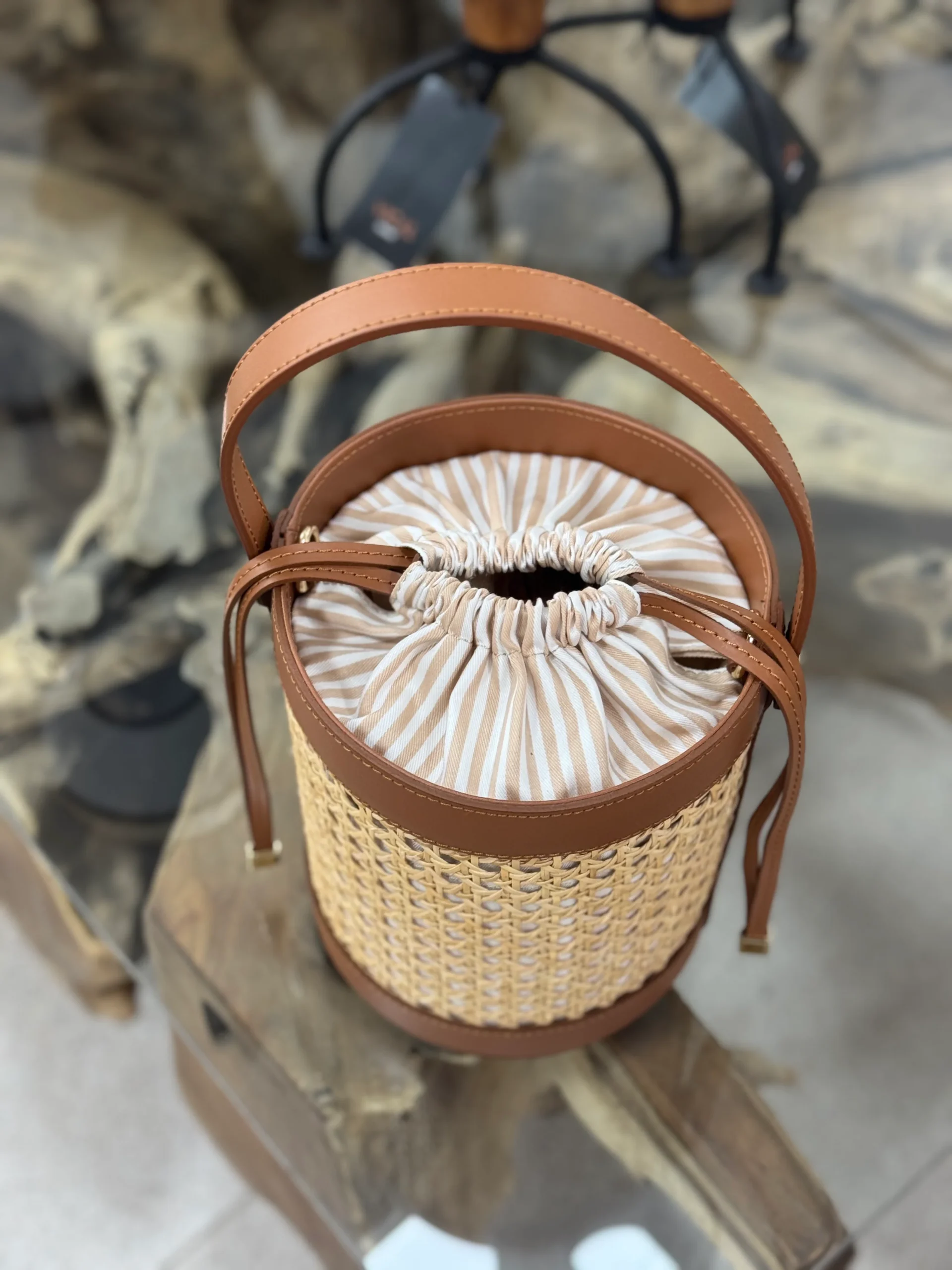 Confeccionado en piel y ratan natural . Lleva un bolso interior en Panamá de rayas con cierre de tira piel. Y lleva correa de piel para colgar bandolera.