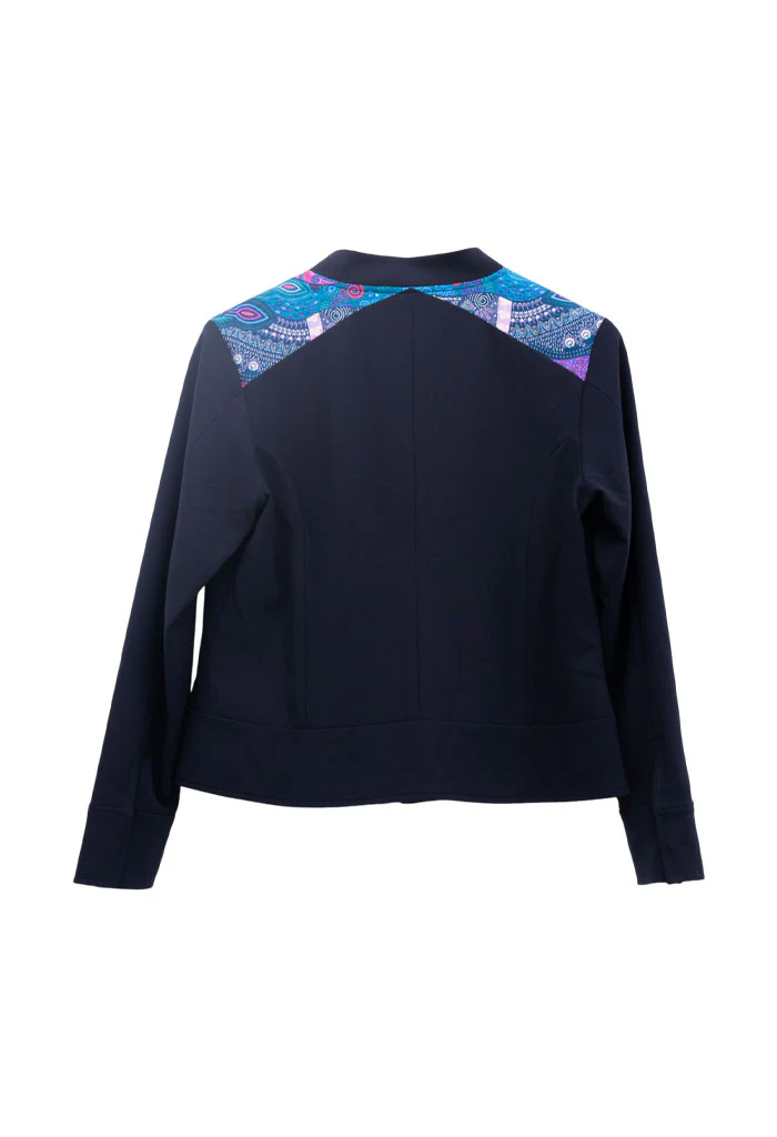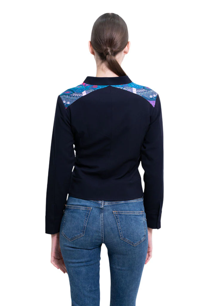 Okomej, del náhuatl ‘pinos’. Chamarra tipo bomber con bolsillos al frente y puños con botón. Cuello redondo y cierre mediante cremallera oculta.