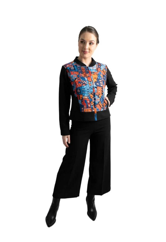 Okomej, del n谩huatl ‘pinos’. Chamarra tipo bomber con bolsillos al frente y pu帽os con bot贸n. Cuello redondo y cierre mediante cremallera oculta.
