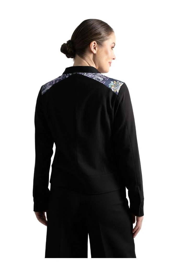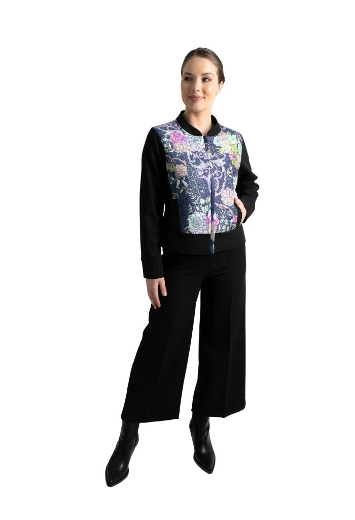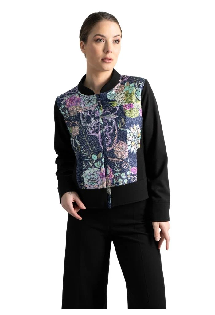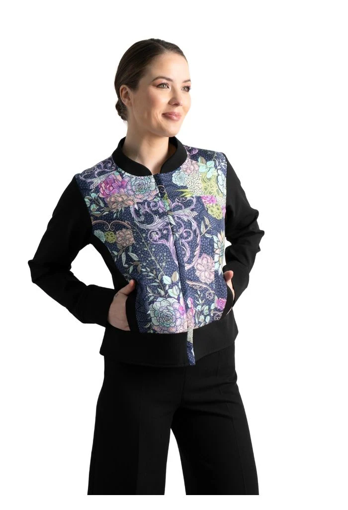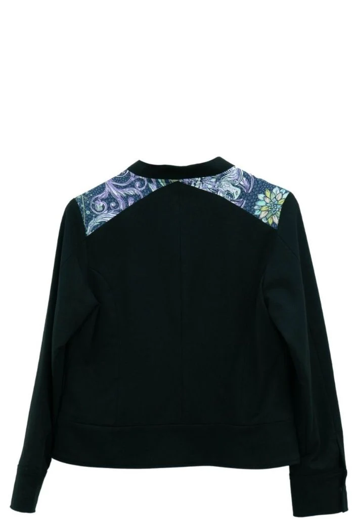 Okomej, del náhuatl ‘pinos’. Chamarra tipo bomber con bolsillos al frente y puños con botón. Cuello redondo y cierre mediante cremallera oculta.