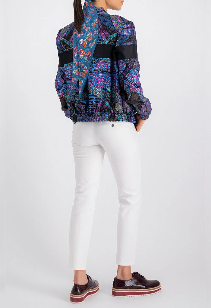 Chamarra tipo bomber con cierre mediante cremallera en delantero, mangas con resorte y bolsillos de vivo.