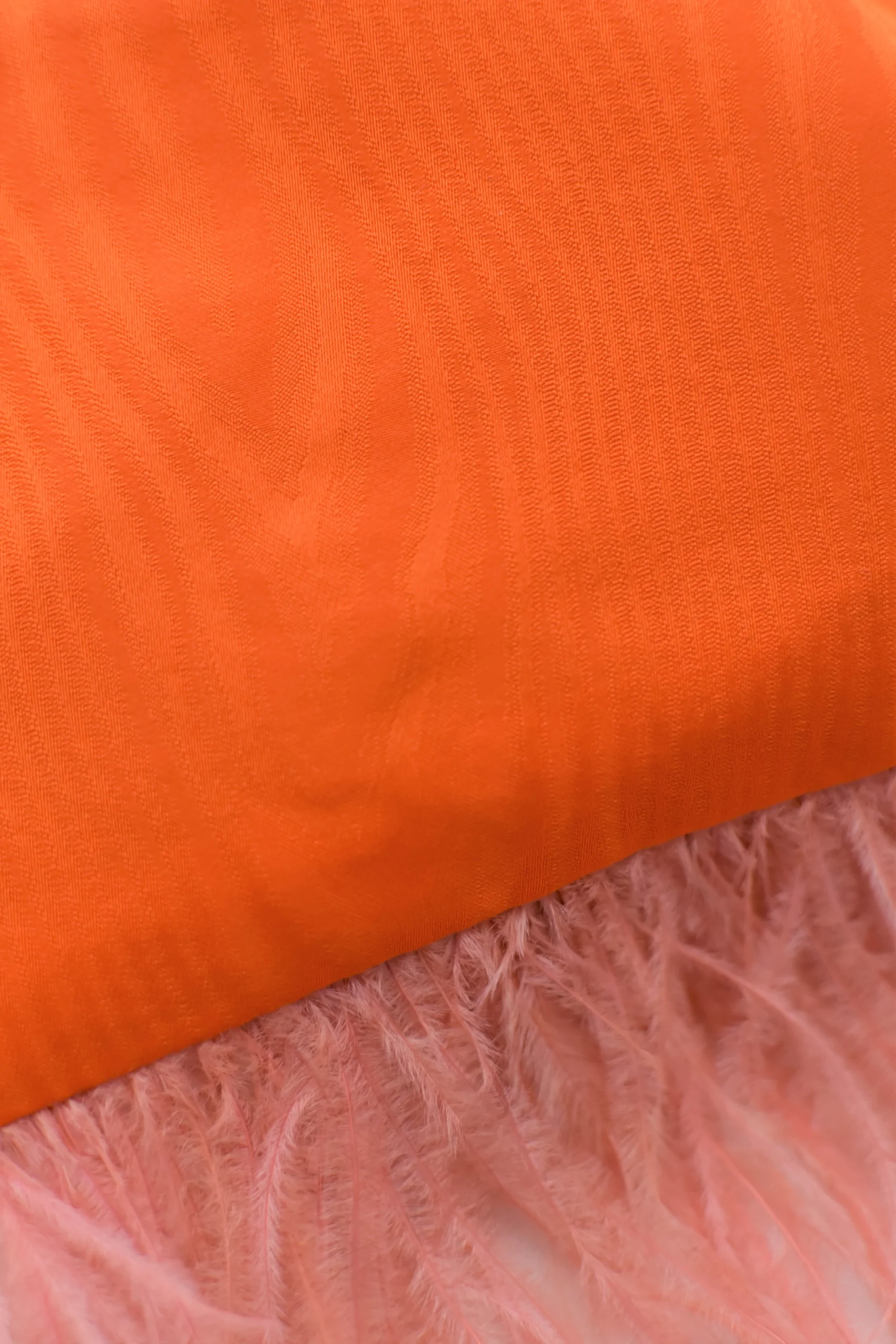Bolso hecho a mano con tejido de muar茅 en color naranja, forrado en su interior. Lleva dos cadenas en tono dorado, pero hay la opci贸n de ponerla en tono plata tambi茅n. Una es para llevar de la mano y la otra para colgar del hombro o bandolera. En su parte inferior lleva plumas lo que hace que le de un toque elegante y diferente. En la parte superior lleva una goma que evita que se puedan salir las cosas que deposites en su interior.