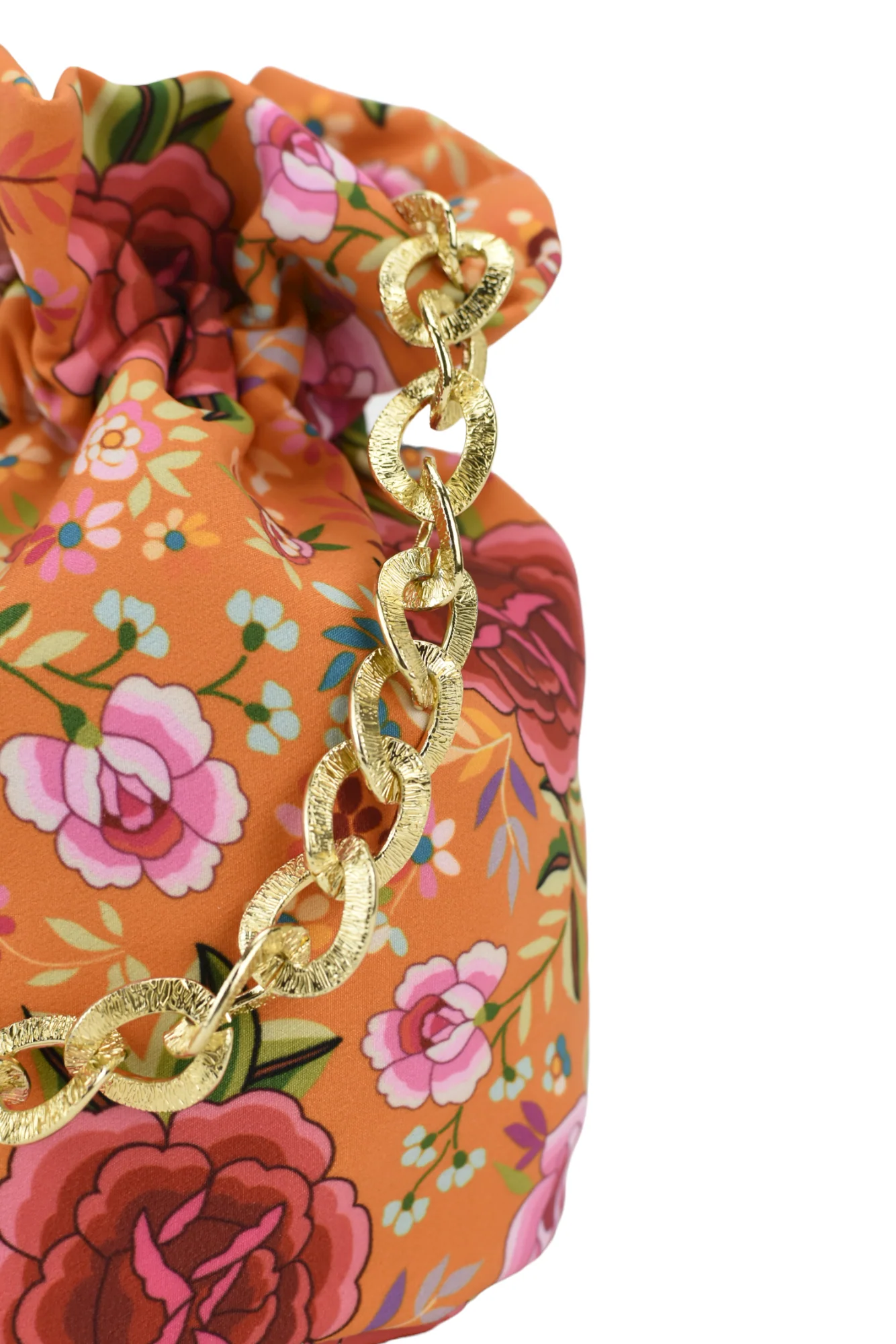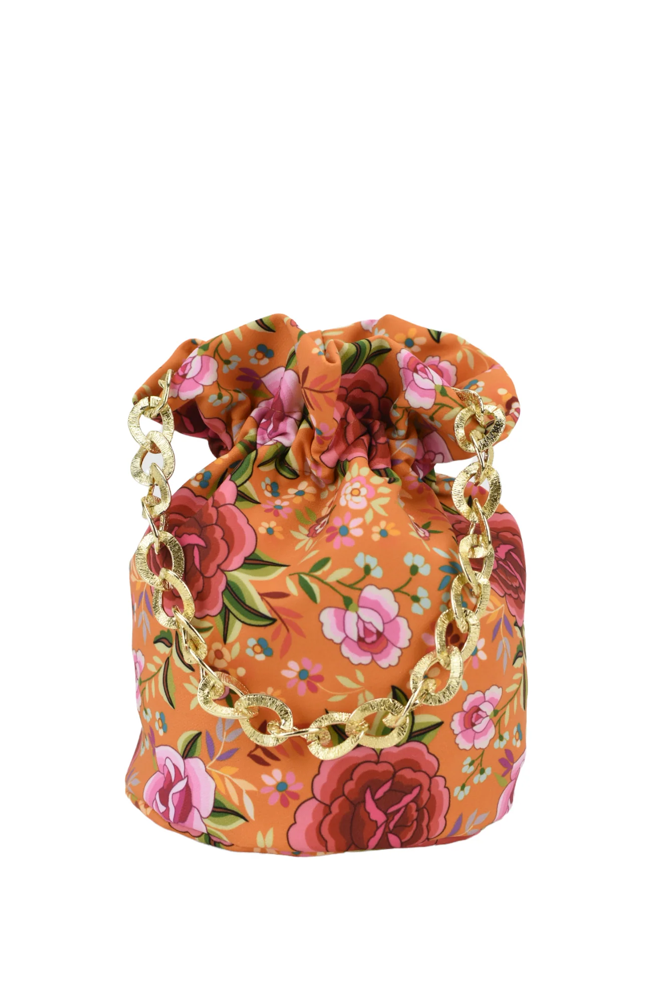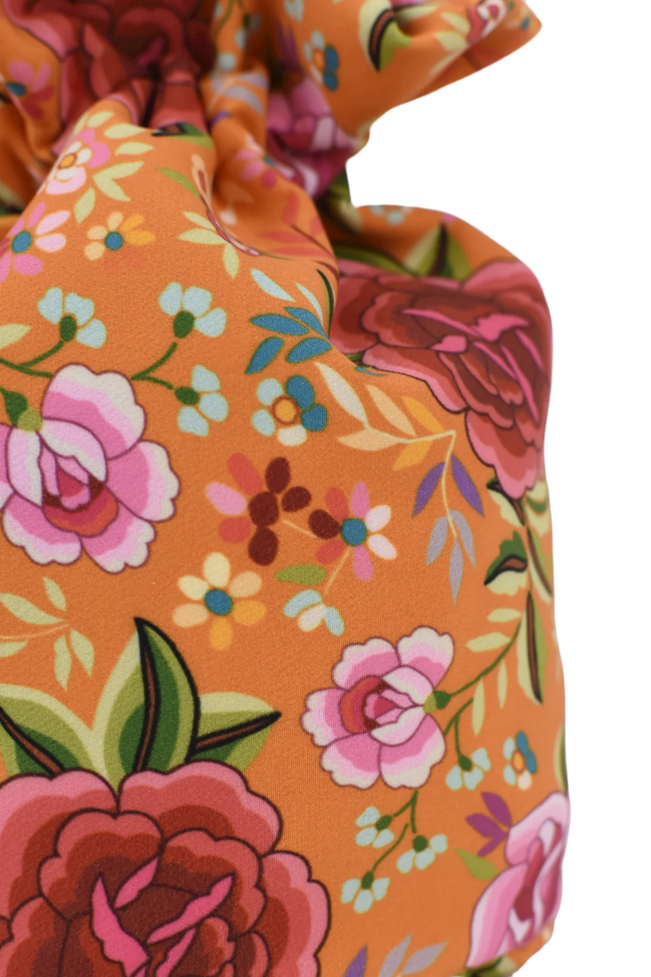 Bombonera confeccionada en bioel谩stico, estampado de flores con fondo en naranja. Interior forrado.