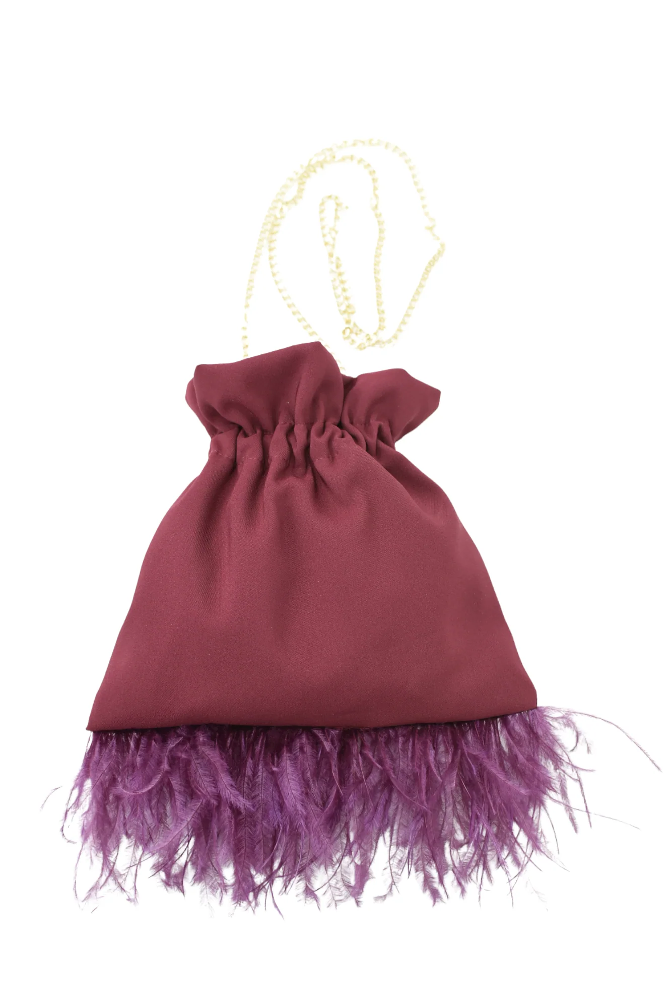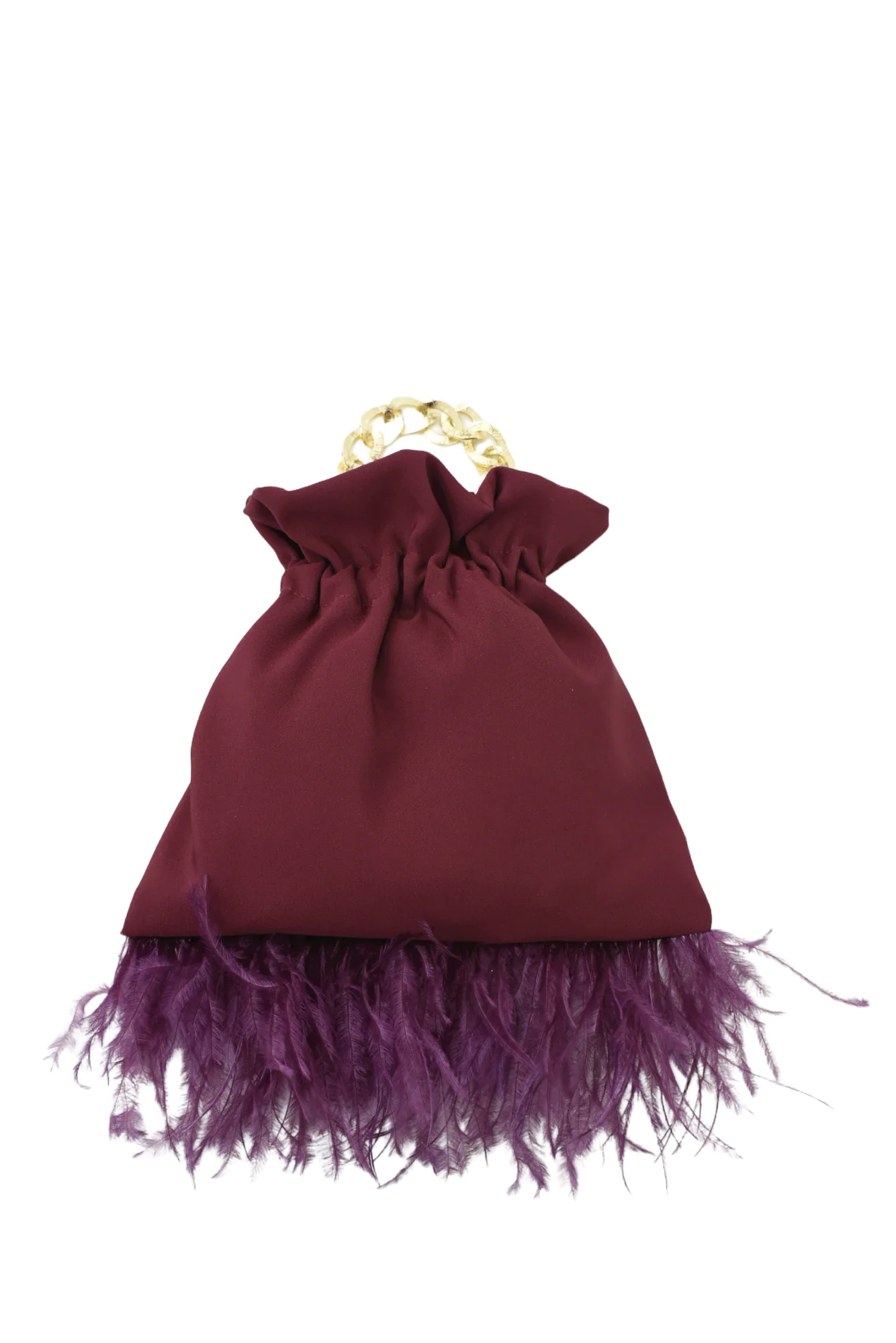 Bolso hecho a mano con tejido bielastico en color burdeo, forrado en su interior. Lleva dos cadenas en tono dorado, pero hay la opci贸n de ponerla en tono plata tambi茅n . Una es para llevar de la mano y la otra para colgar del hombro o bandolera. En su parte inferior lleva plumas lo que hace que le de un toque elegante y diferente. En la parte superior lleva una goma que evita que se puedan salir las cosas que deposites en su interior.