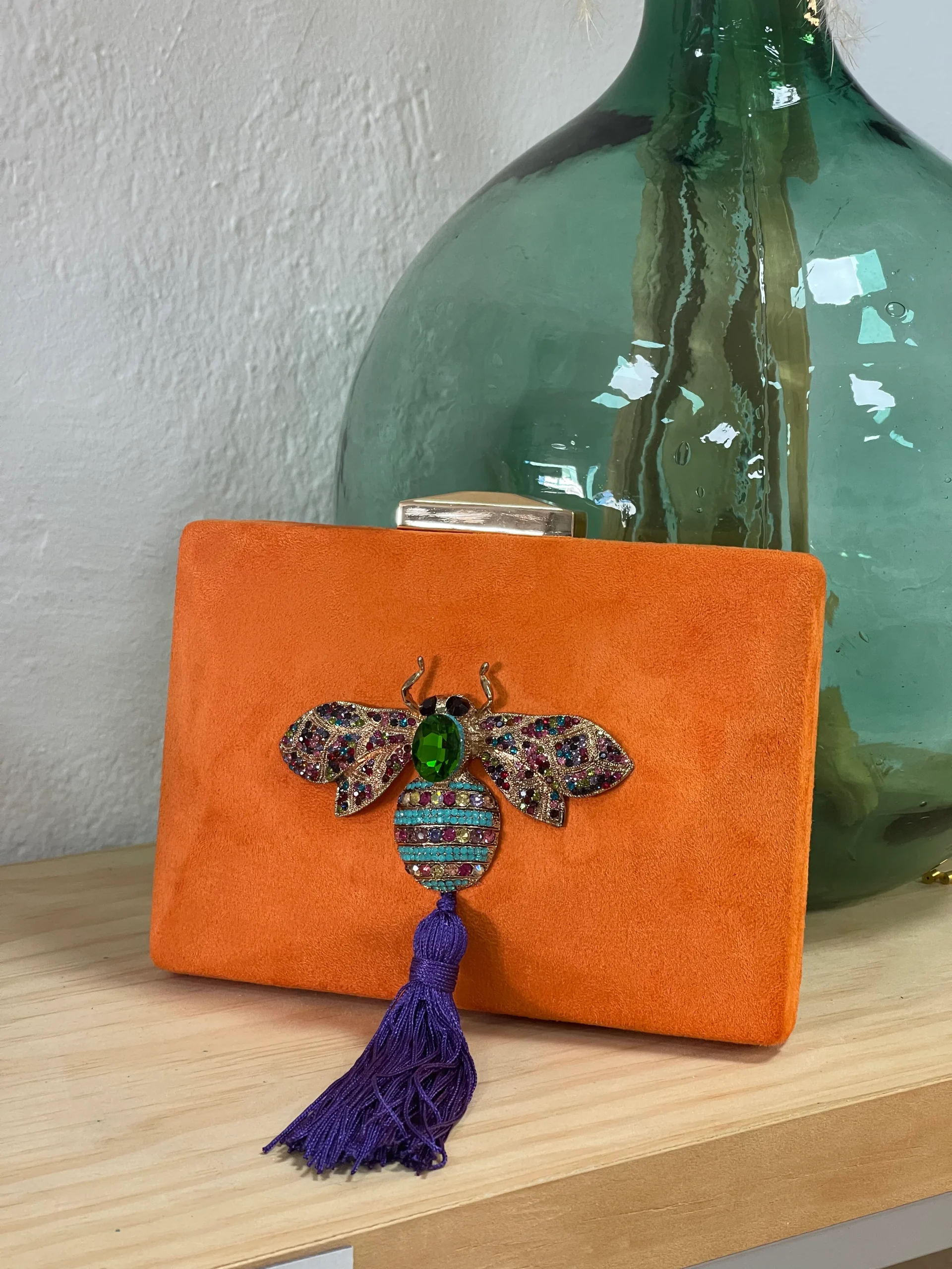 Bolso hecho a mano con tejido de muaré en color verde, forrado en su interior. Lleva dos cadenas en tono dorado, pero hay la opción de ponerla en tono plata también. Una es para llevar de la mano y la otra para colgar del hombro o bandolera. En su parte inferior lleva plumas lo que hace que le de un toque elegante y diferente. En la parte superior lleva una goma que evita que se puedan salir las cosas que deposites en su interior.