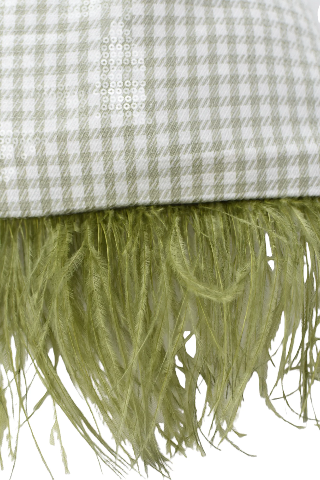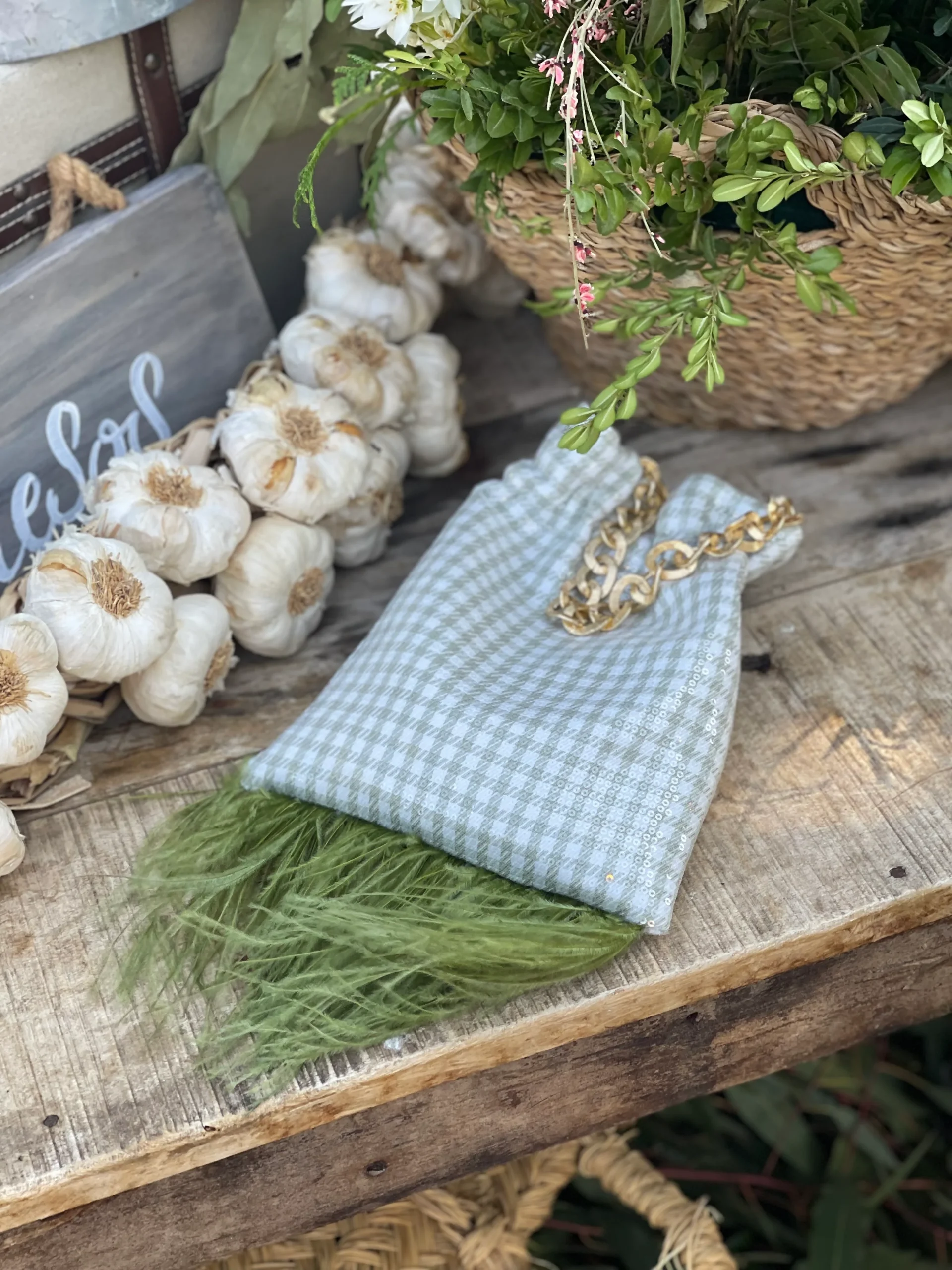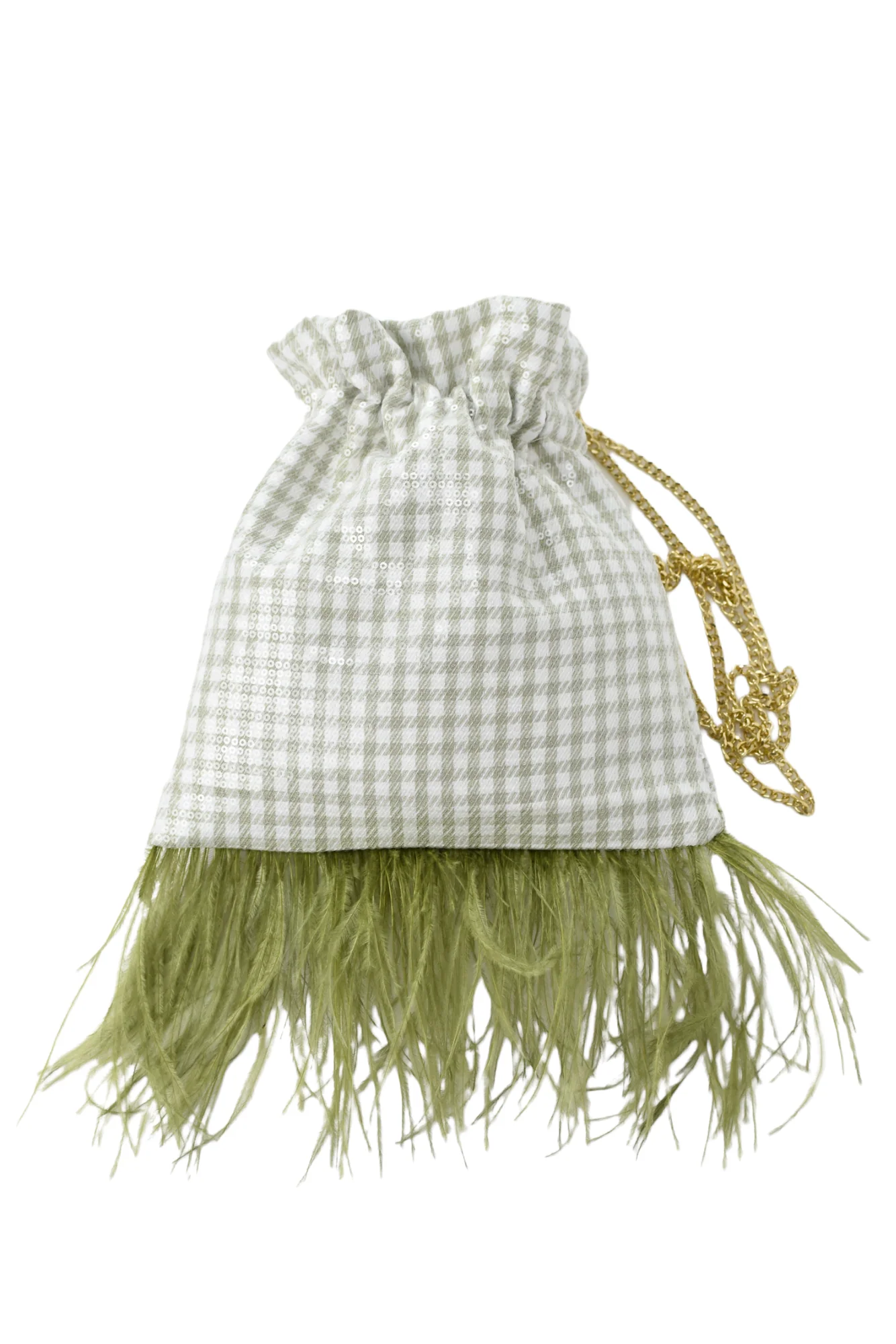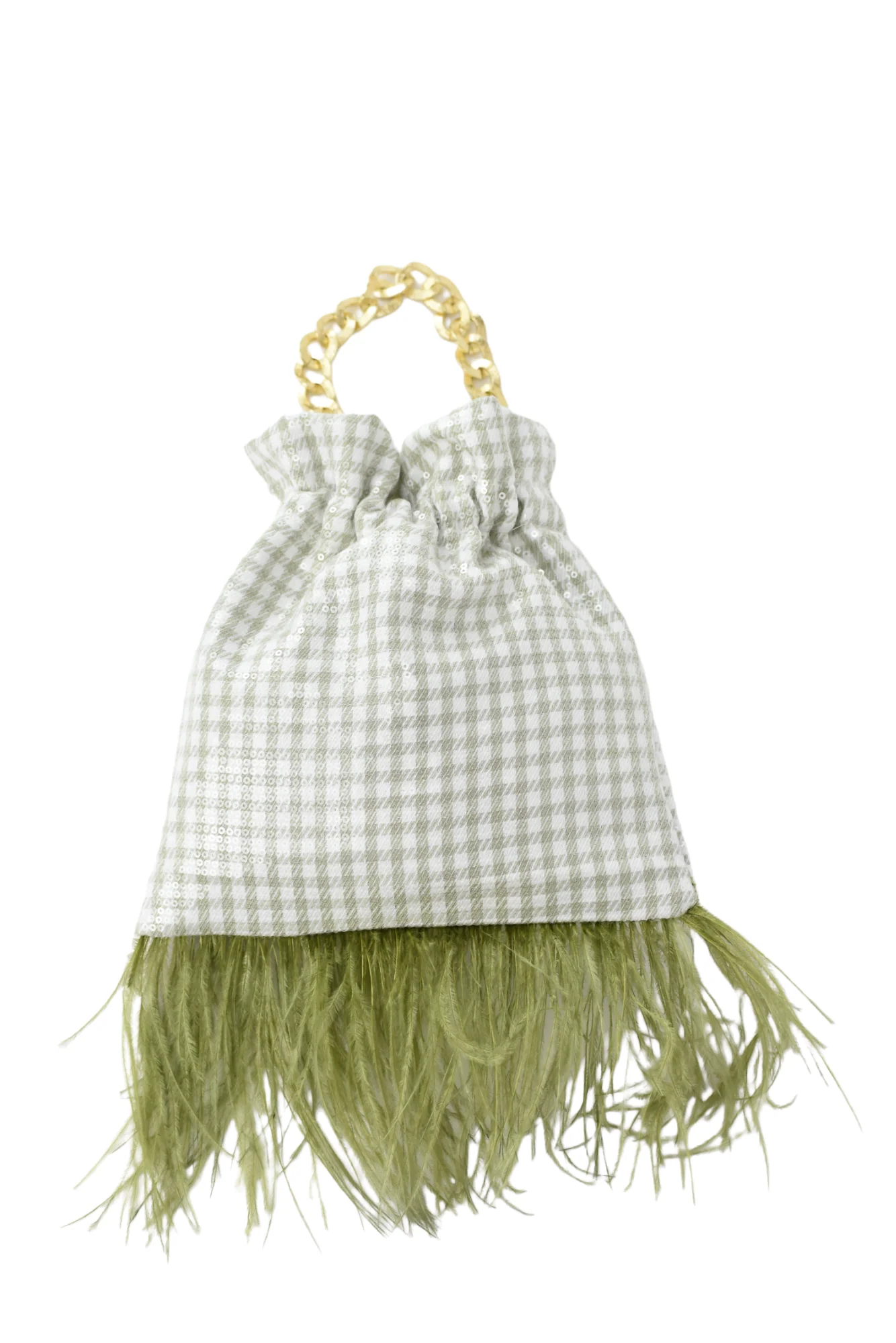 Bolso hecho a mano con tejido vichy lentejuelas color verde seco, forrado en su interior. Lleva dos cadenas en tono dorado, pero hay la opci贸n de ponerla en tono plata tambi茅n. Una es para llevar de la mano y la otra para colgar del hombro o bandolera. En su parte inferior lleva plumas lo que hace que le de un toque elegante y diferente. En la parte superior lleva una goma que evita que se puedan salir las cosas que deposites en su interior.