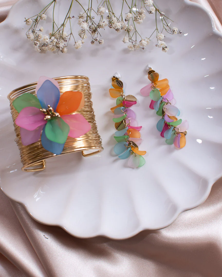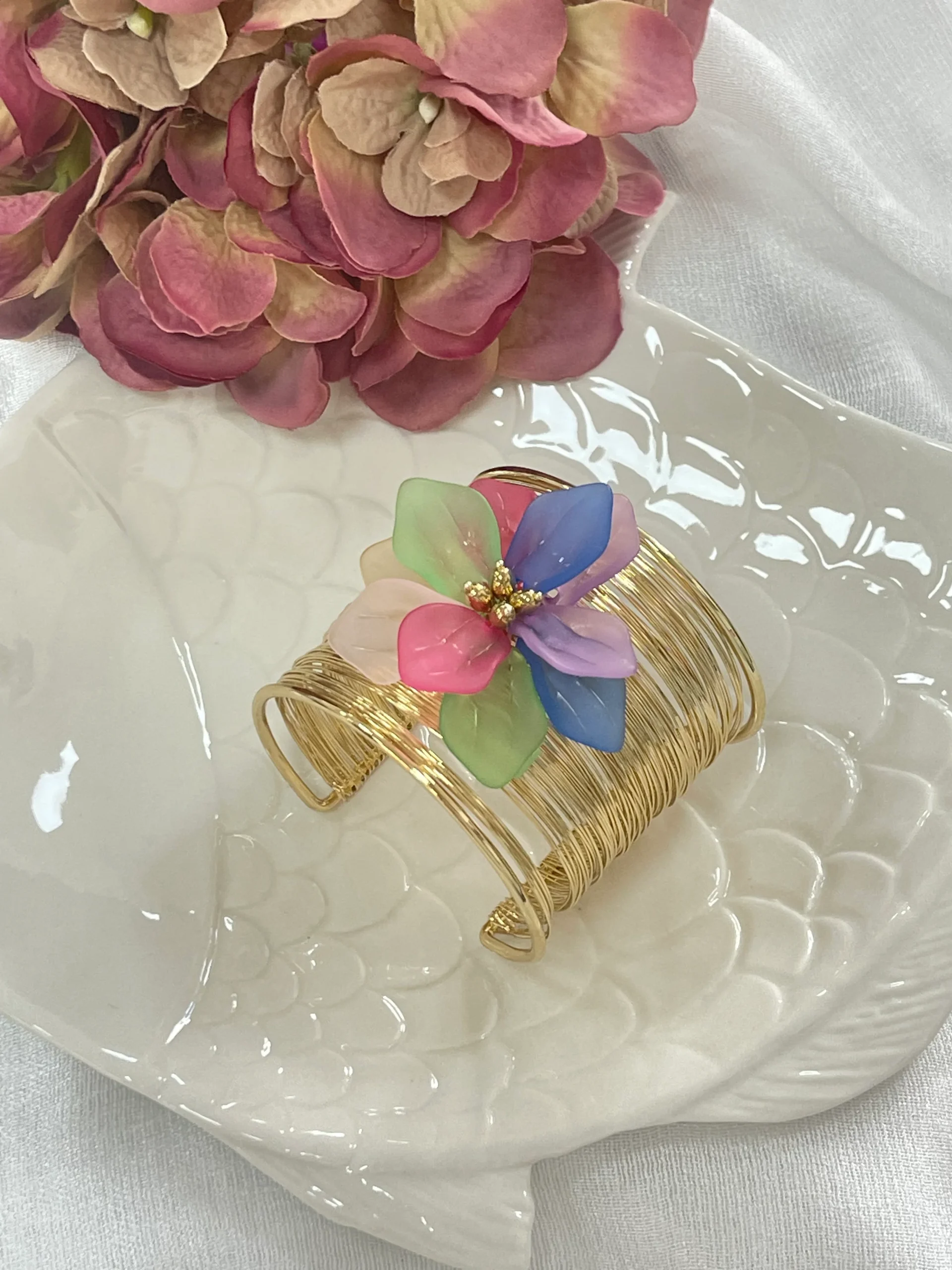 Brazaletes metalizado adaptable con Flor resina multicolor.