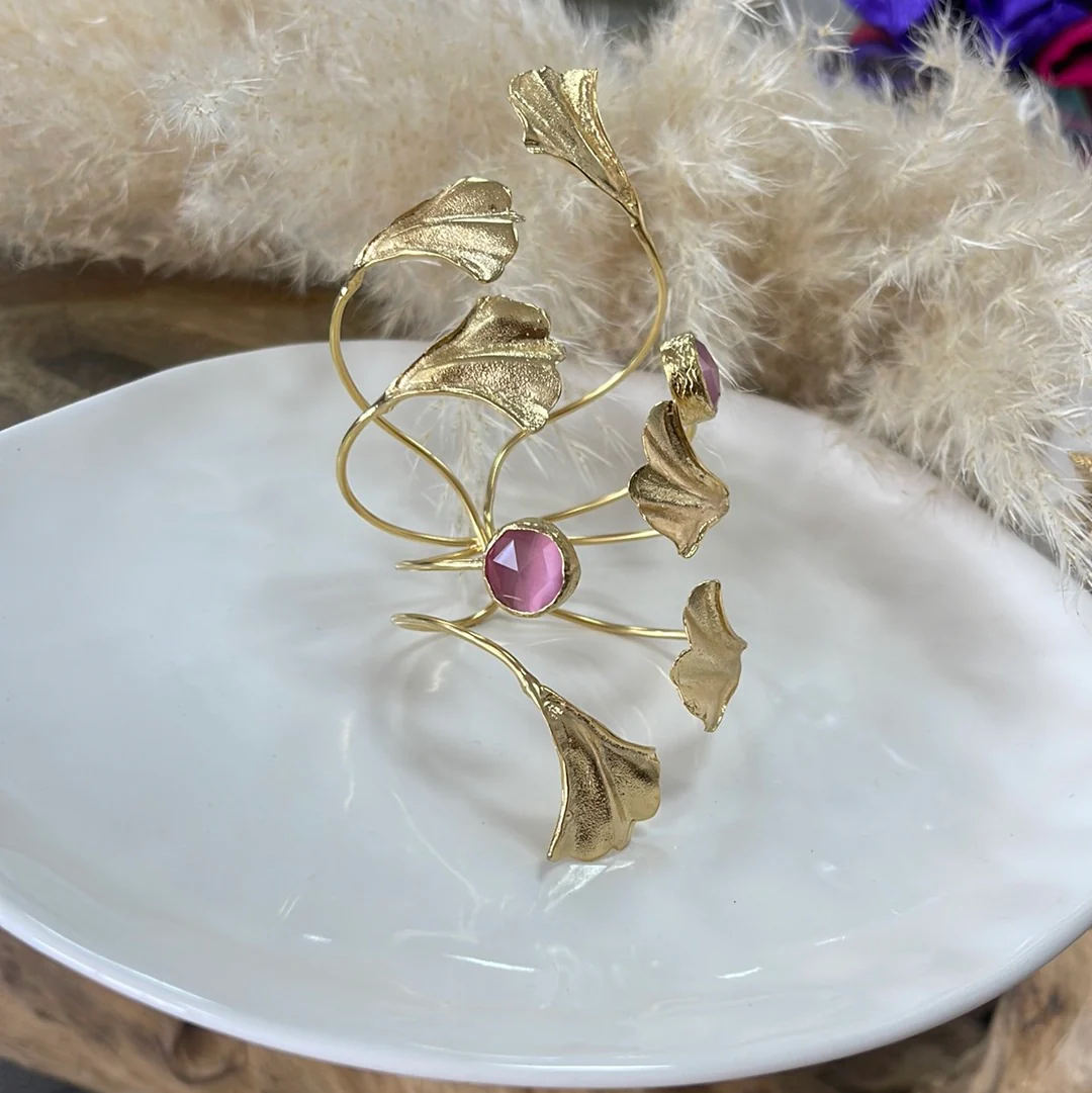 Hecho a mano en bronce laminado con un ba帽o en oro de 24k . Lleva piedras naturales en color rosa . Es adaptable.