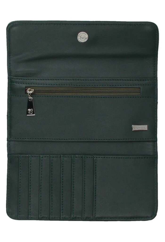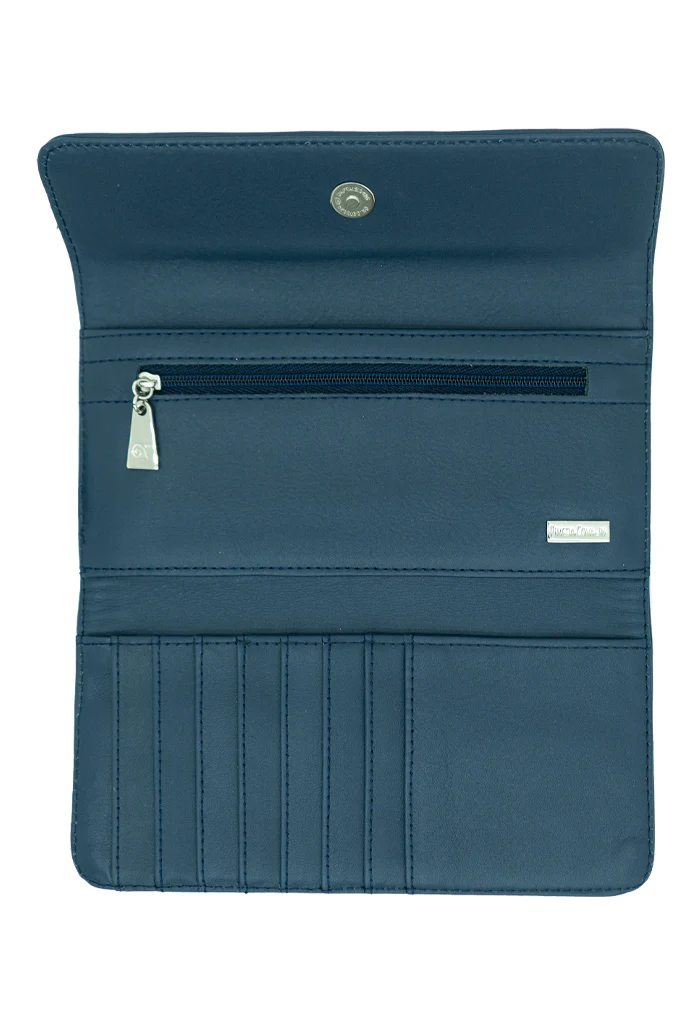 Cartera con compartimentos para billetes y tarjetas. Cuenta con cierre para almacenar monedas.