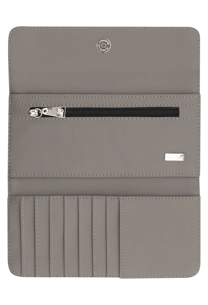 Cartera con compartimentos para billetes y tarjetas. Cuenta con cierre para almacenar monedas.