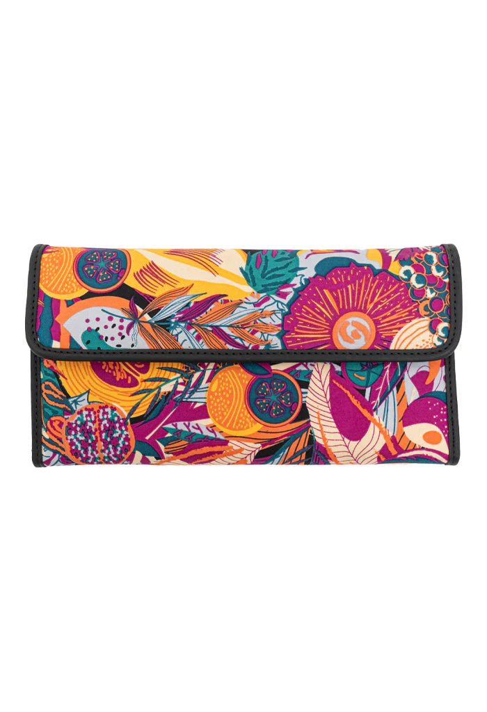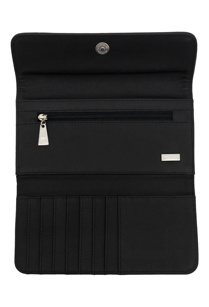 Cartera con compartimentos para billetes y tarjetas. Cuenta con cierre para almacenar monedas.