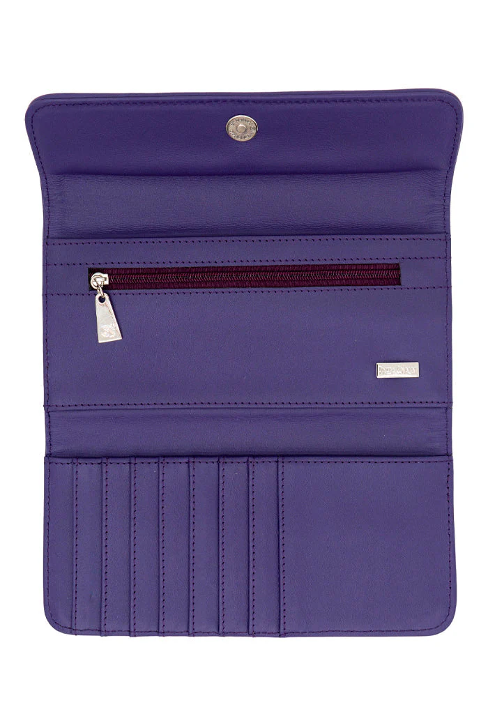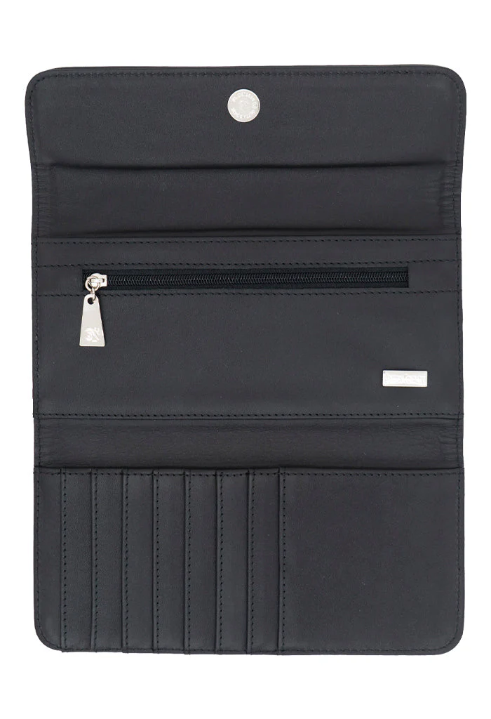 Cartera con compartimentos para billetes y tarjetas. Cuenta con cierre para almacenar monedas.