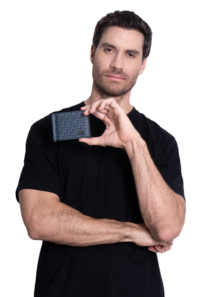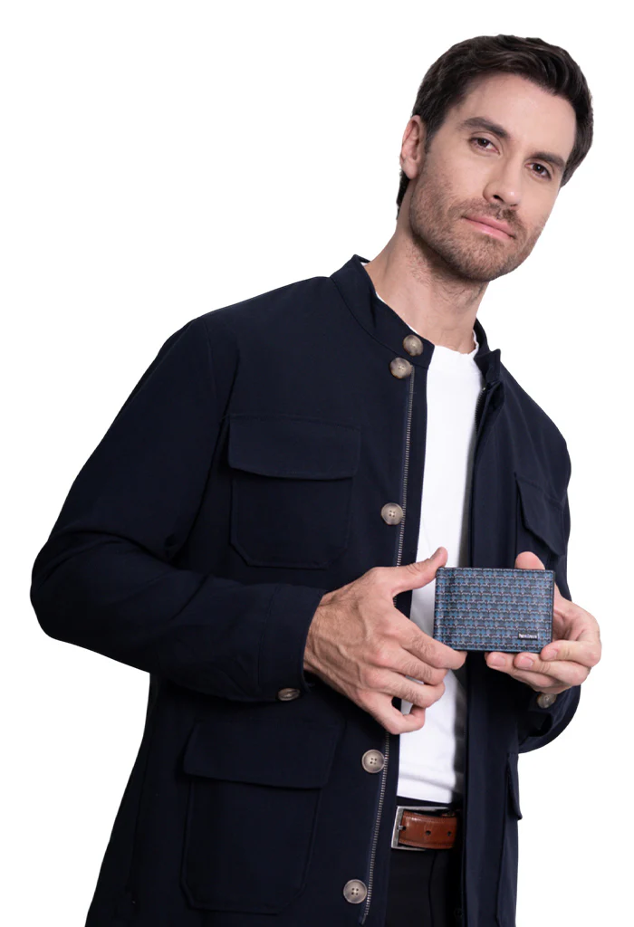Cartera estampada para hombre con ocho tarjeteros interiores y clip para billetes.