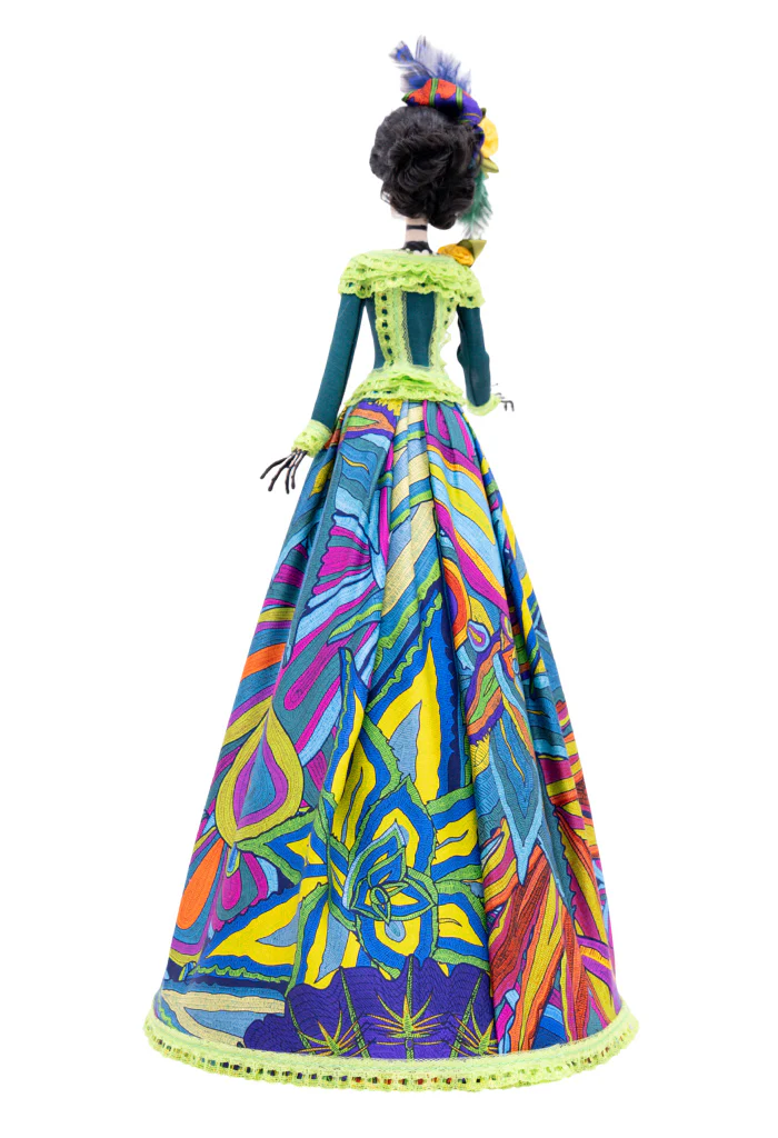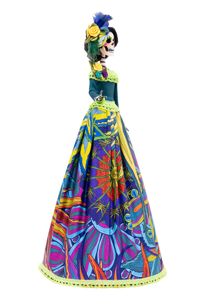 Pieza artesanal con la figura de una catrina cuyo elegante vestir plasma las tradiciones de la cultura mexicana.
