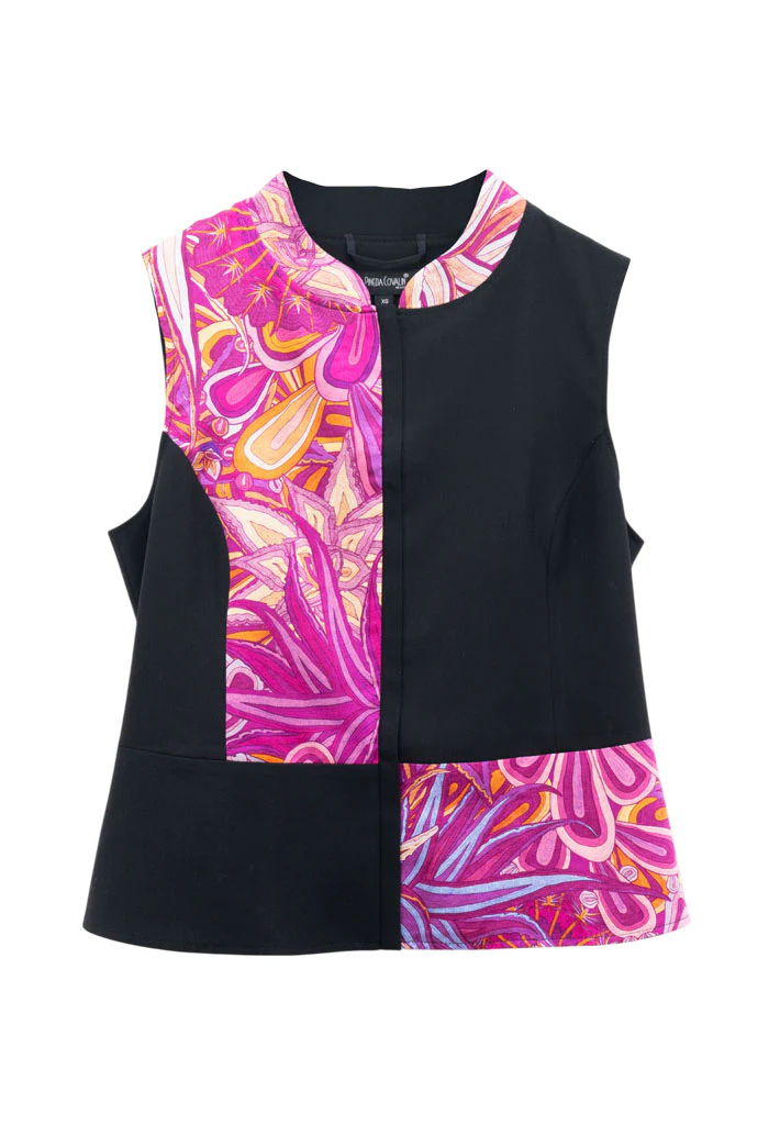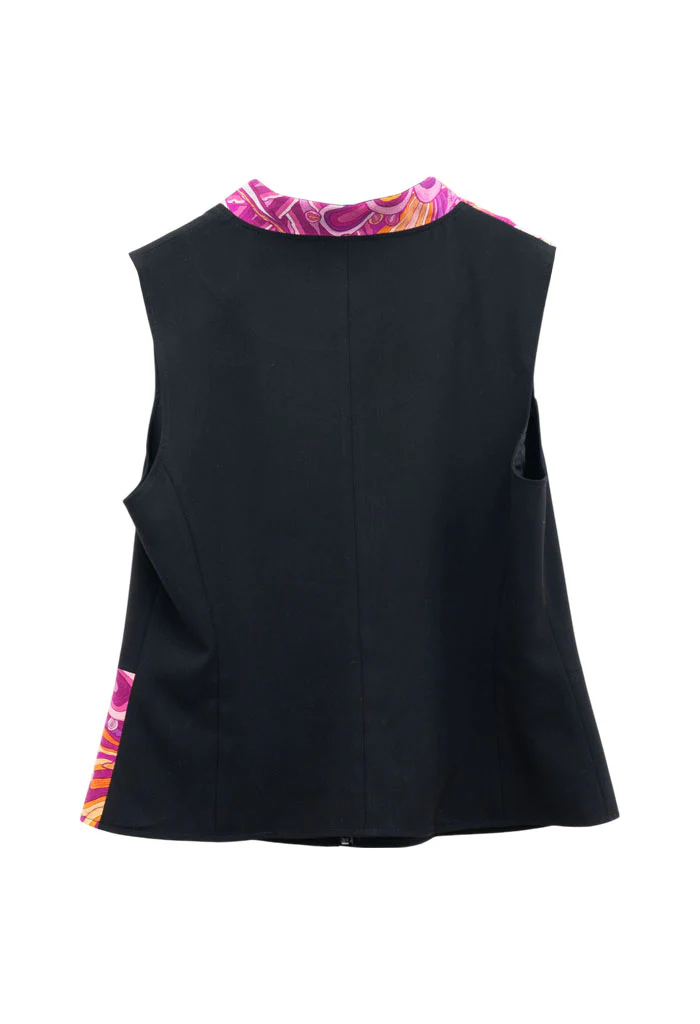Chaleco liso en corte recto con aplicaciones estampadas a contraste y cuello estilo mao.