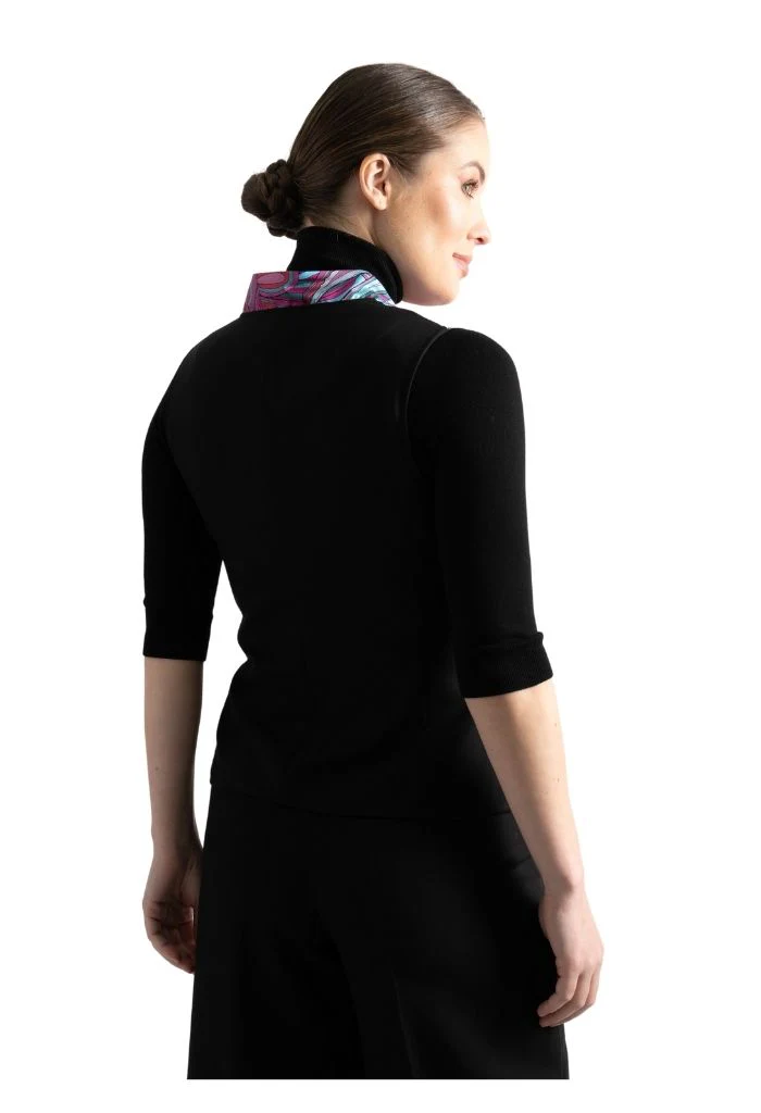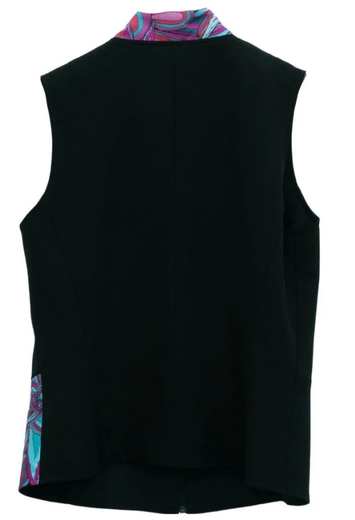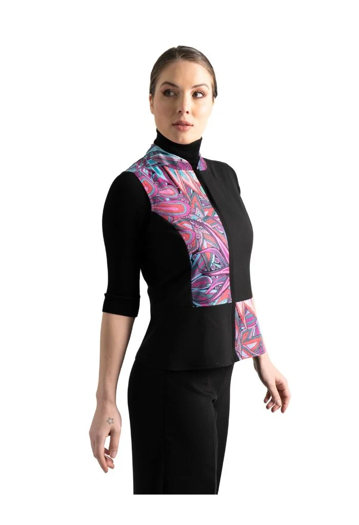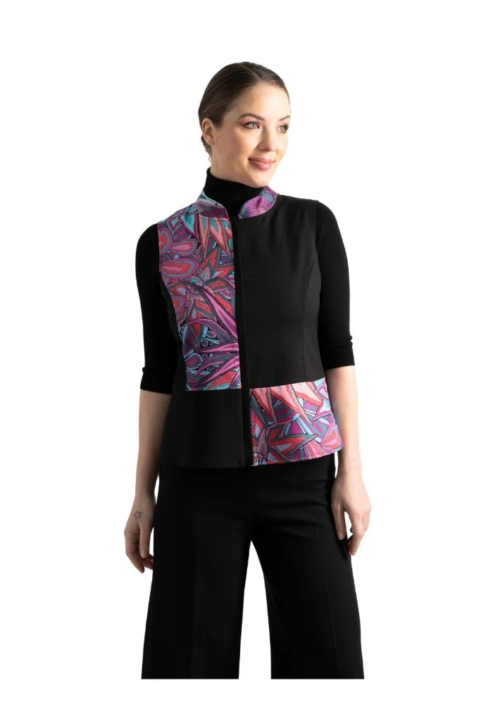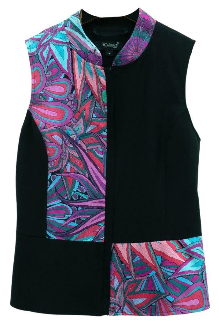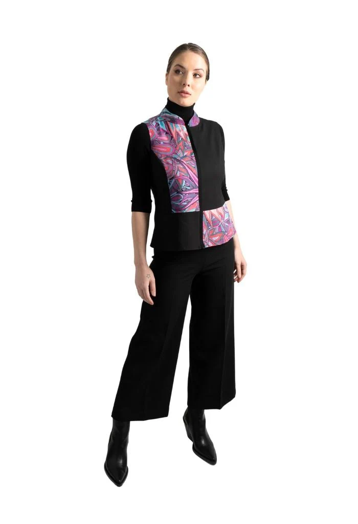 Chaleco liso en corte recto con aplicaciones estampadas a contraste y cuello estilo mao.