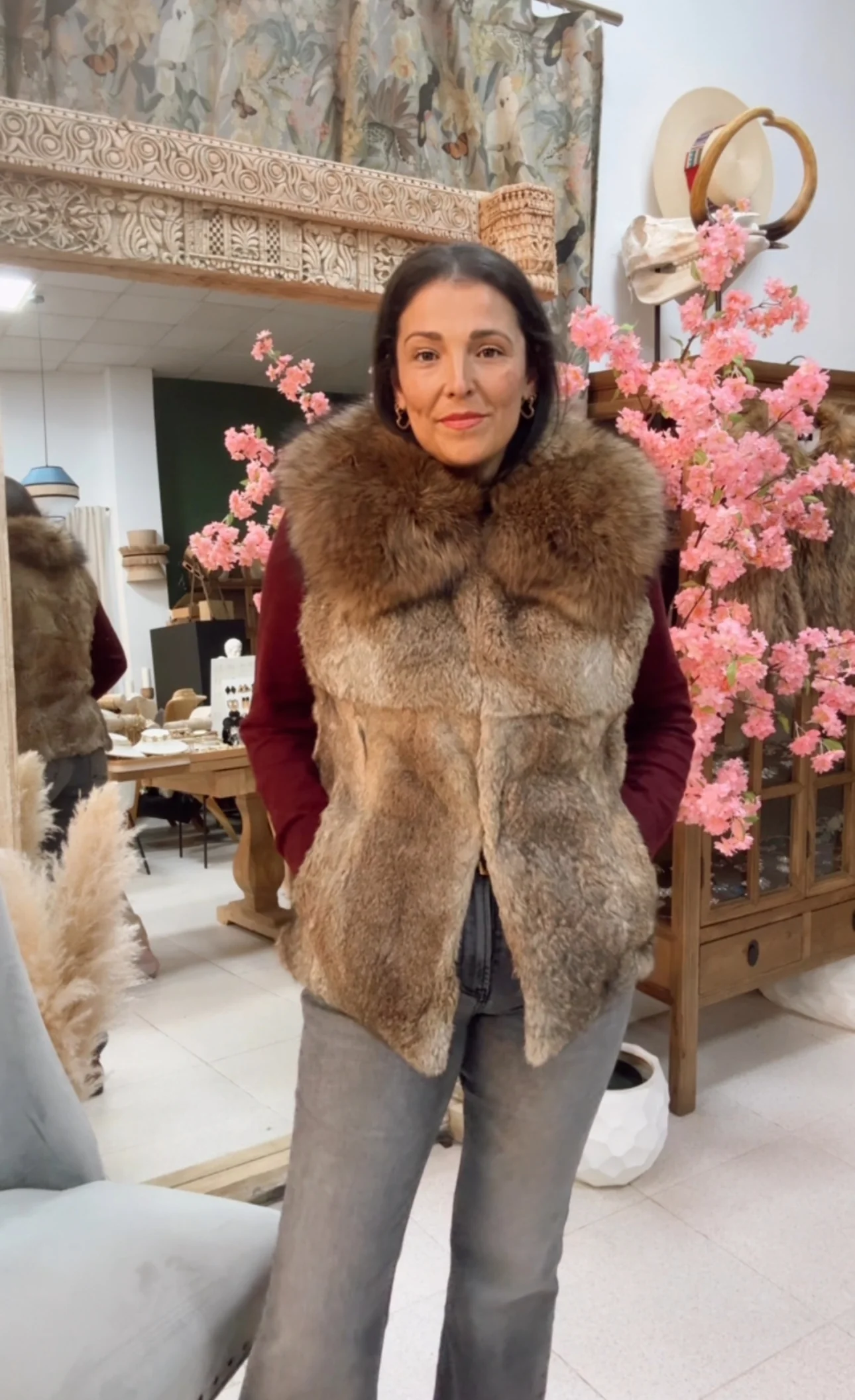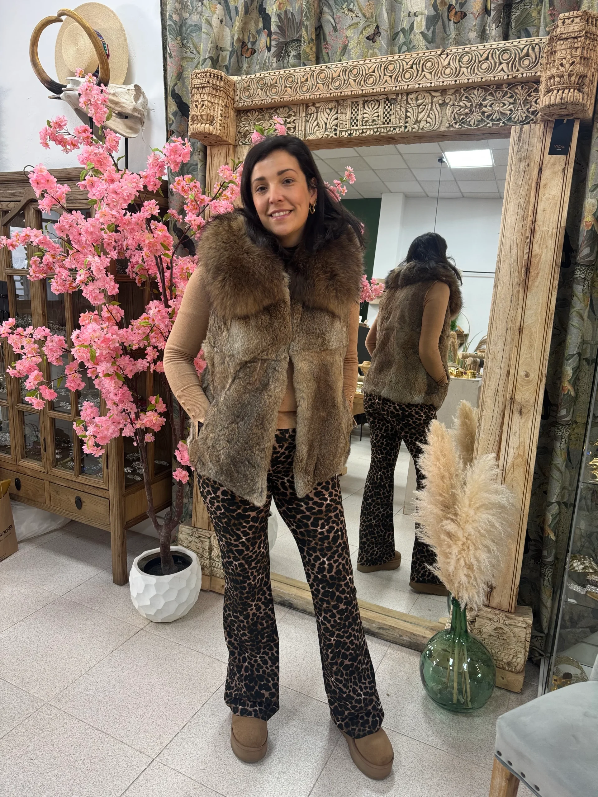 Chaleco en Piel Natural con cuello, lleva bolsillos y est谩 forrado en su interior. Tiene varios cierres en el frontal para poder abrocharlo. Piel del cuerpo Rabbit , piel del cuello Fox. El color de la Piel al ser Natural puede variar del de la foto.