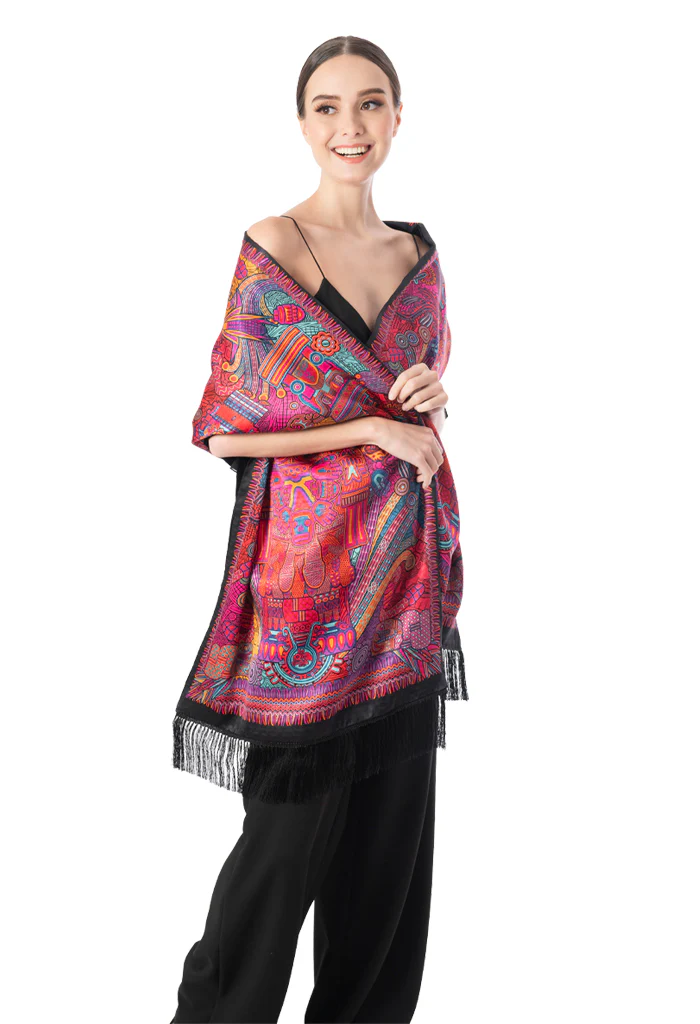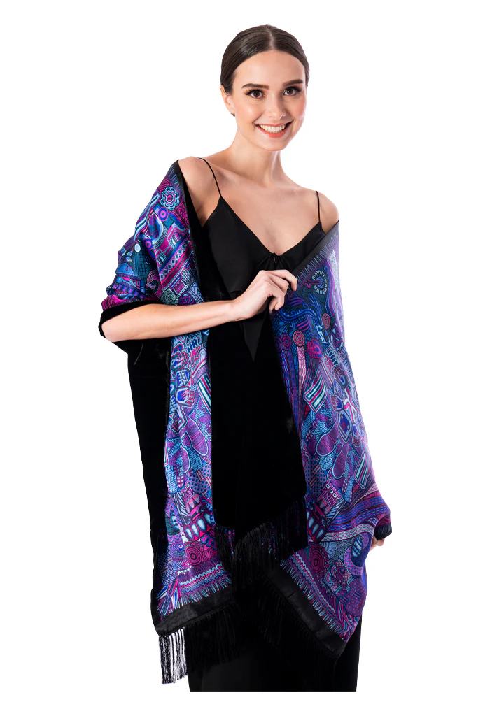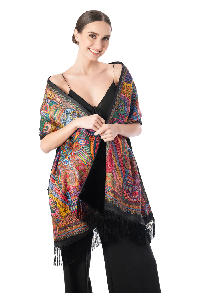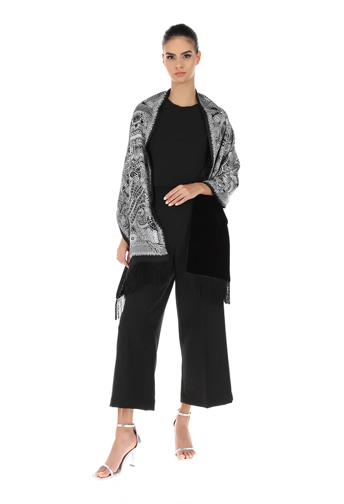 Chalina con terciopelo en tono que combina con el dise帽o y flecos a juego.