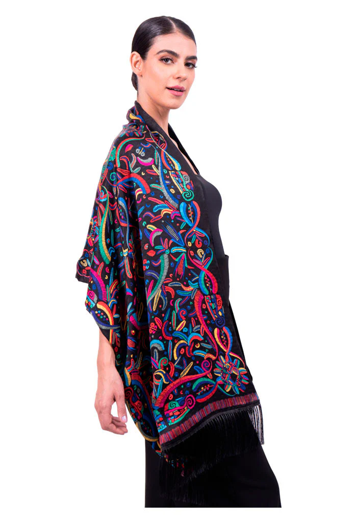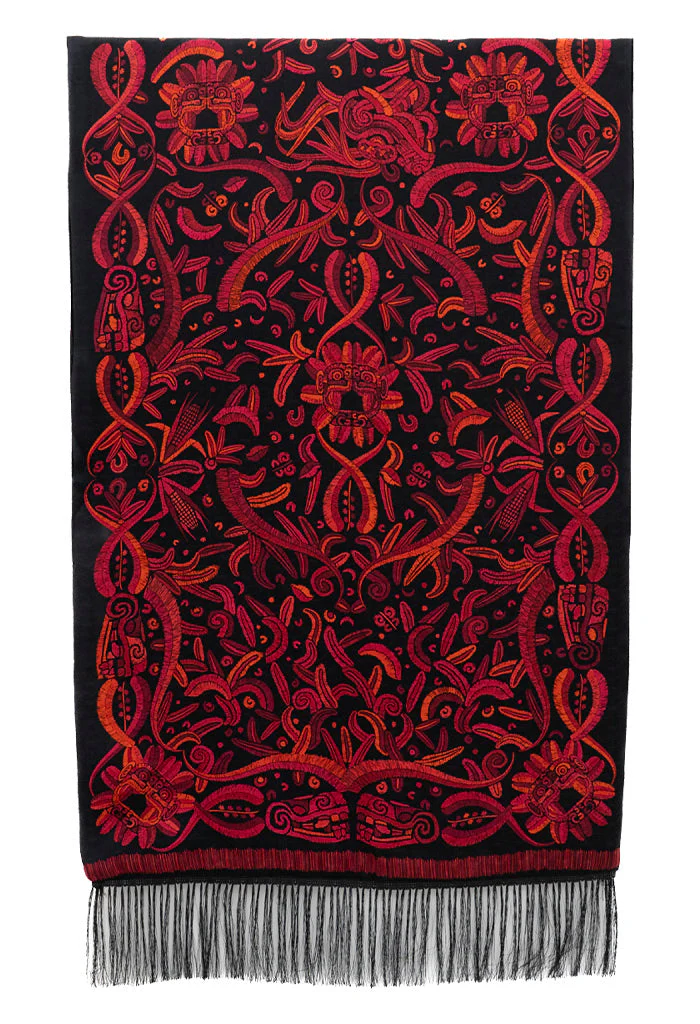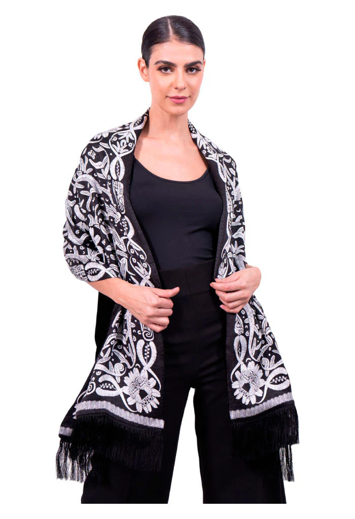 Chalina con terciopelo en tono que combina con el diseño y flecos a juego.