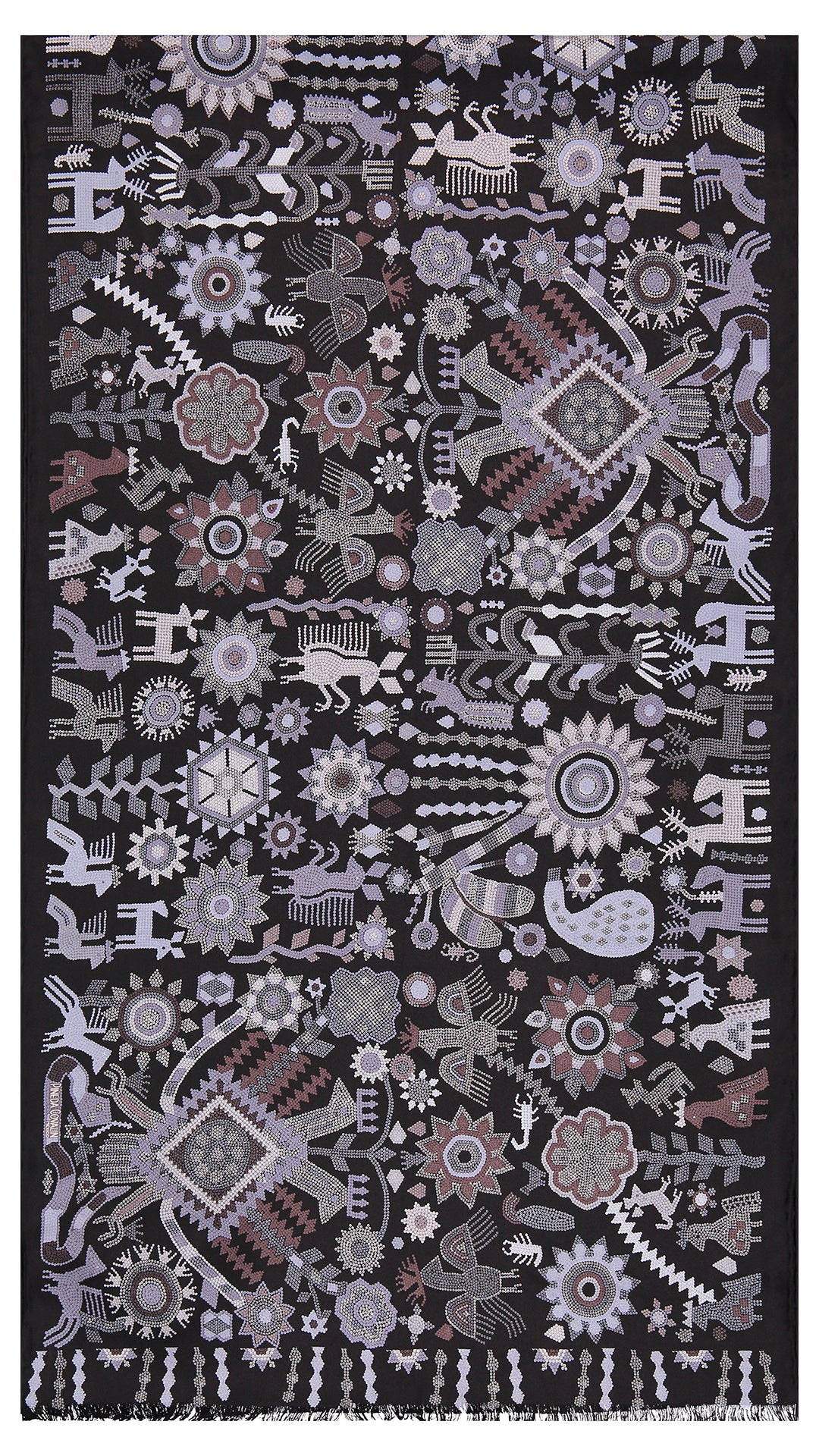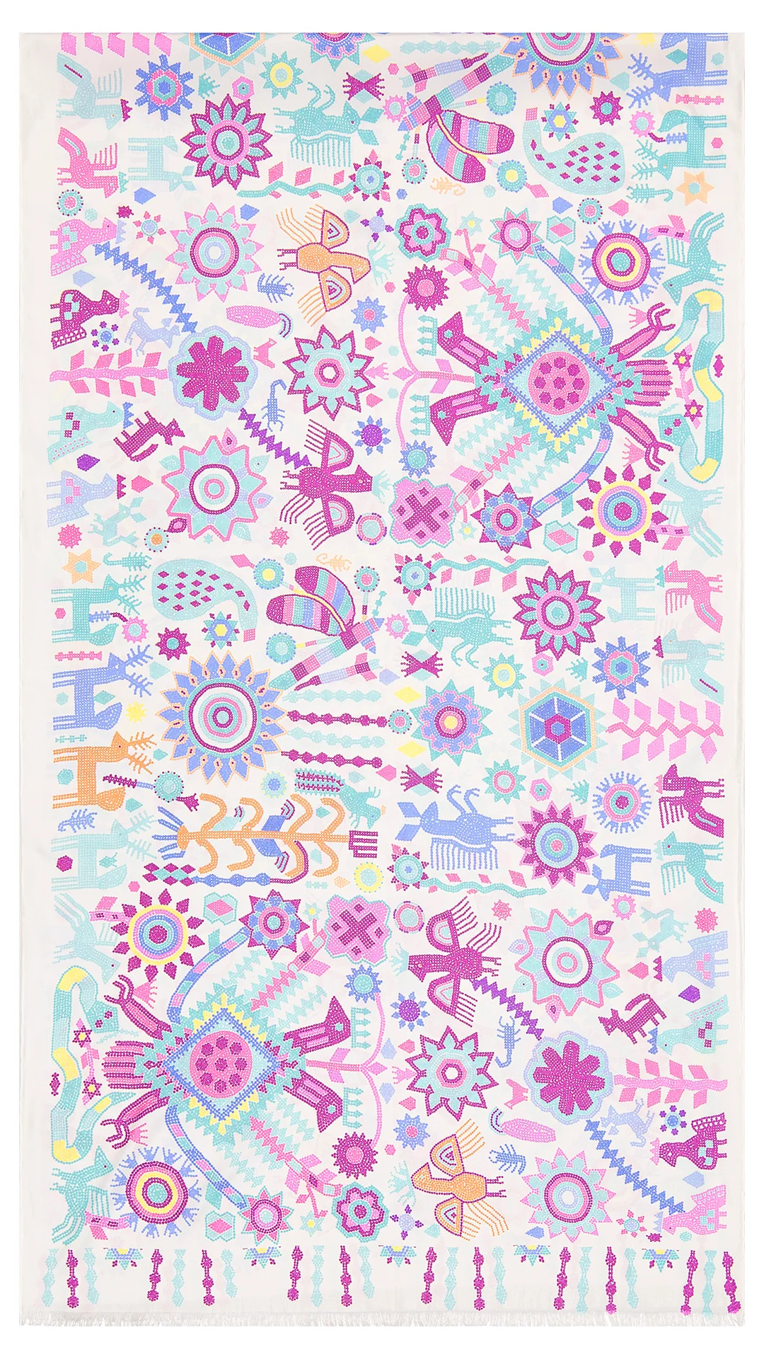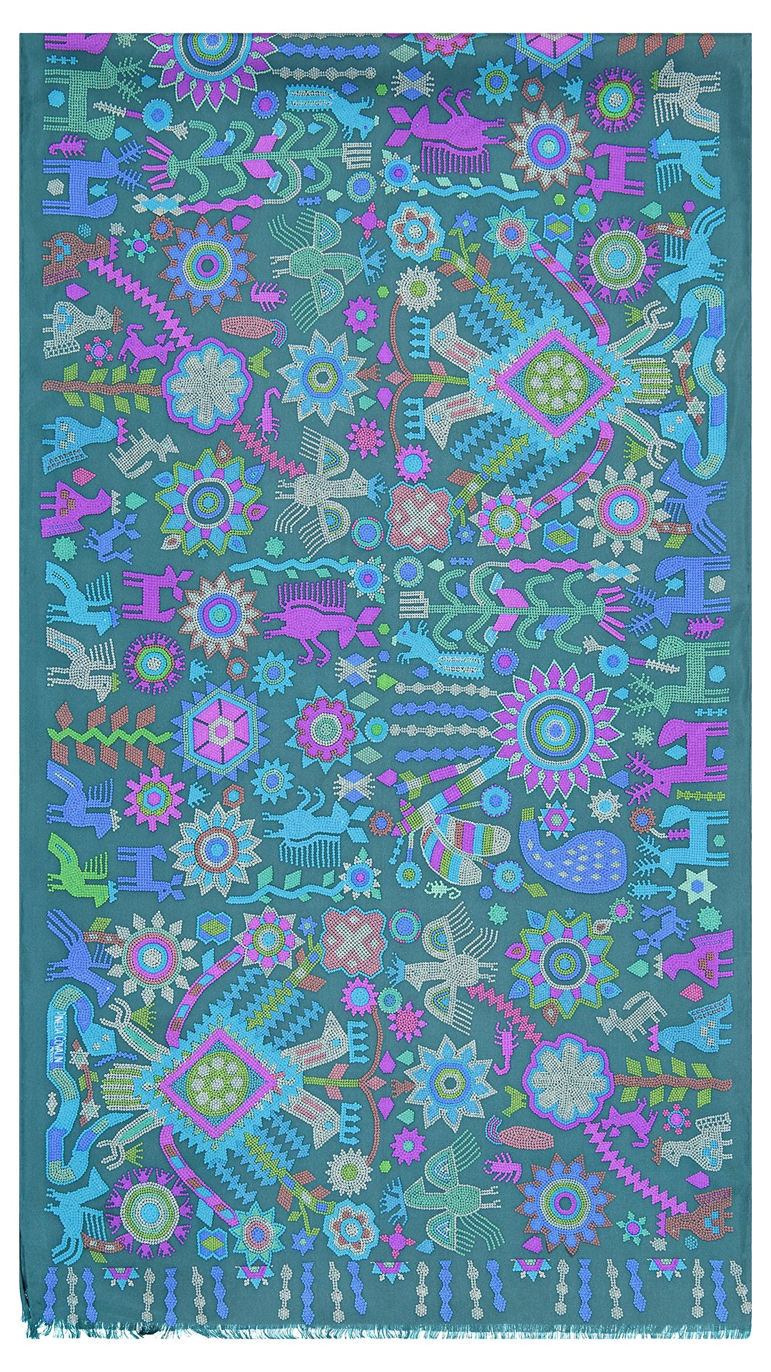 Diseño inspirado en la obra huichol “Visión de un Mundo Místico” realizada en chaquira sobre madera por el Chamán y artista Santos Motoaopohua de la Torre Santiago, Colección del Museo Zacatecano del Gobierno del Estado de Zacatecas. Las numerosas figuras de aves, venados, ardillas, plantas, flores, bules, entre otras, encierran un simbolismo profundo y son representaciones de la cosmogonía y mitología huichol. Destacan un águila bicéfala, la “Madre Joven Águila”, espíritu del cielo, del mundo de las almas y los antepasados, así como las varas emplumadas “muvielis”, el objeto más importante del Marakame o Chamán, gracias al cual puede contar, curar, buscar a los muertos y comunicarse con los dioses. Crédito y convenio: Santos Motoaopohua de la Torre Santiago