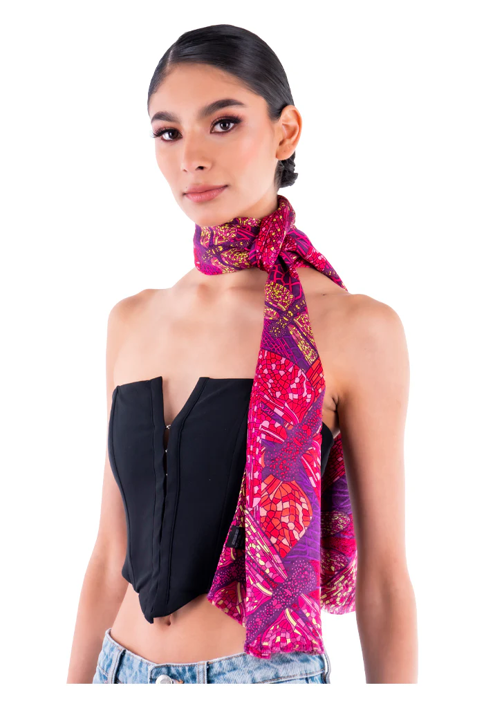 Chalina con orilla cosida y flecos deshilados a mano.
