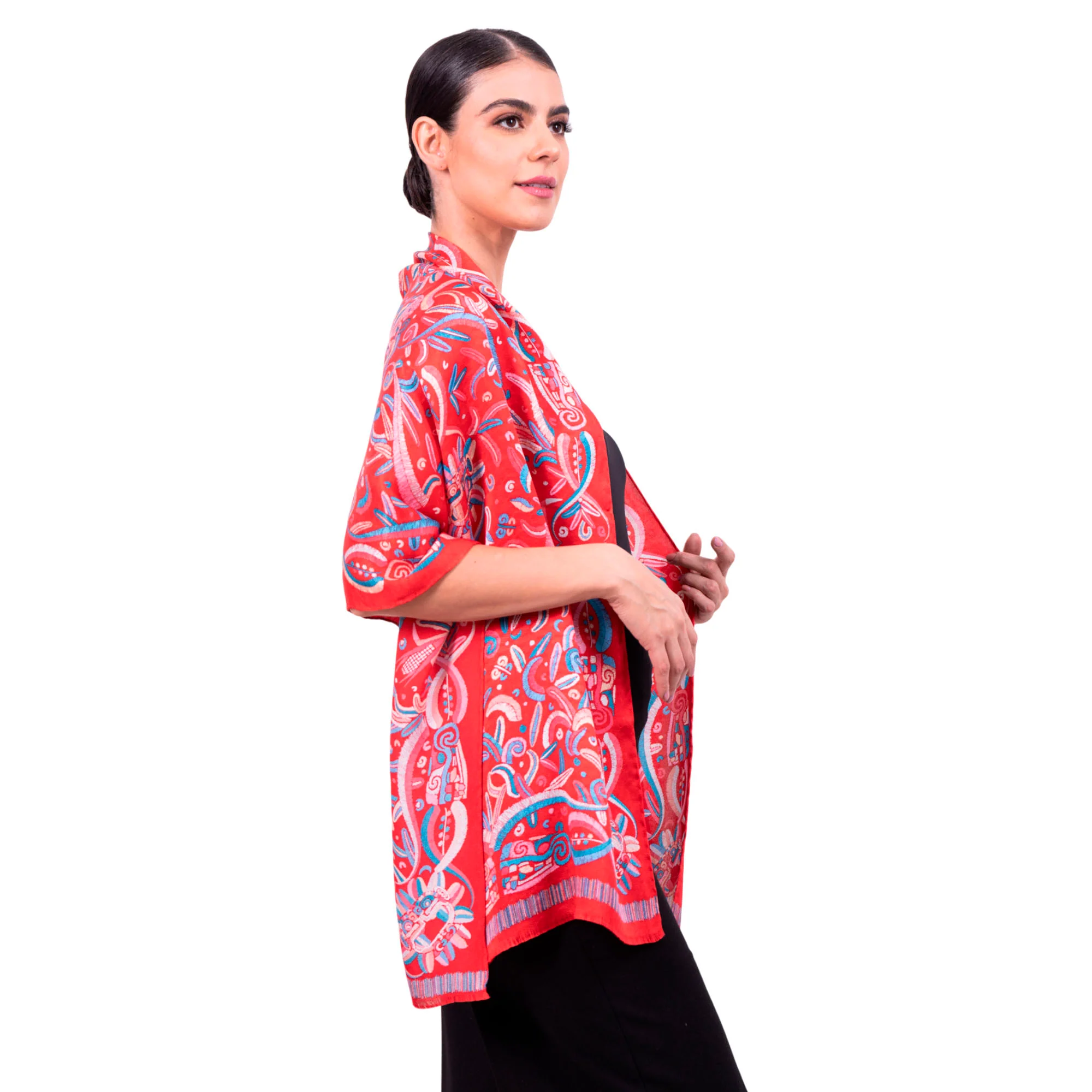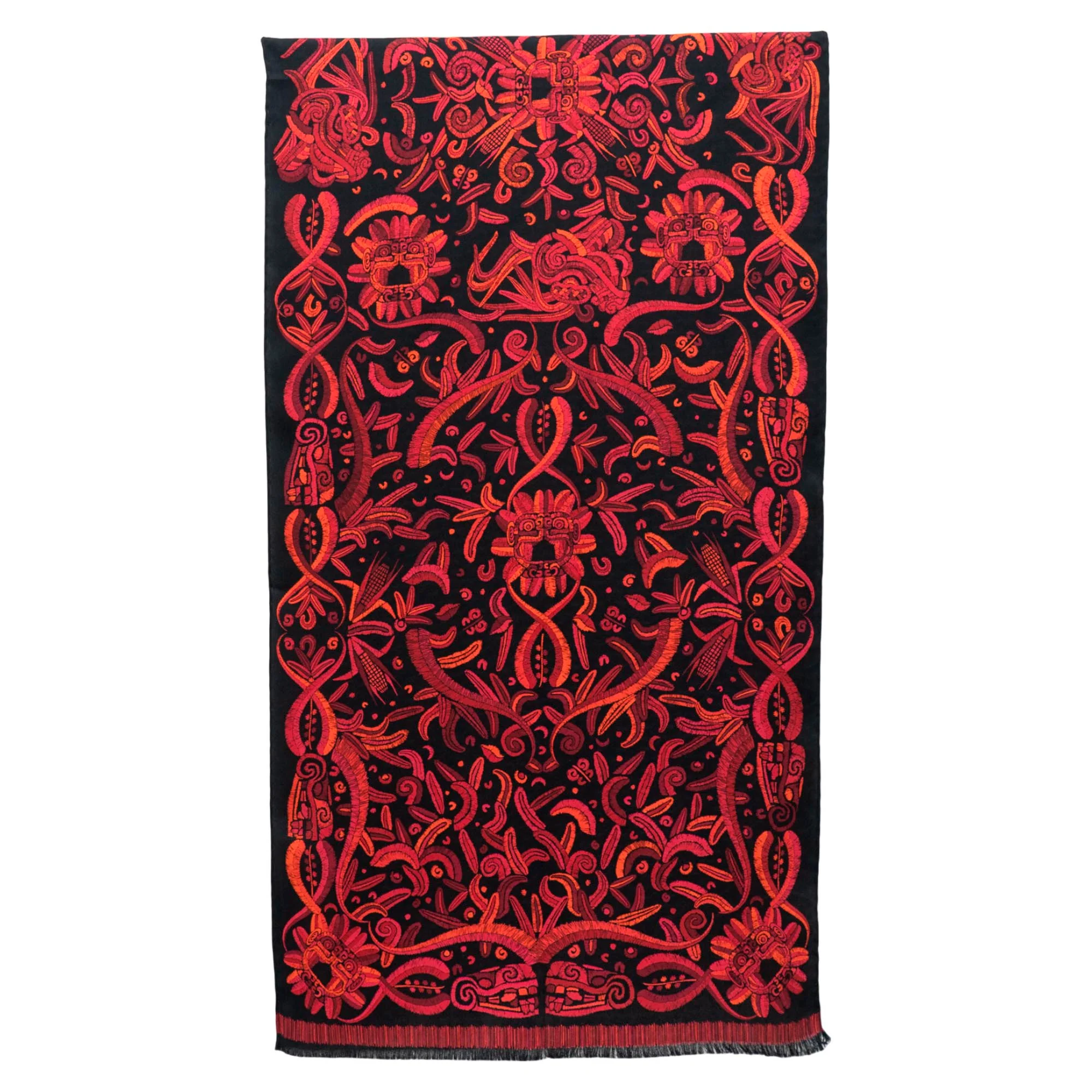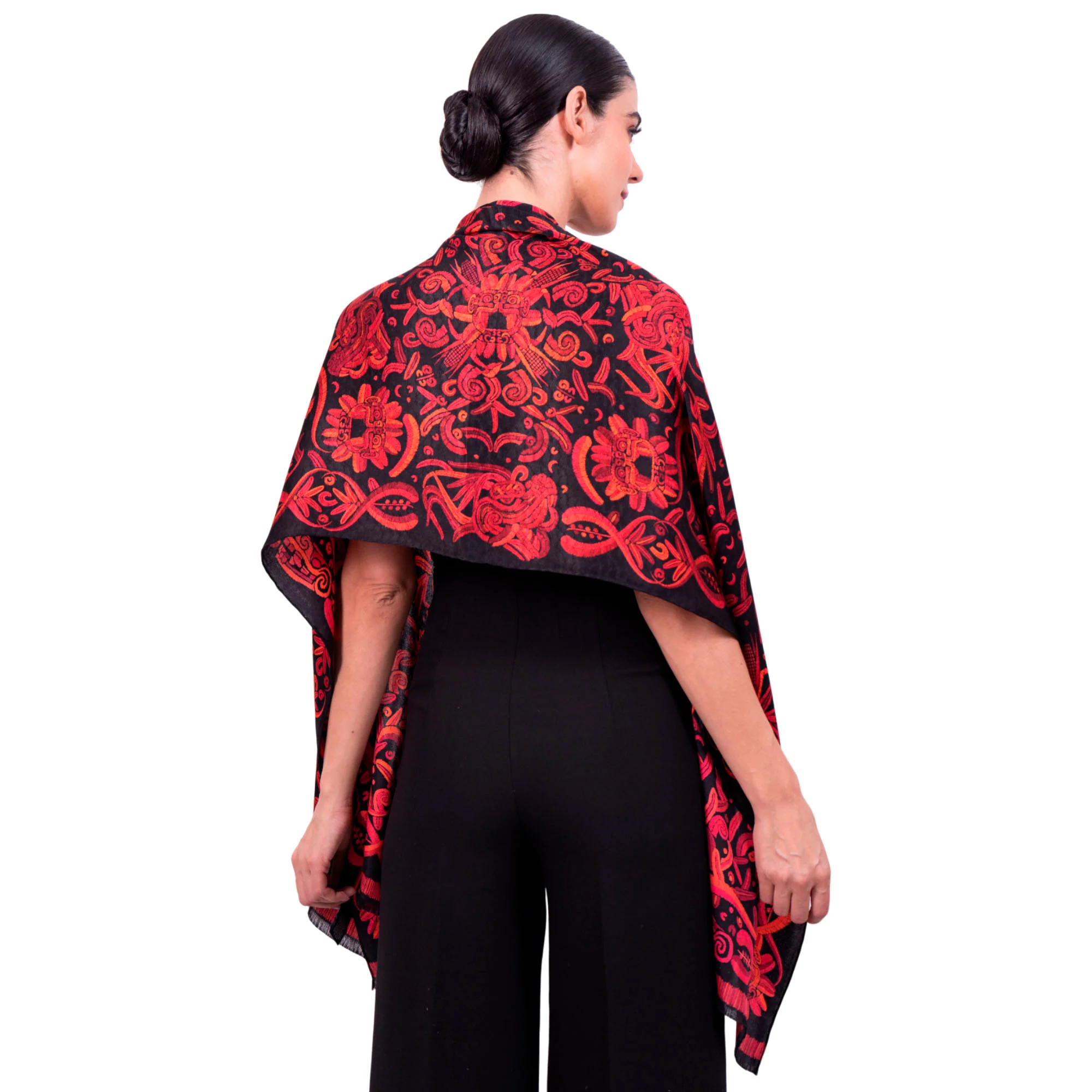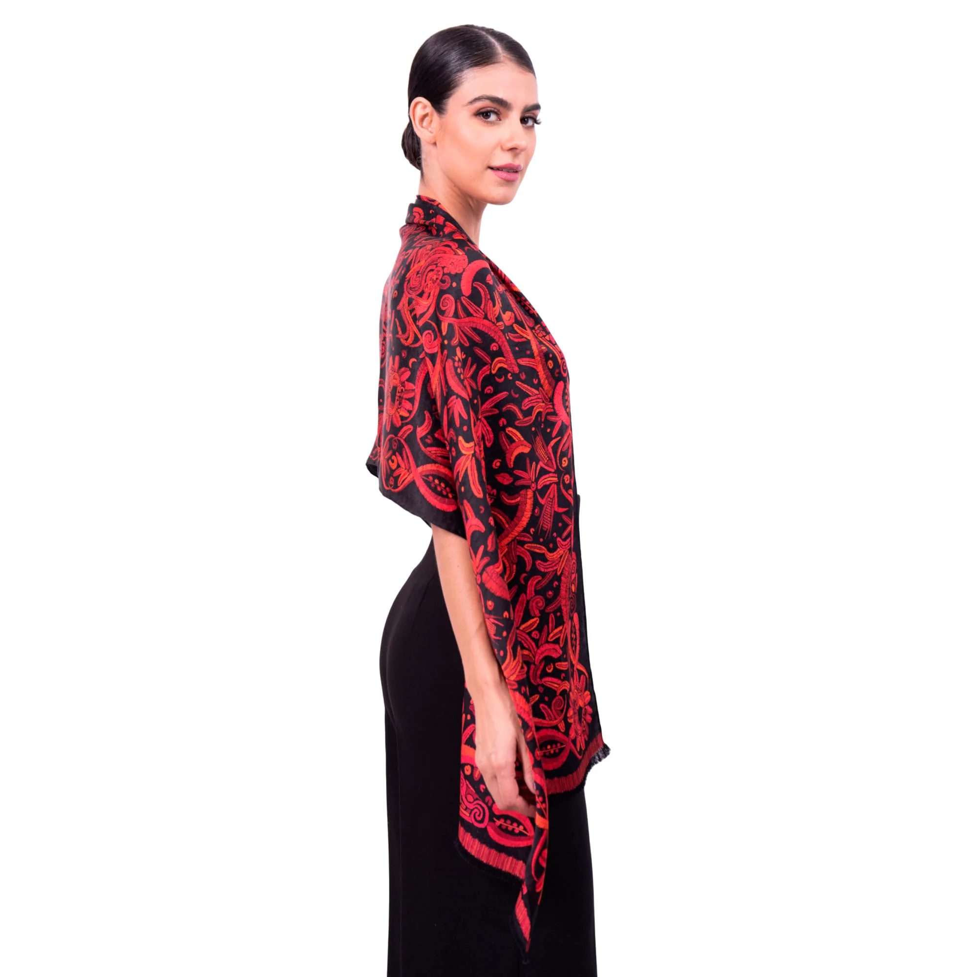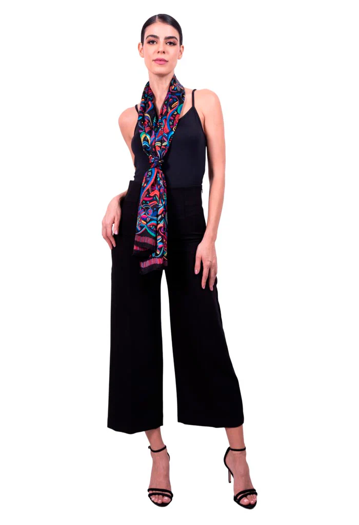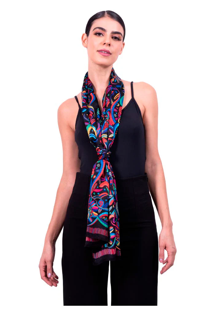Chalina con orilla cosida y flecos deshilados a mano.