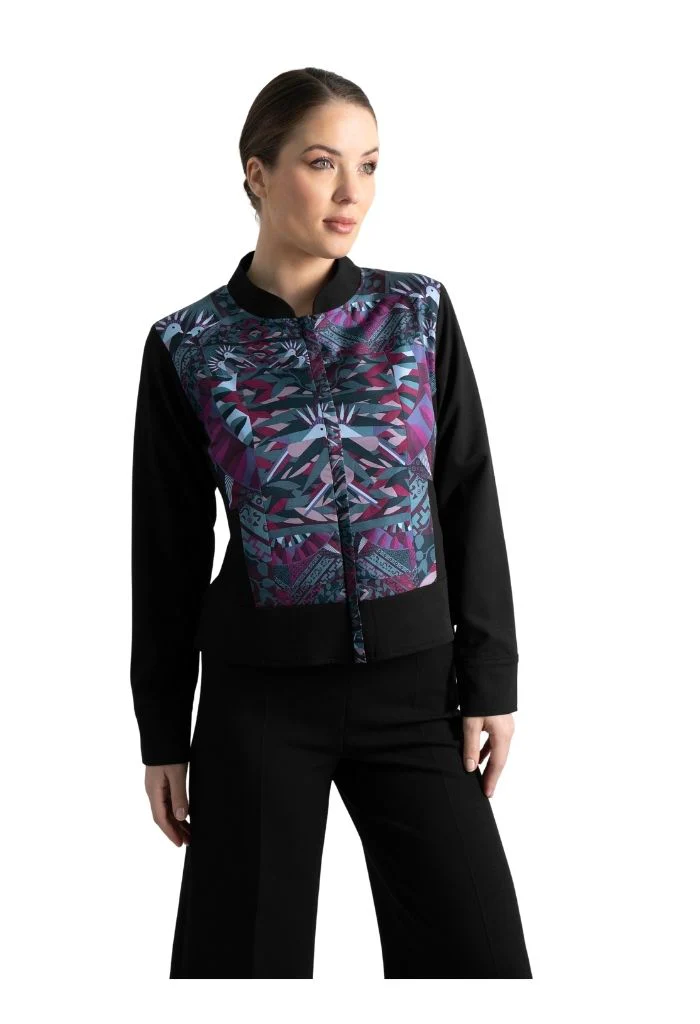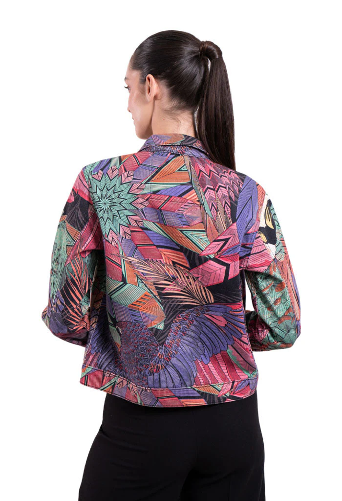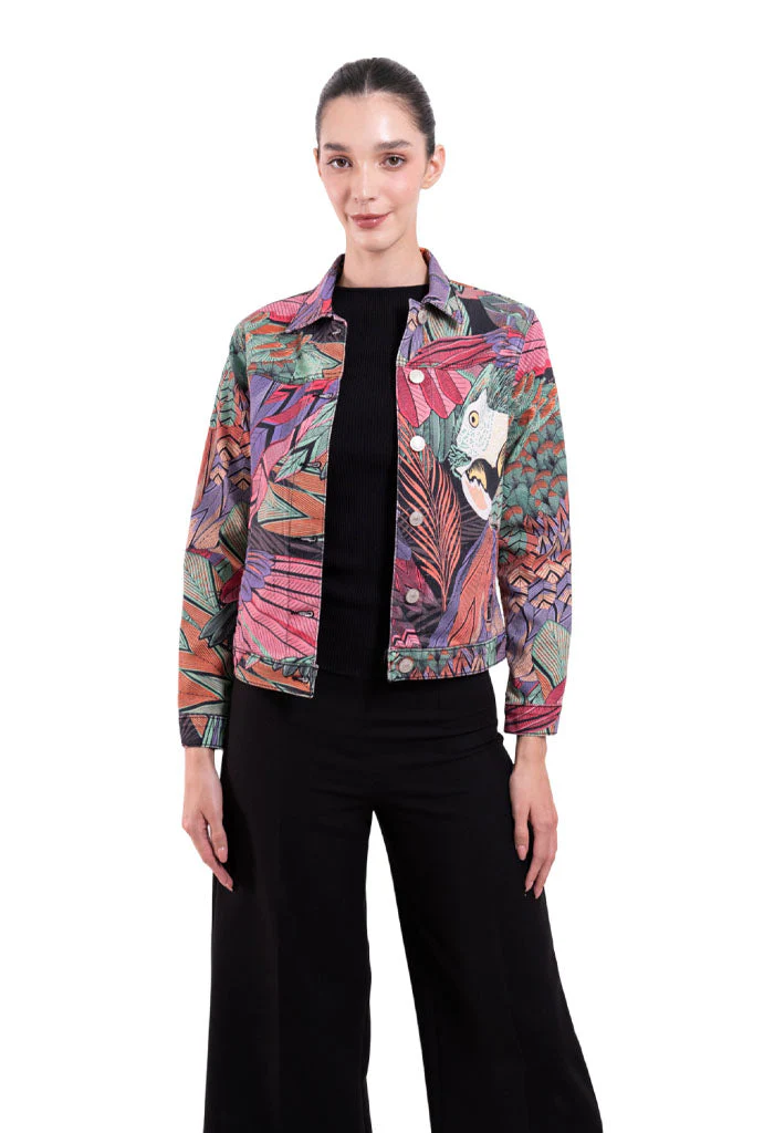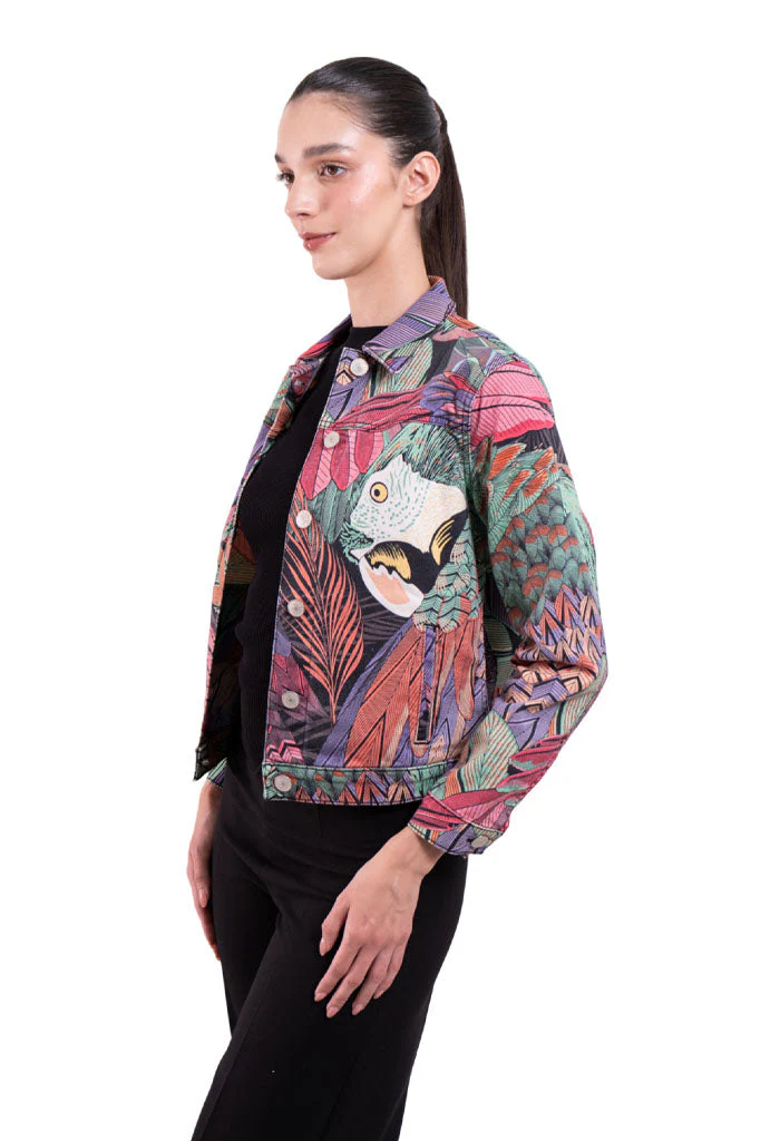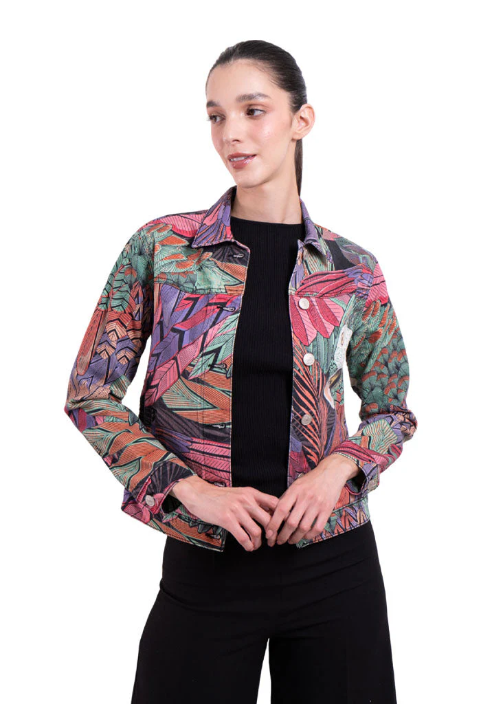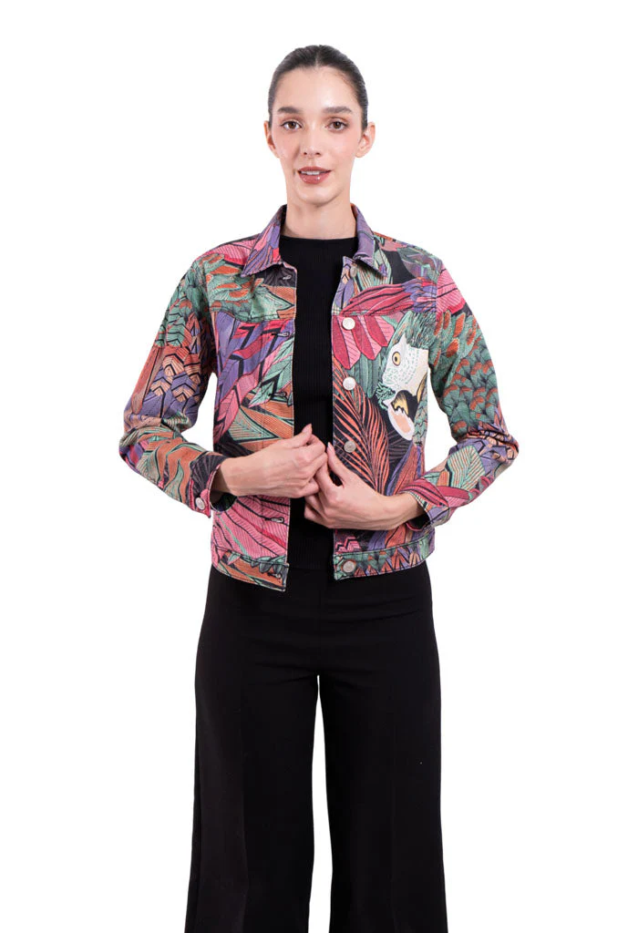Chamarra en corte clásico para mujer, bolsillos en costados y bolsillos internos, manga larga con puños abotonados. Frente con botones completos y solapa.