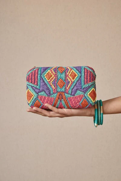 MATERIALES: Tejido gros grain bordado con rafia y resinas. Cadena de aluminio