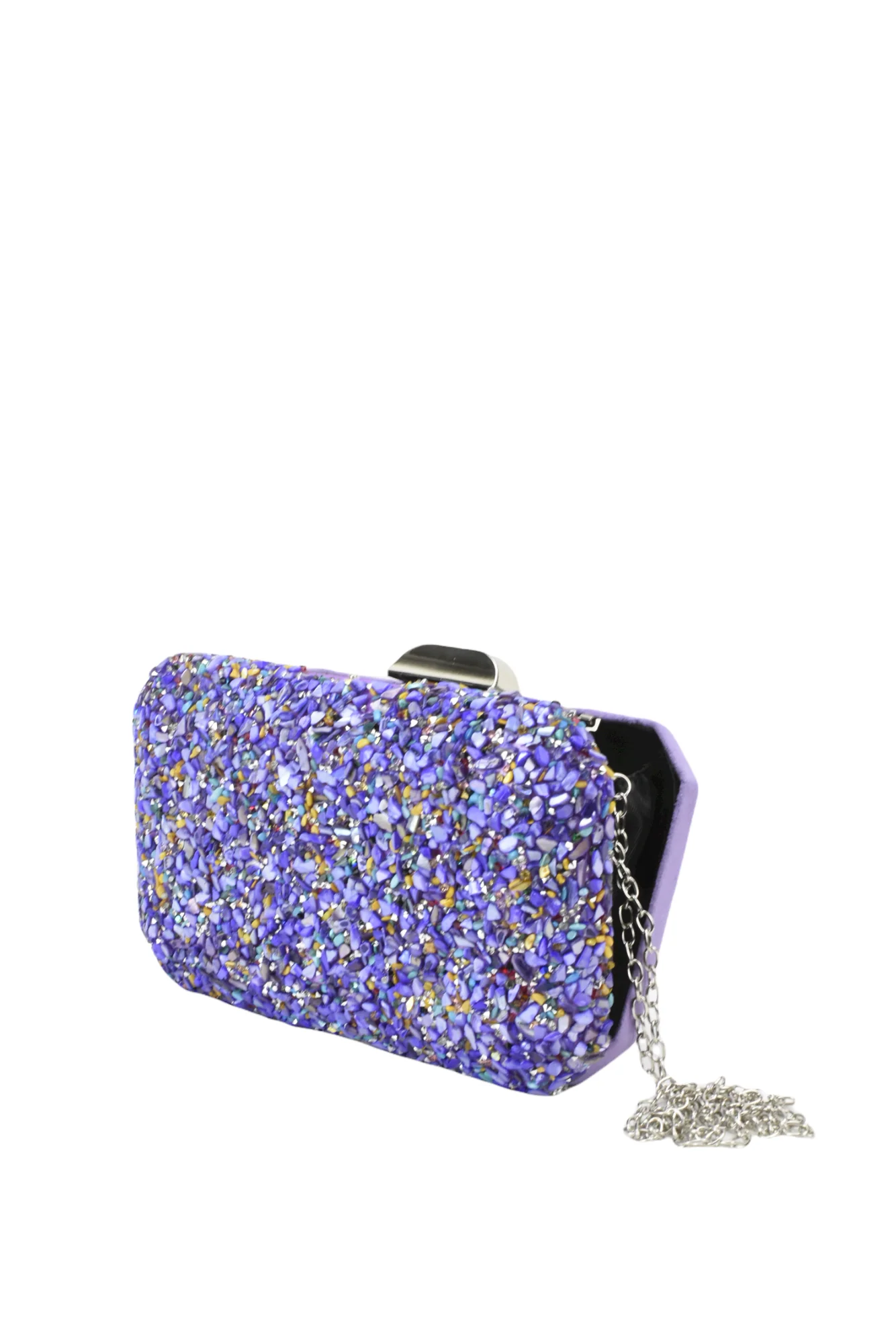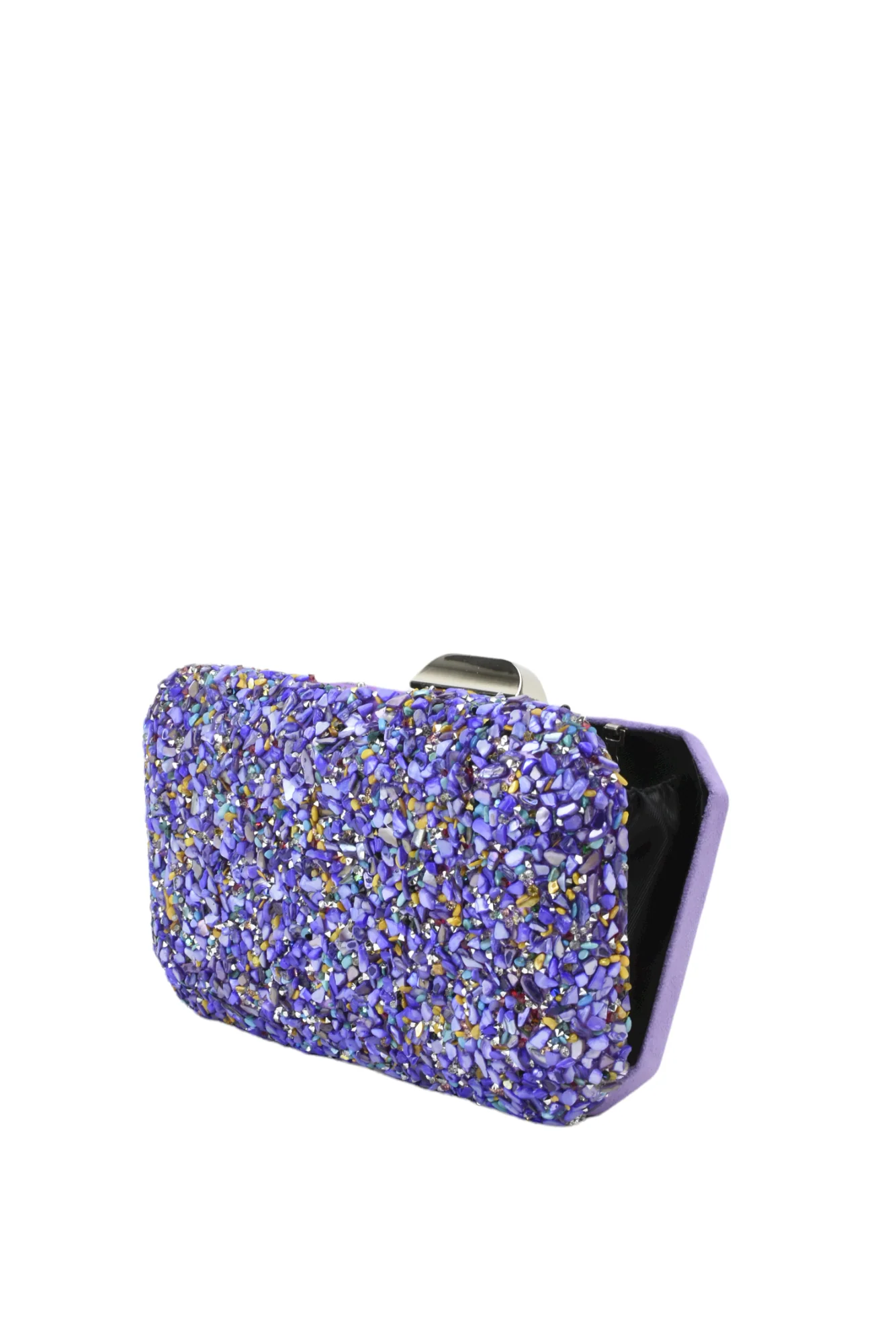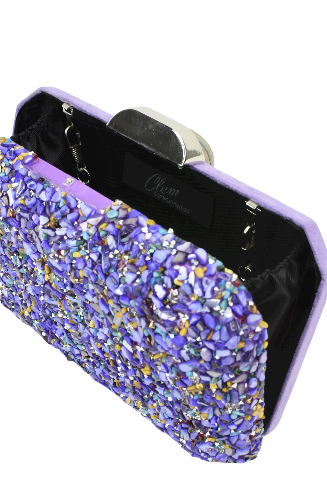 Clutch de pedrerÃa multicolor en parte delantera y tejido lila en parte trasera. Dispone de cadena en color plata para llevar colgado del hombro.