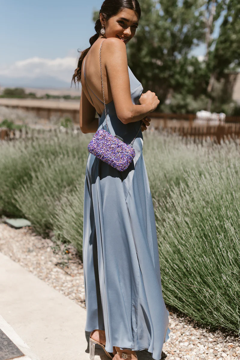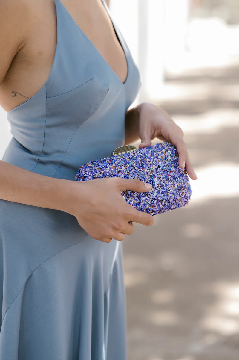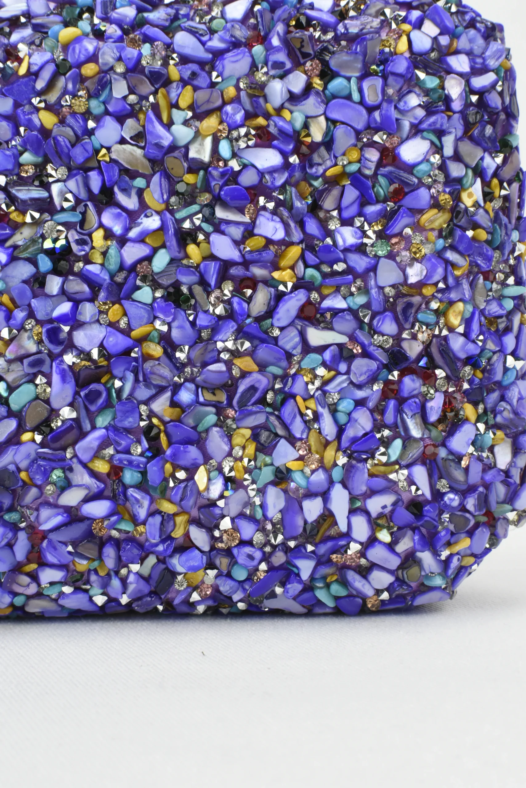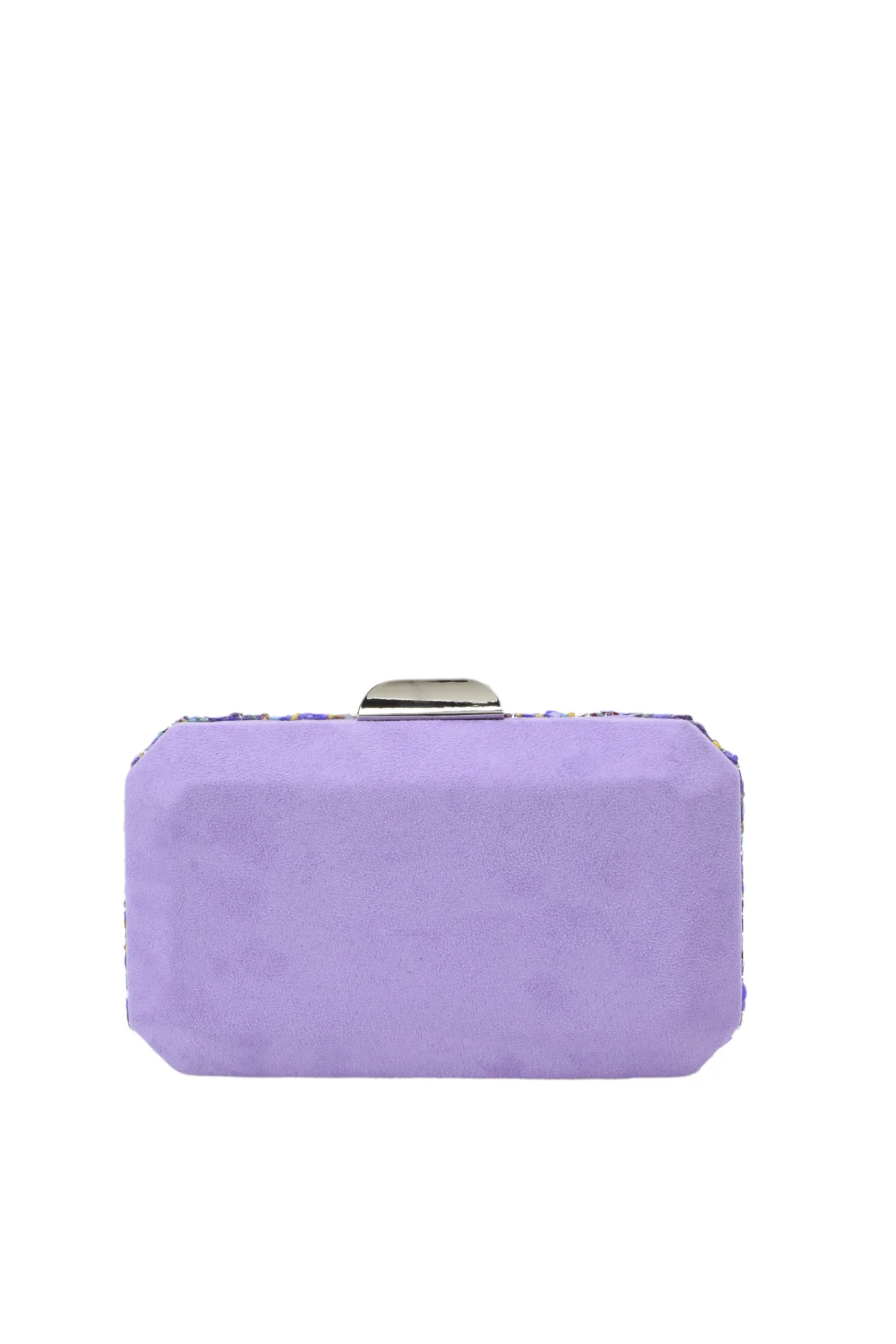 Clutch de pedrerÃa multicolor en parte delantera y tejido lila en parte trasera. Dispone de cadena en color plata para llevar colgado del hombro.